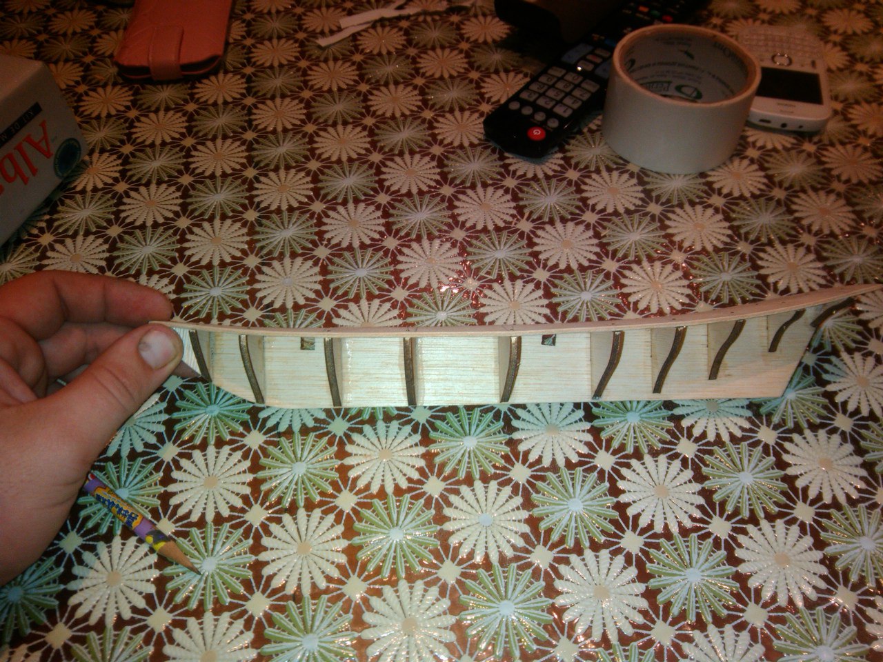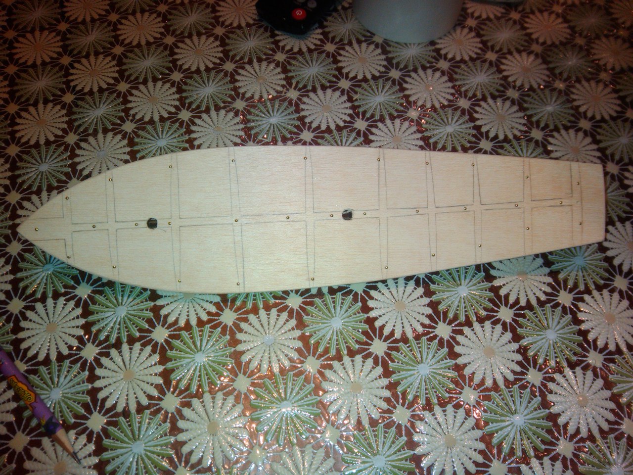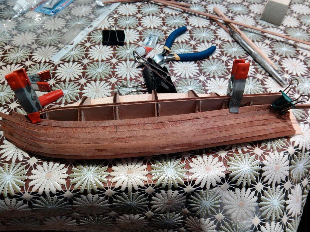 День второй. Начал нашивку реек обшивки. Клеил на цианитный клей (секундный). Рейки предварительно пропаривал секунд 10-15 над чайником, ложились хорошо. Начинал от палубы. Сам лист палубы оставил открытым ,но ближе к носу за два шпангоута реку наклеил на палубу. Рейки не подрезал (может быть в этом моя ошибка). На корме рейки легли более менее нормально.