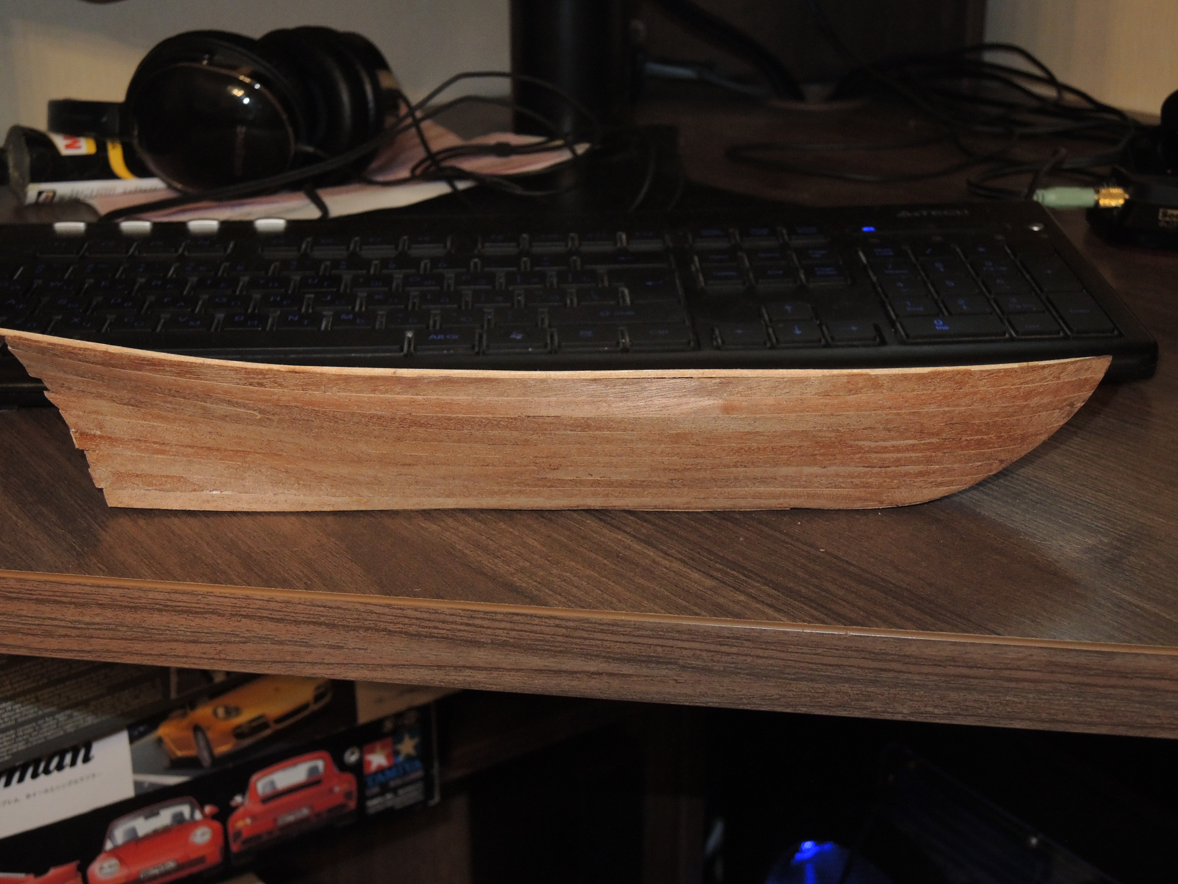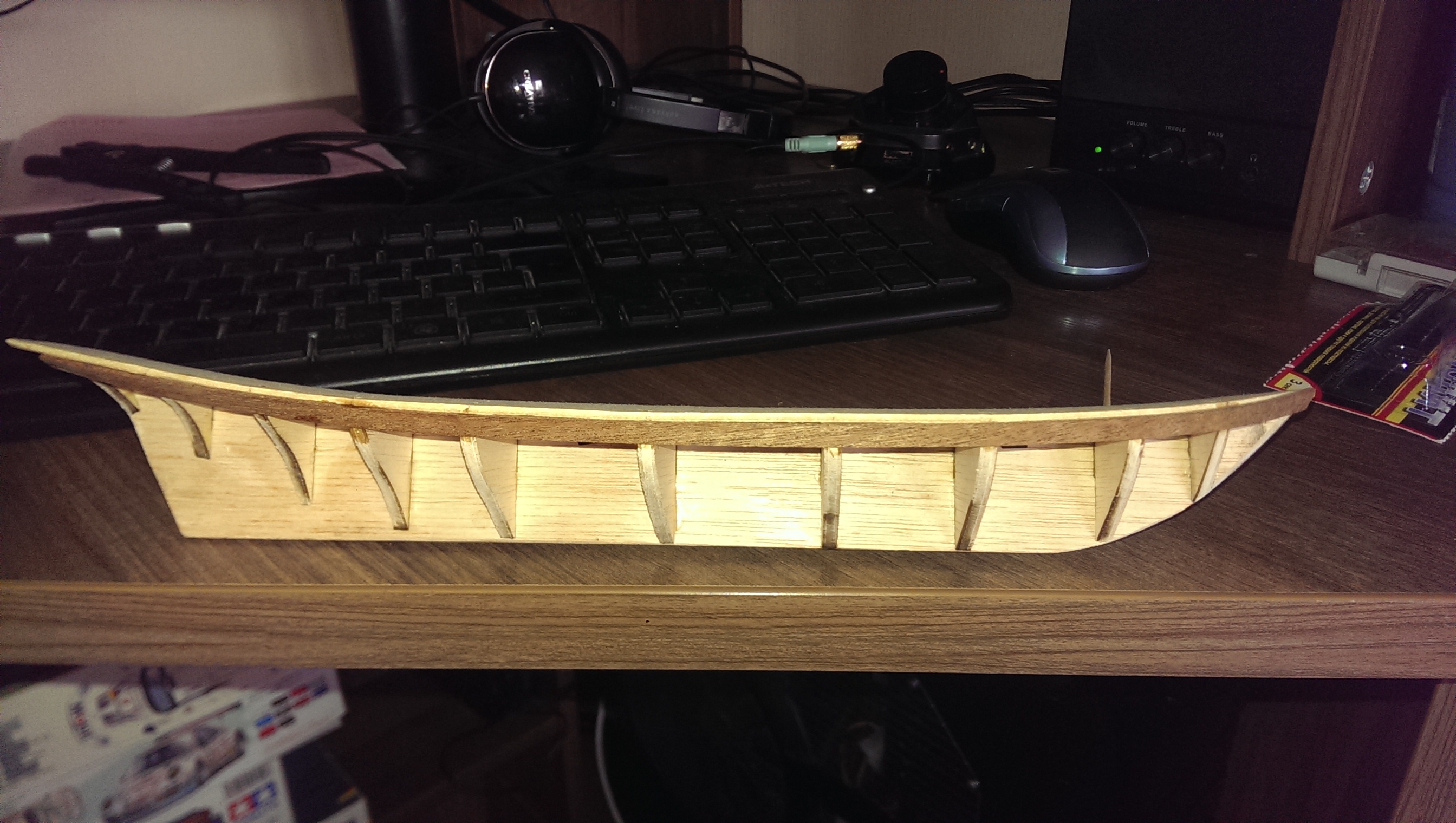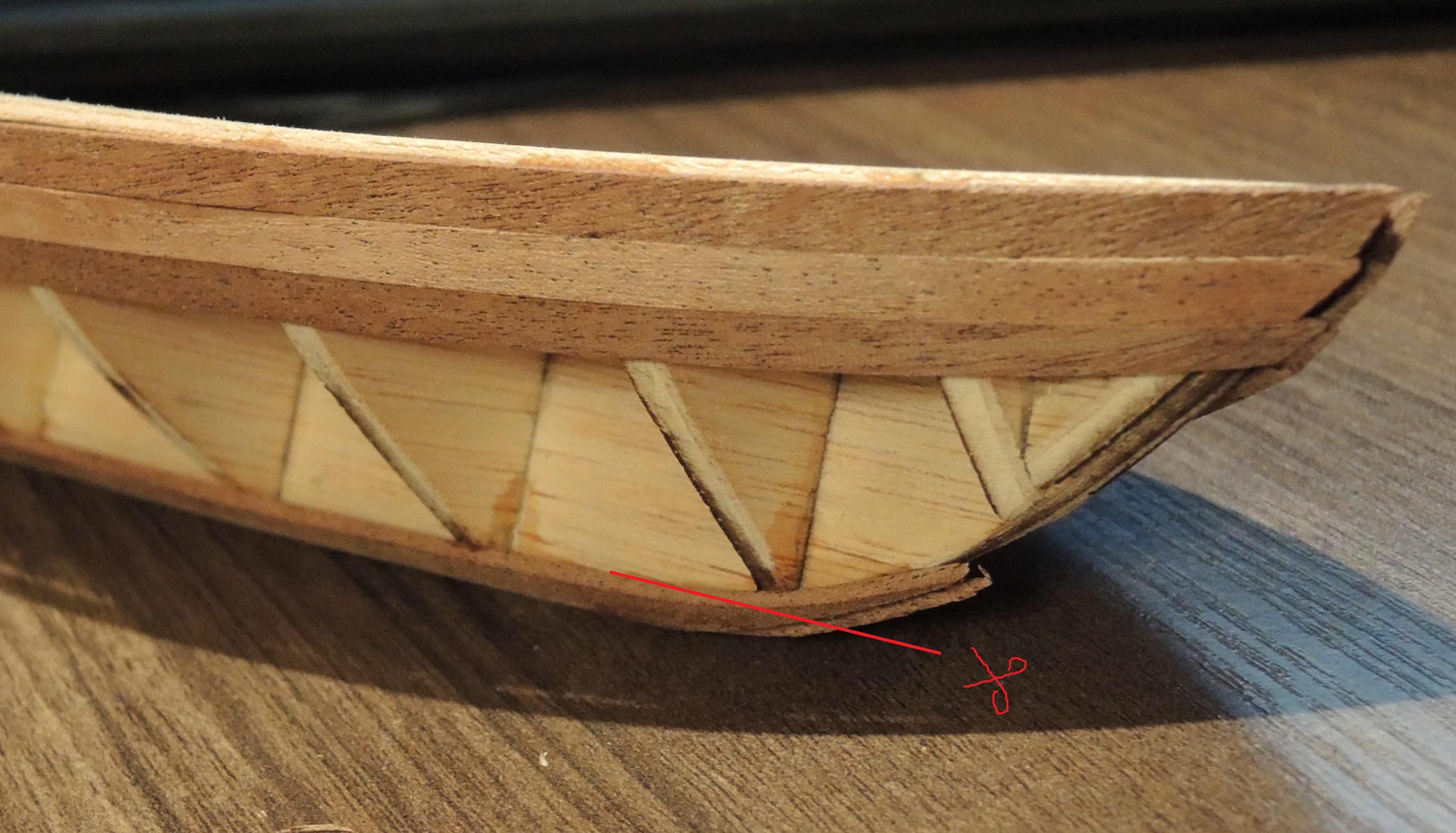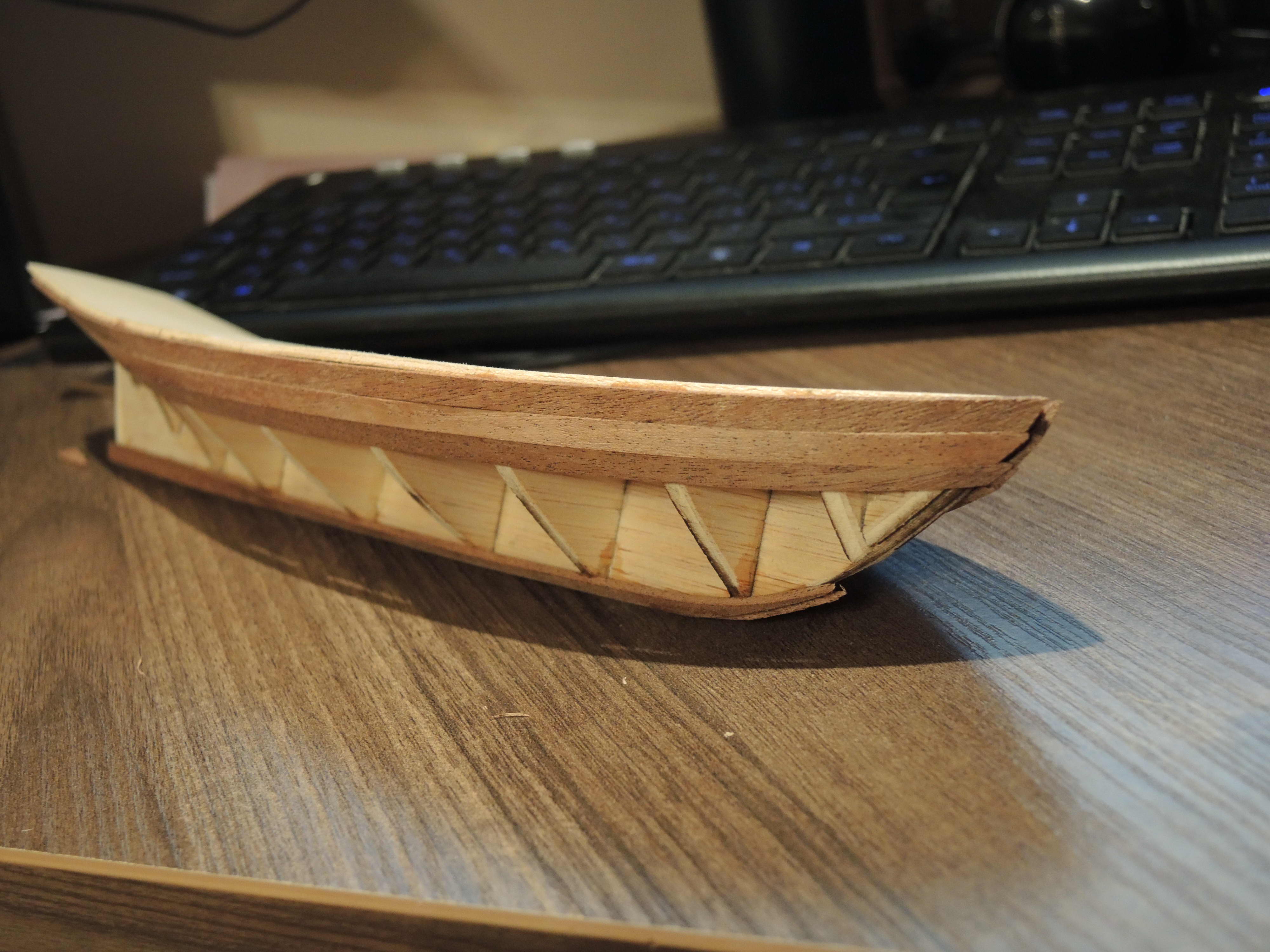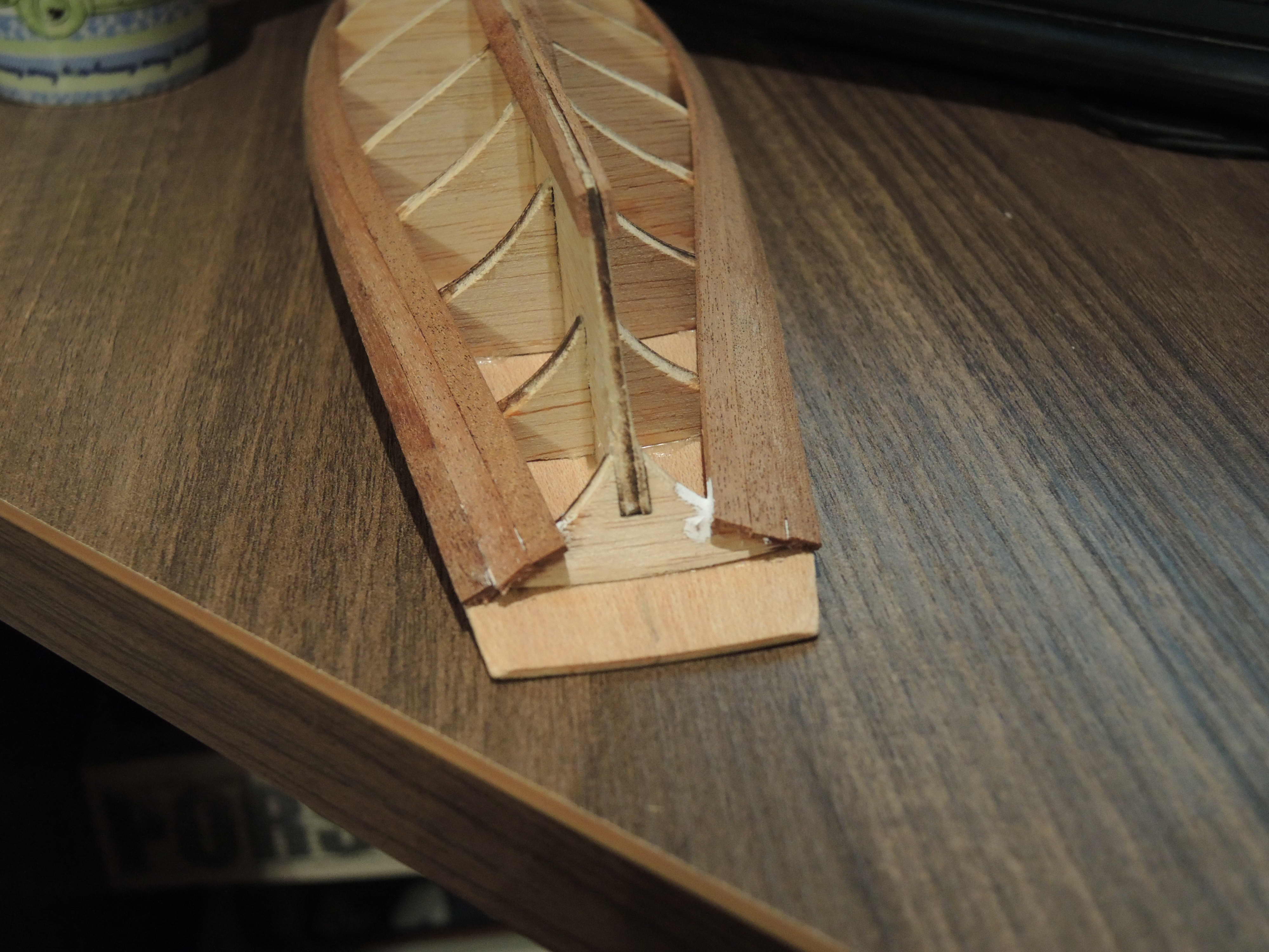 Благодарю за совет. "лыжи" делал на глаз, начитавшись, что нижние рейки должны раньше заканчиваться, не доходя до передней части киля (форштевень, правильно???). Видимо не достаточно рано.
