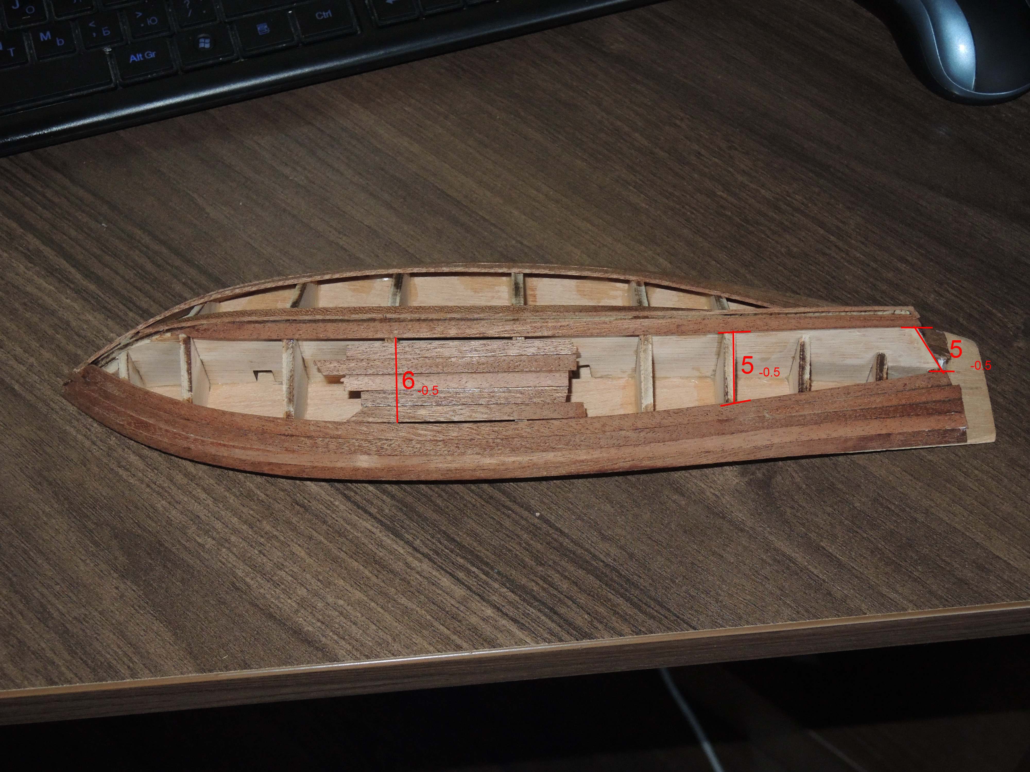 Не знаю как сделать... Пока писал, подумал, что может между 5м и 6м шпангоутом (если считать с носа) сделать потеряй (две рейки в одну)? Если это в корне не верно, то подскажите как лучше, желательно с эскизом.