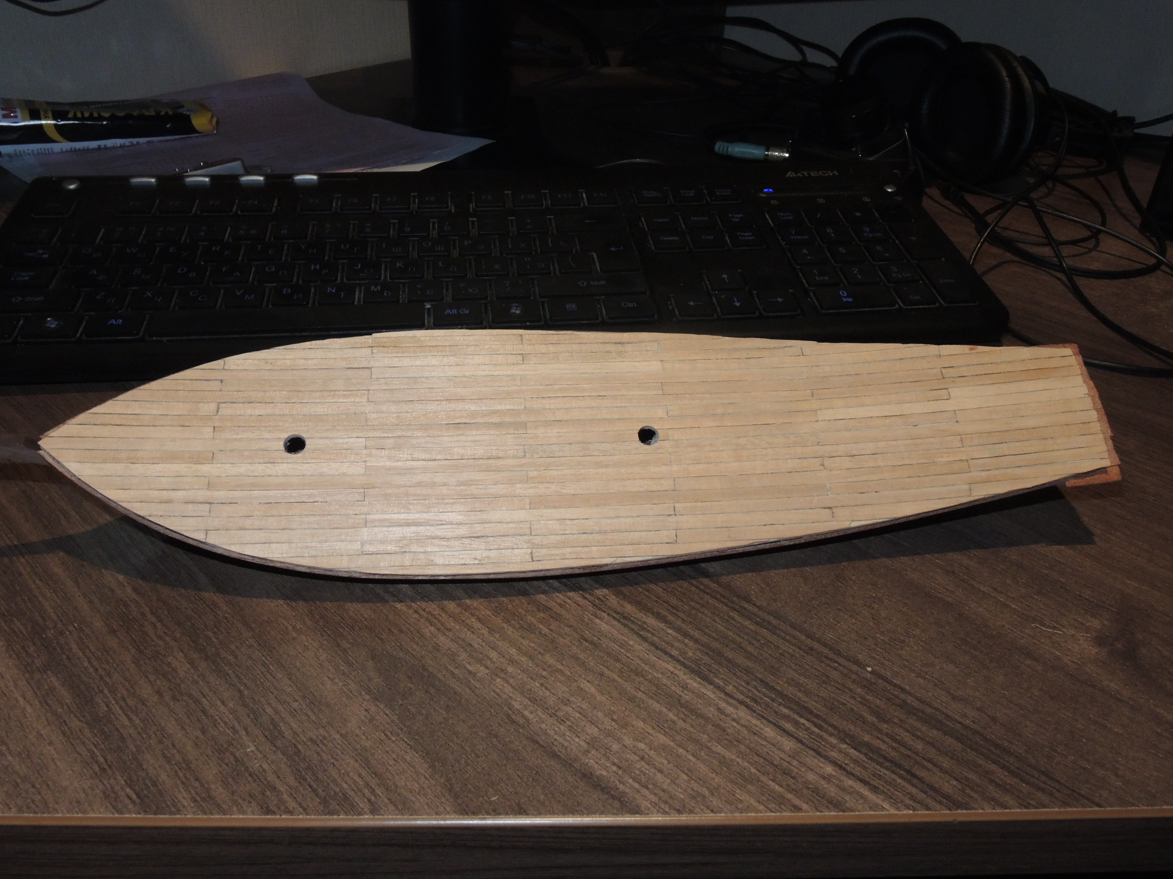 2. Настил нижней части корпуса - думаю теперь приклеить самую нижнюю доску, а потом между верхней и нижней размещать обшивку с изгибанием и подгонкой ширины реек...