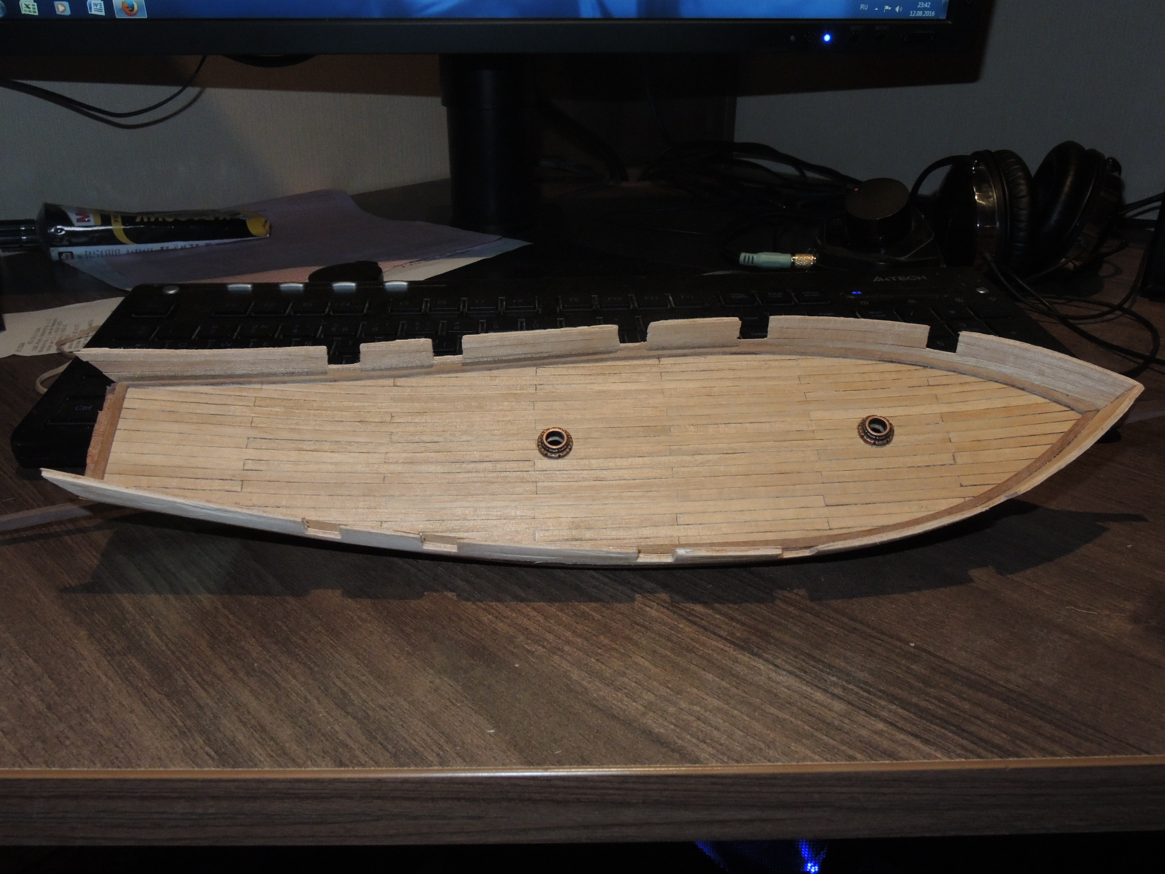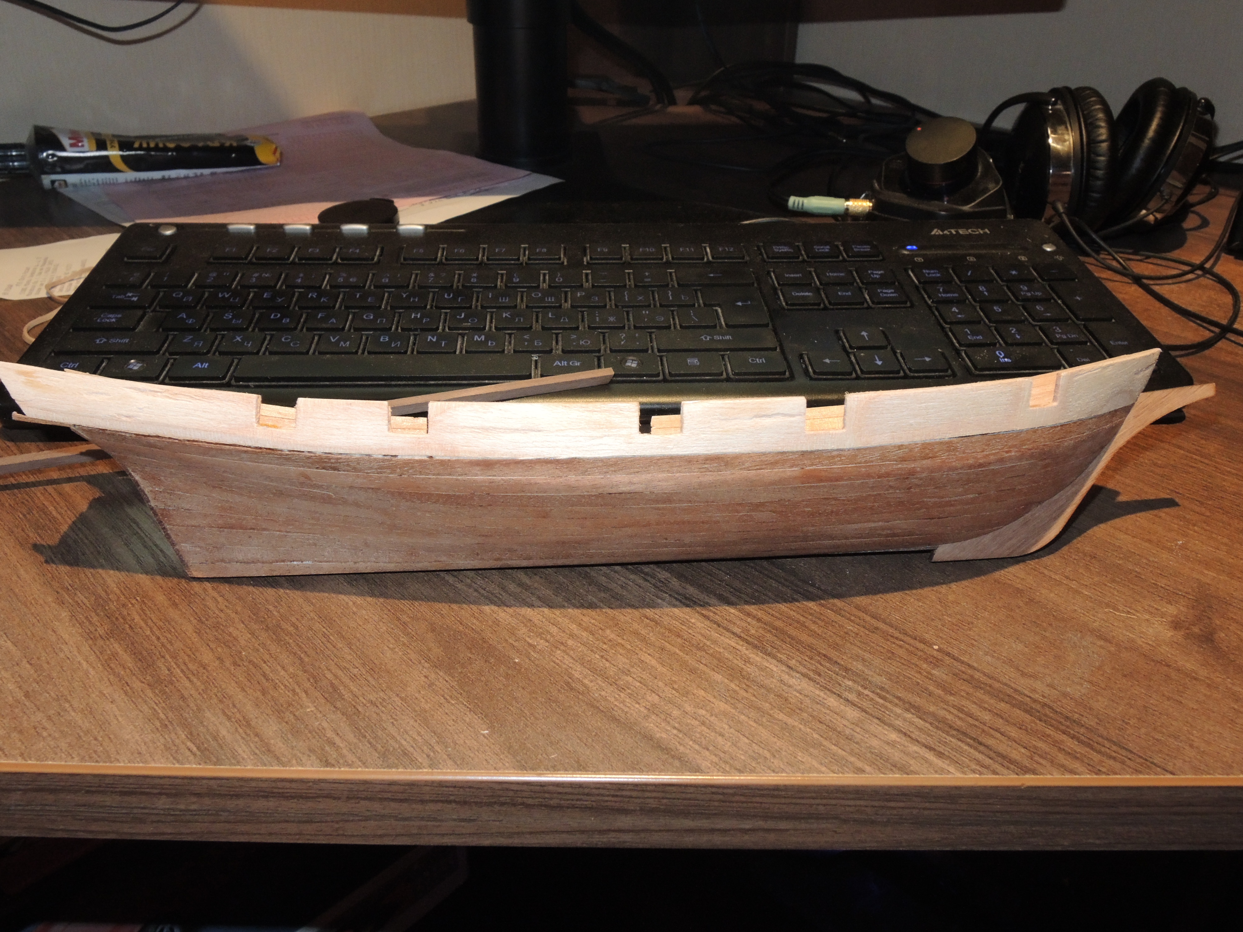 По вашему совету, нижнюю планку я убрал. Вставку пришлось сделать только в середине корпуса у самого киля, и ее там видно не будет. Огрехов много: от небольших зазоров до несоосности нижних поясов обшивки у фортштевня. Мелкие щели должны скрыться ПВА и пылью при шлифовке. Завтра куплю наждачную бумагу и зашлифую корпус. Затем палуба.