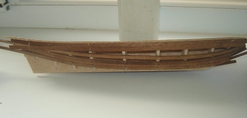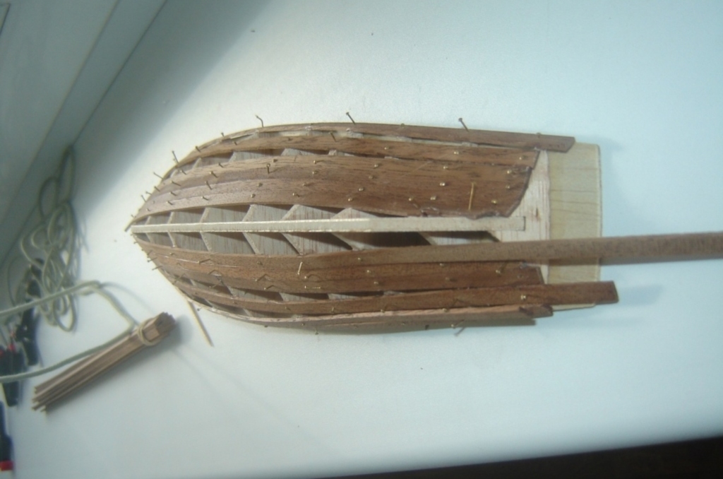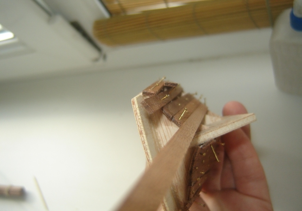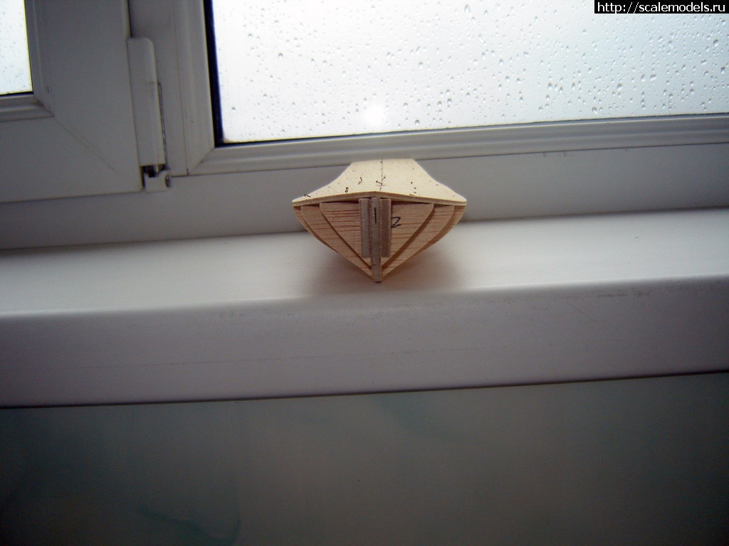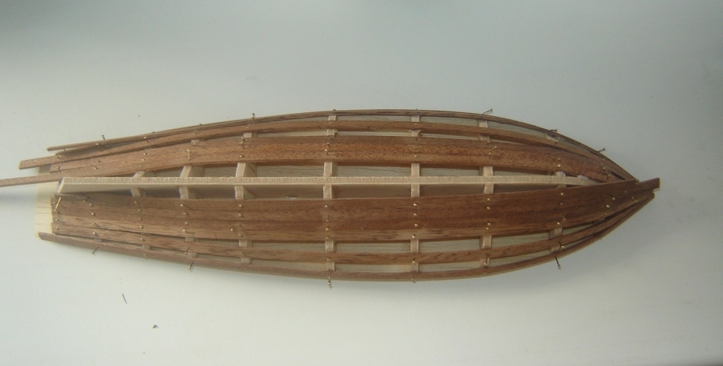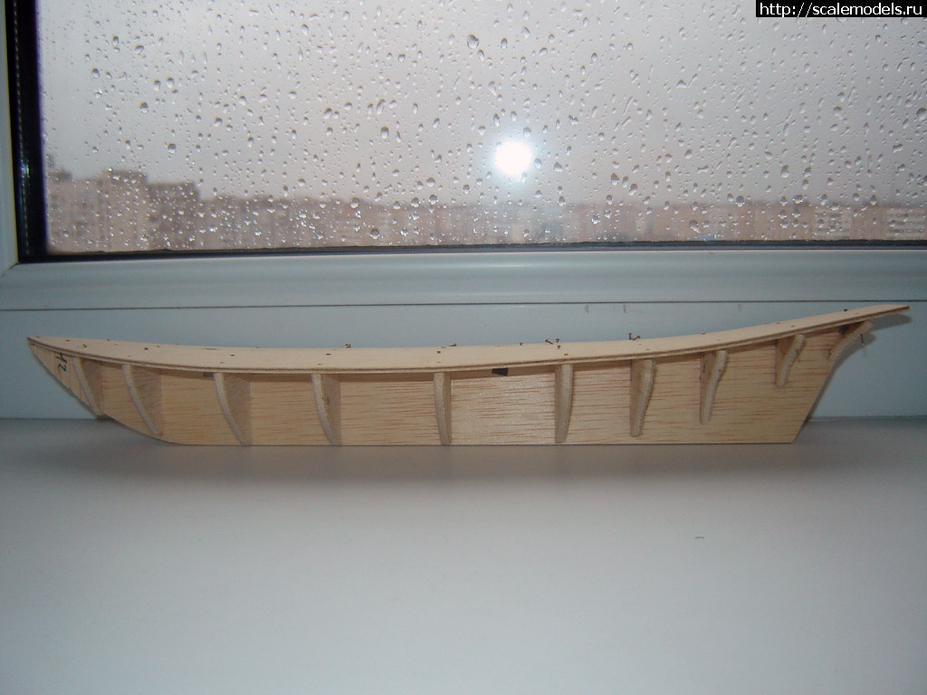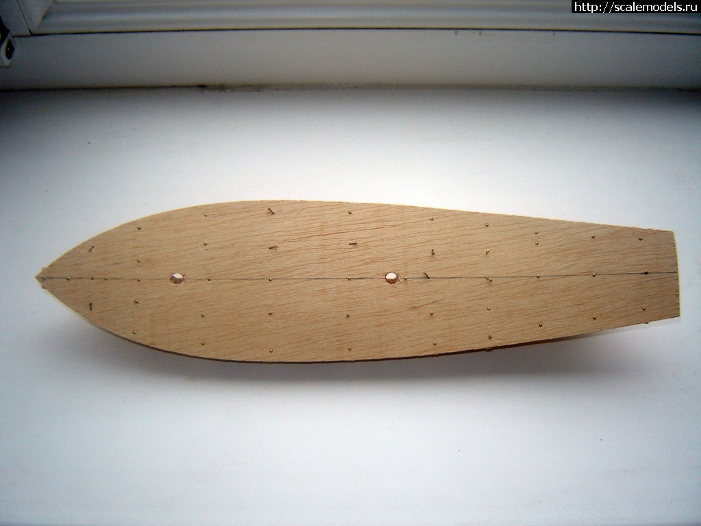 после долгого лежания в коробке фанерки немного погнулись, пришлось их немного подержать над паром и положить под пресс. потом склеил каркас и палубу, при этом еще и прибил ее гвоздиками (сразу вопрос надо ли их убирать или оставить так как есть только утопит заподлицо?)