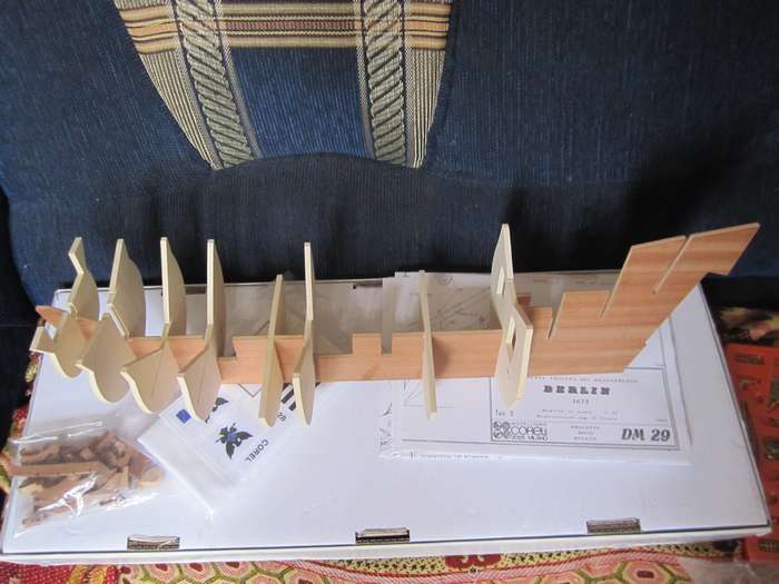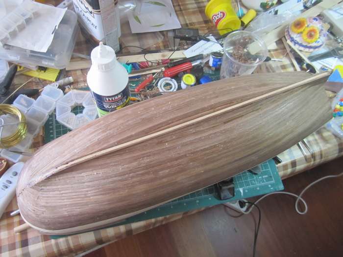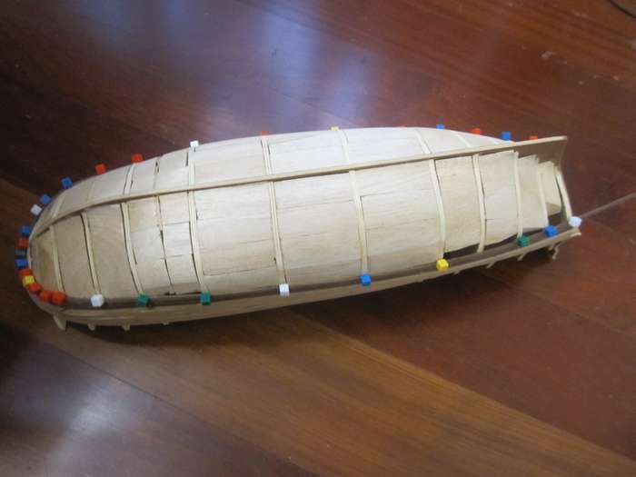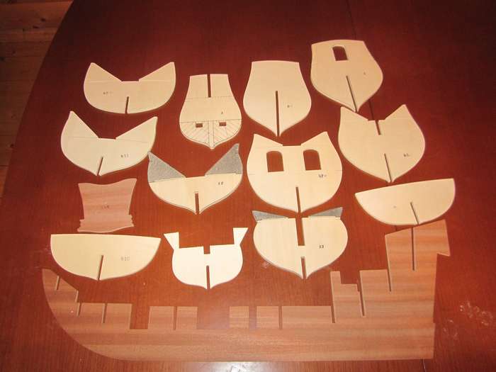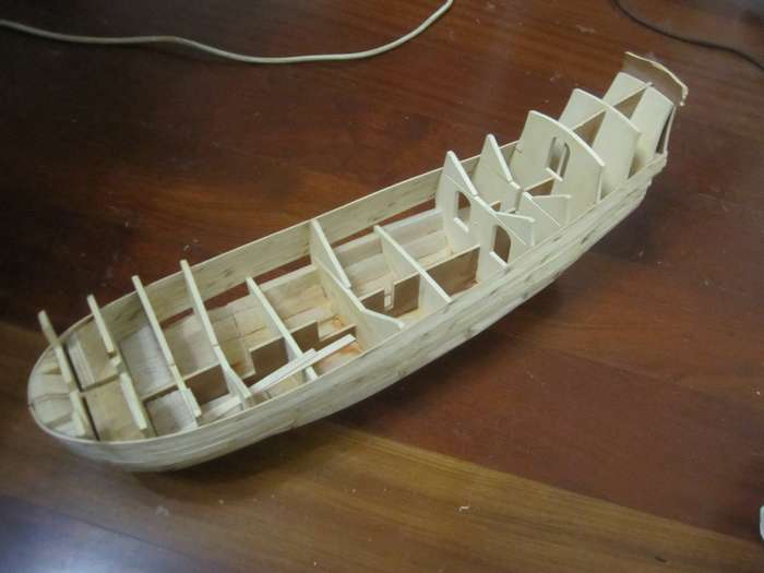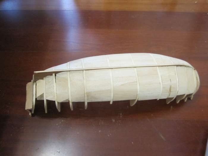 Собираем каркас. Прорези под шпангоуты меньше по толщине чем сами шпангоуты, пришлось растачивать. После сборки каркаса шпации заполнил бальзой.