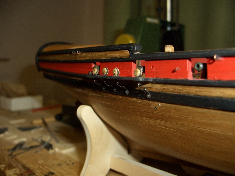 Полученные бруски были обработаны в тисках, губки которых играли роль шаблона. При сборке вантпутенсов оказалось, что штатные звенья, соединяющие нижние и верхние эл-ты под русленями, оказались коротки для установки. Можно было слегка подточить руслень, но т.к. эти хомутки выглядели сильно переразмеренными, я решил изготовить их самостоятельно. Результат см. на фото.