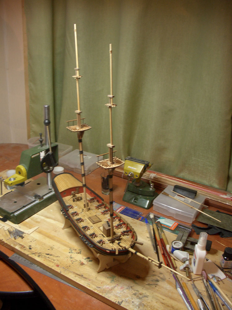 Закончил мачты. Сомневался, стоит ли окрашивать черной краской топы и марсы. Все элементы под окраску - из ореха и достаточно контрастируют с березовыми мачтовыми колоннами.