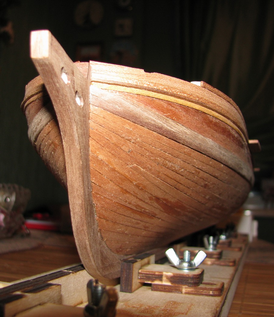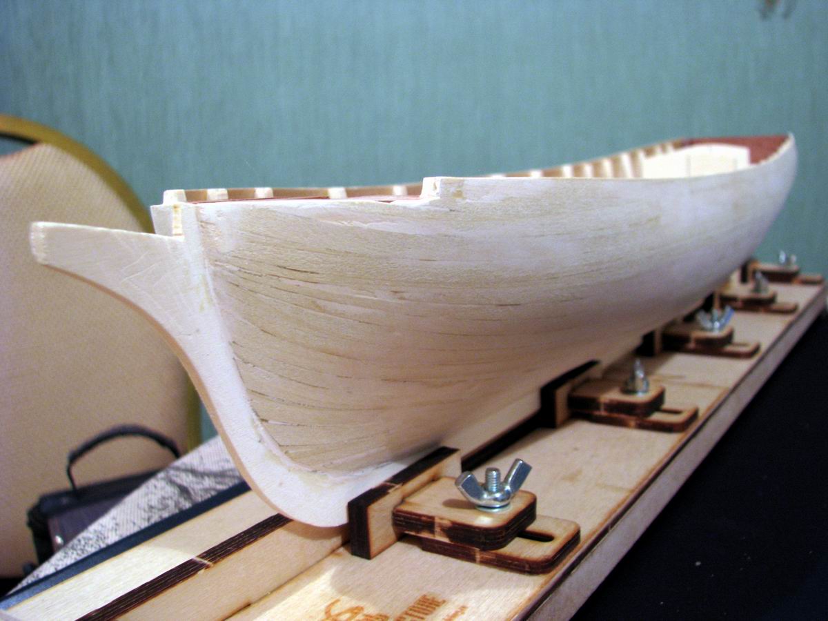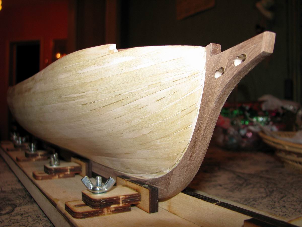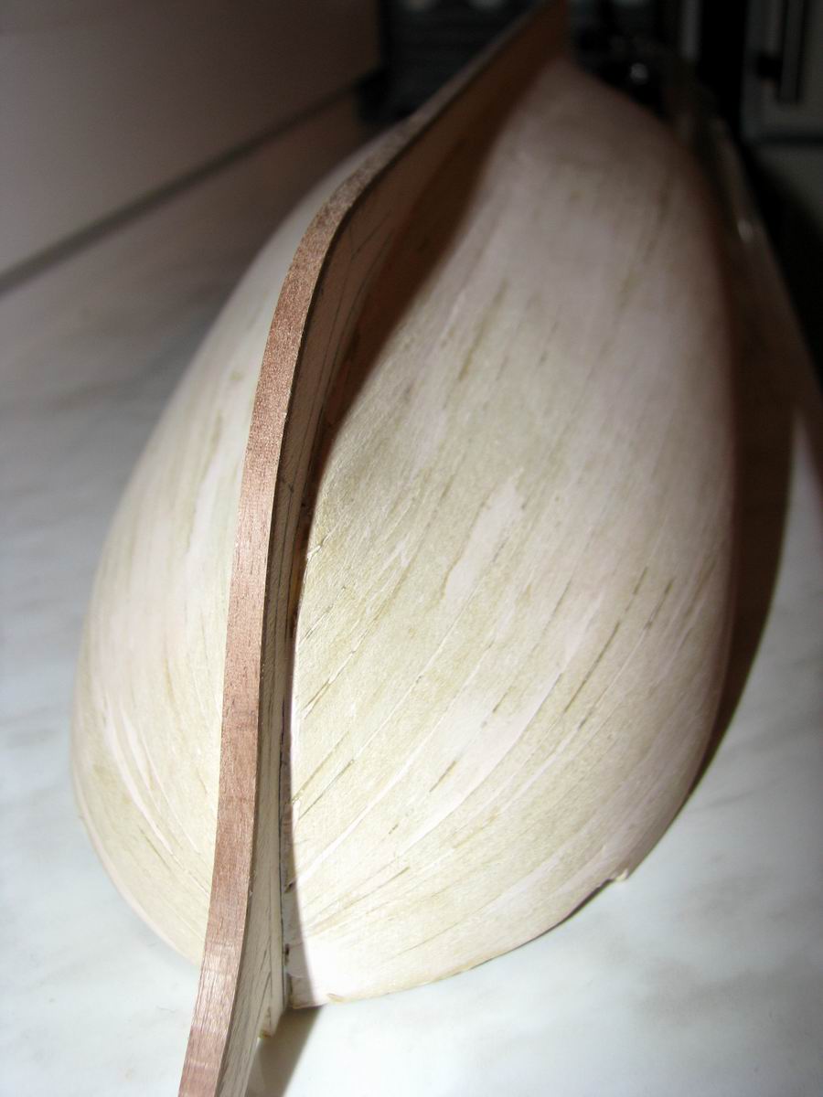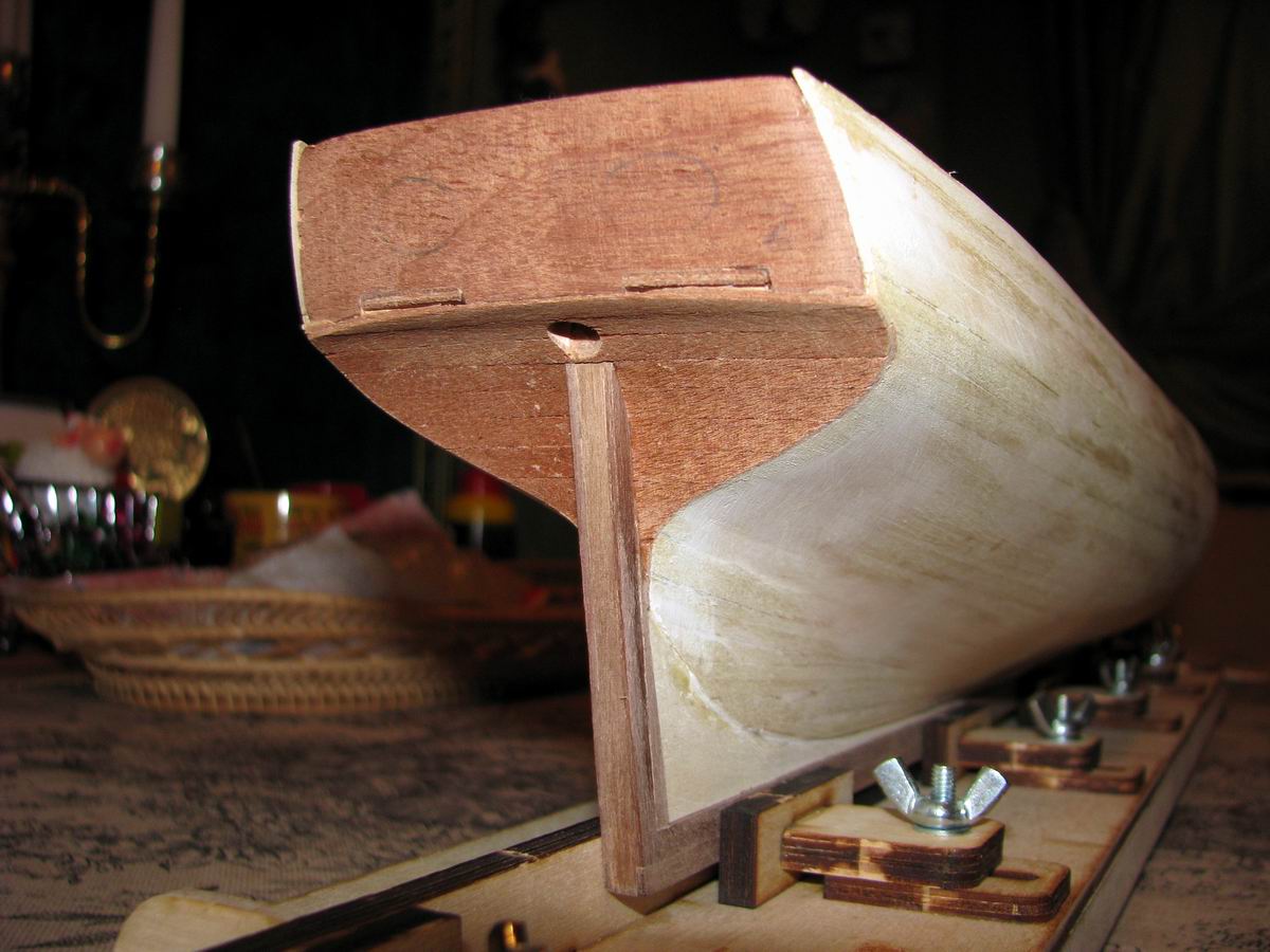 У меня сначала была мысль о заполнении носовых и кормовых шпаций, но потом посмотрел - корпус у шхуны не такой уж и сложный, опыт кой-какой имеется, рейки гнутся прекрасно с помощью специальной технологической оснастки под названием "утюг электрический бытовой"... и решил не тратить время на поиски заполнителя.