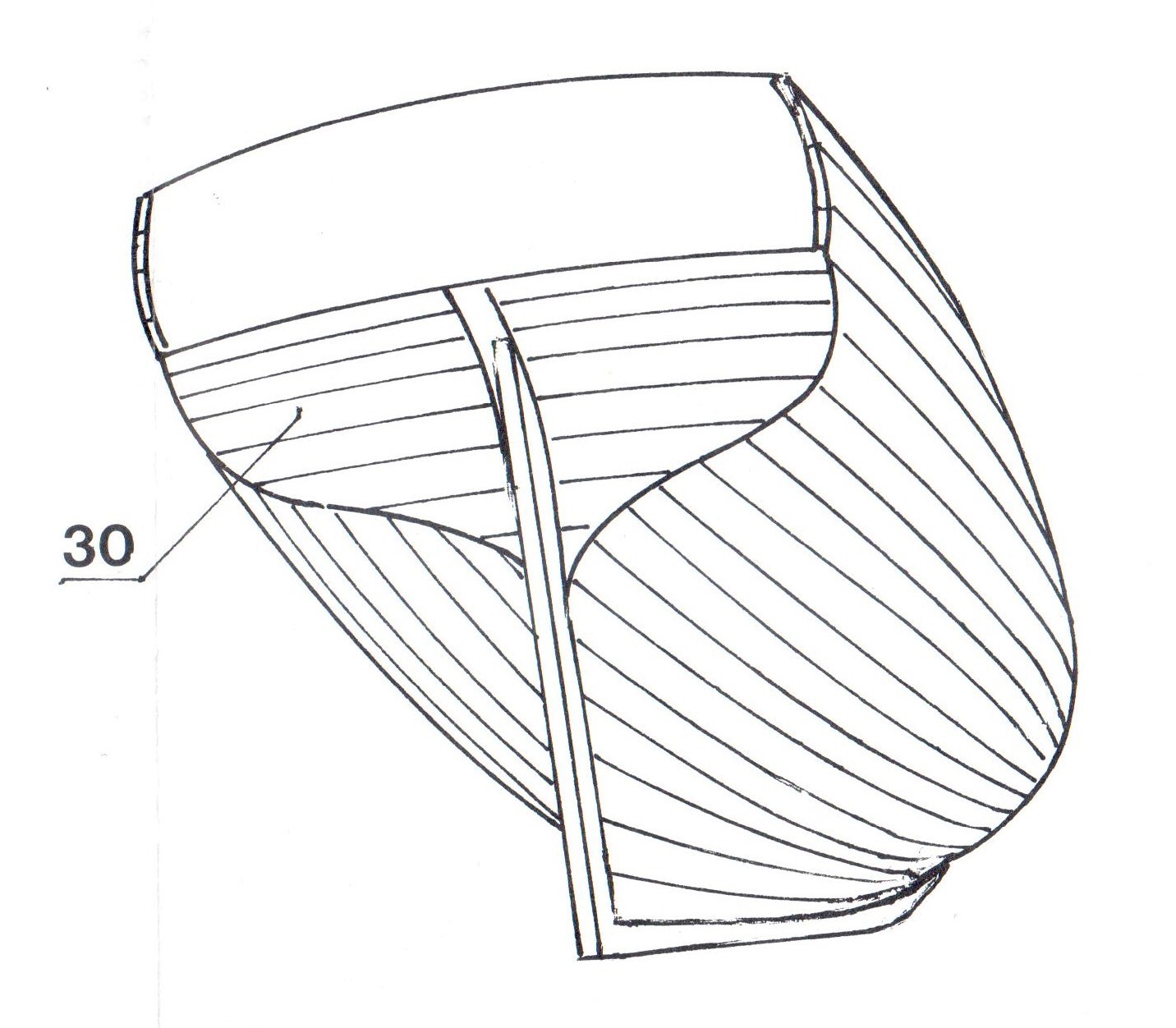 Кстати, на фото отмечены те самые "детали № 28" или "фальш-шпангоуты", которые необходимо вклеить в транец до монтажа черновой обшивки.