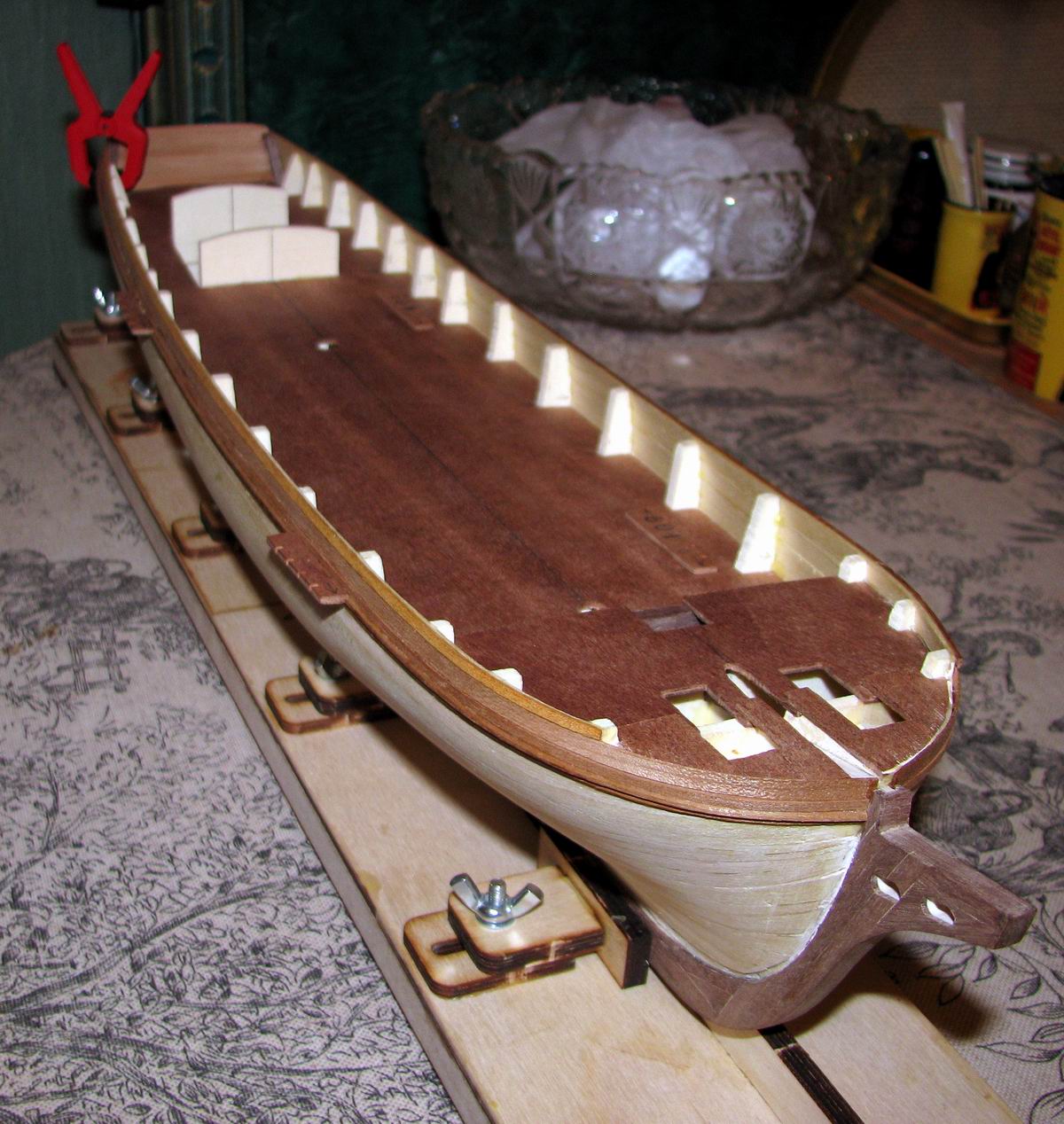 Перед настилом палубы Мамоли рекомендует сначала срезать четные шпангоуты и вклеить вместо них (а где-то и не вместо, а чаще) "фальш-шпангоуты", изготовленные из рейки 4х4, которые в дальнейшем будут являться станинами под бортовые пушки. Далее ту же операцию надо проделать с нечетными шпангоутами. А борт изнутри просто покрасить акварельной краской "под орех"...
