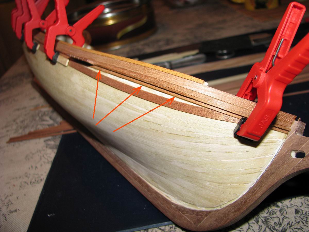 Если класть свободно, без напряжения, как у меня показано на фото, то получается заужение планок к носу (что, в принципе, правильно), но появляется полоса, в которую надо вставлять клин (на фото показано стрелками). При этом бархоуты тоже, по идее, должны лечь с меньшим напряжением и подниматься к носу.