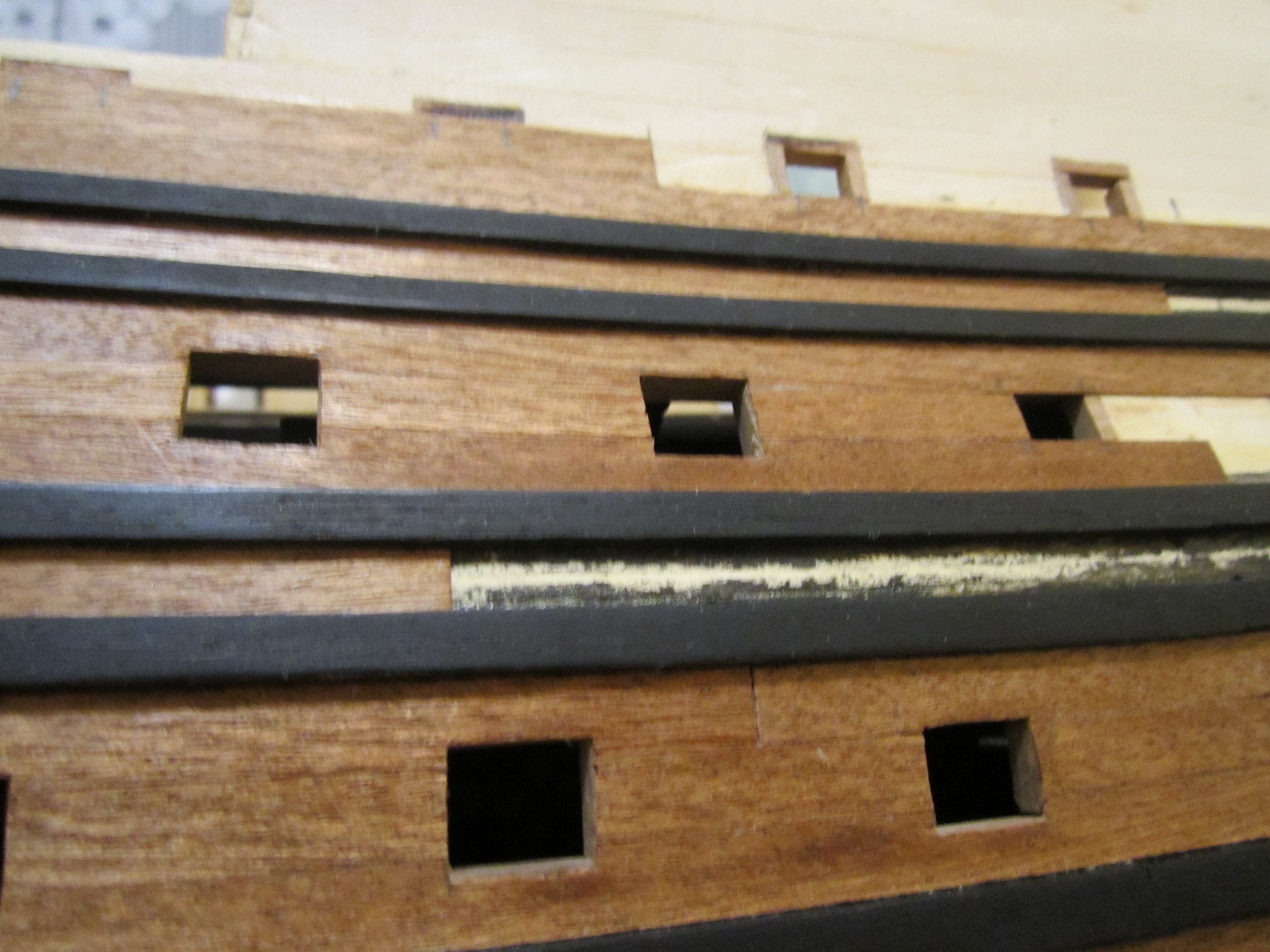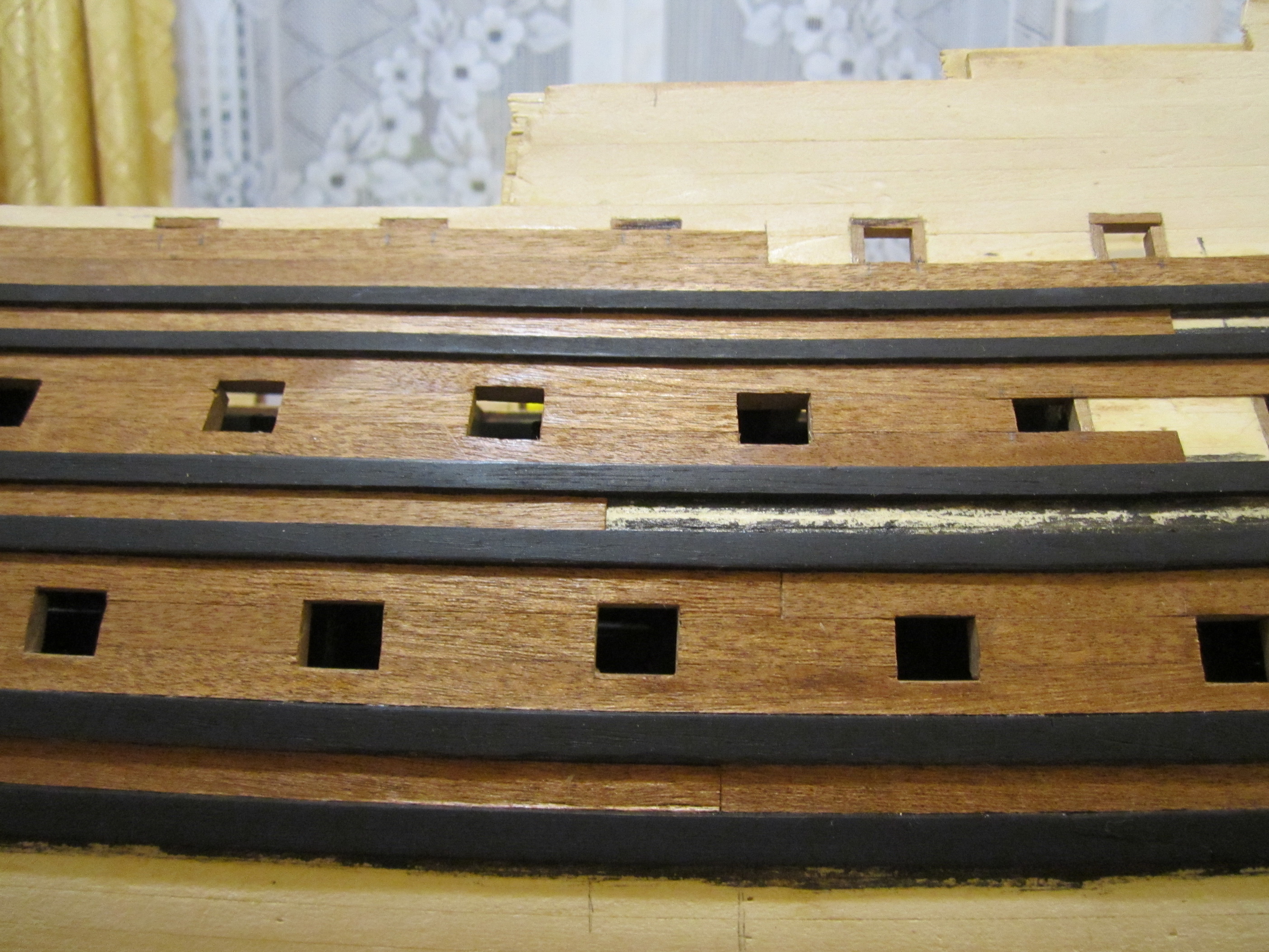 На вашем месте я-бы сначала приклеил бархоут.тем более если вы хотите его окрасить в чёрный цвет.Судя по чертежу бархоут состоит из двух реек.Заранее приготовьте их,прокрасьте тушью.Лучше перед этим предварительно замочив,загнув и высушив.Берёте отрезки реек которые пойдут между ширстреком и бархоутом.Контролируя это расстояние с помощью двух обрезков этих реек приклеиваете бархоут.А затем в этот получающийся промежуток вклеиваете две рейки обшивки.Я так делаю сейчас на Le Soleil Royal