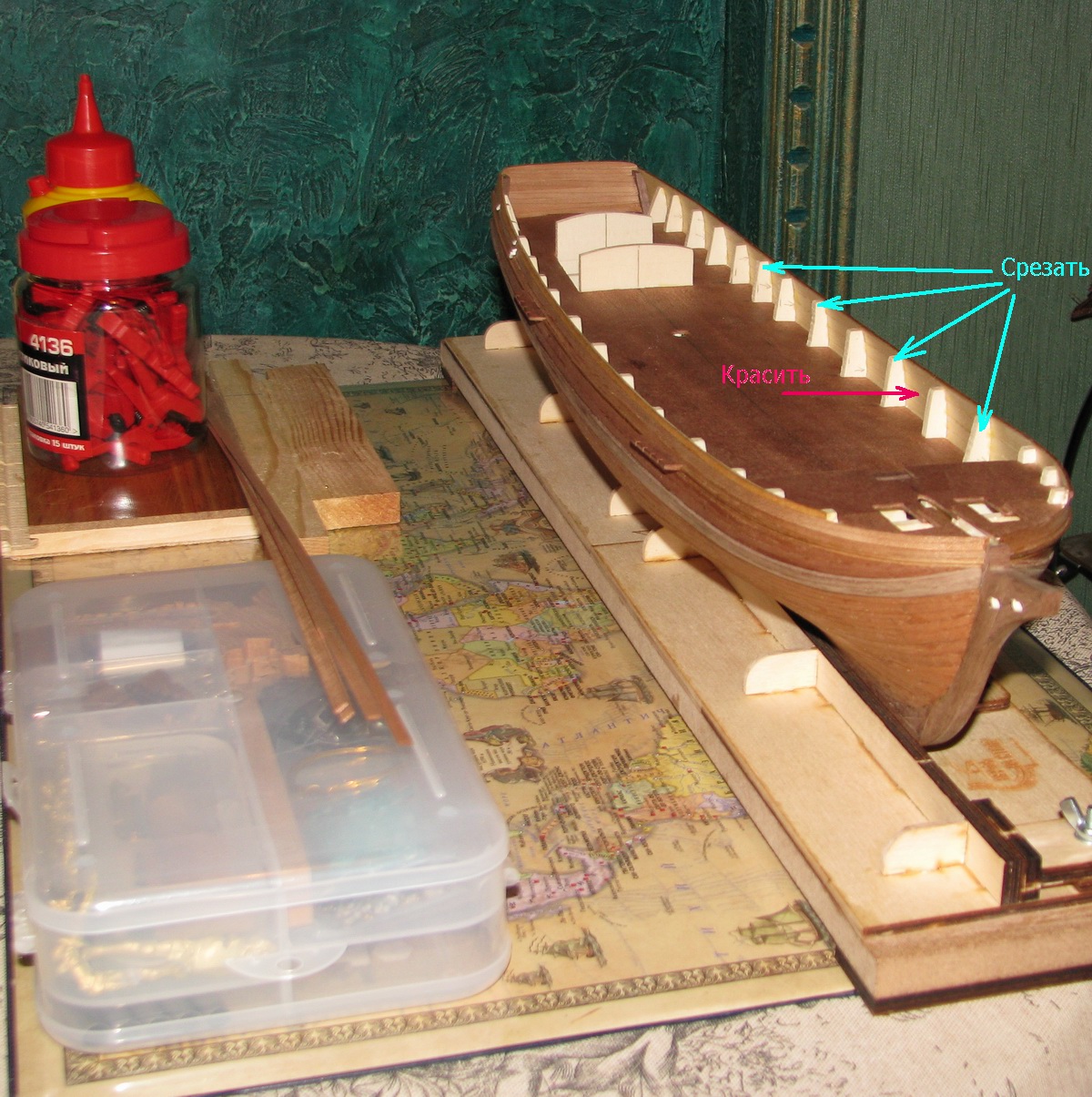Я, конечно, ужаснулся от такой мысли, представив себе покрашенный борт. Все-таки есть большое желание отделать фальшборт изнутри рейками вишни 0,5х4. Но для этого придется срезать все шпангоуты сразу, чтобы красиво положить рейки параллельно палубе. Вот и думаю: поведет борт при этом или нет, если срезать все шпангоуты разом? Делать временные подпорки или нет? И, кстати, почему-то у этого "парохода" не предусмотрено никаких шпигатов... Может масштаб мелковат?
