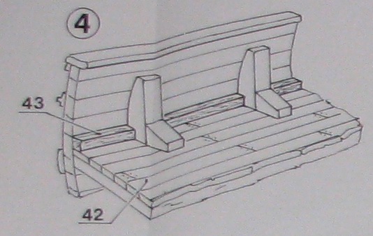 И еще пришел к какому выводу. Лучше сначала установить все детали 40 (фальшивые топтимберсы) с обоих бортов, а затем уже приклеивать детали 41, выравнивая их по линии между деталями 40 противоположных бортов.