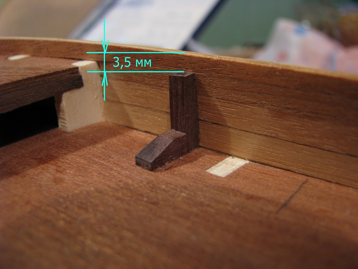 Теперь по планширю. При установке "фальшивых" топтимберсов (деталь 40) необходимо выдерживать расстояние от топа детали 40 до планширя зазор 3,5 мм. При уже установленном планшире это не совсем удобно. Поэтому детали 40 и 41 я ставил без установки планширя. Во-первых - исключено повреждение планширя, во-вторых - удобнее замерять расстояние от топа детали 40 до линии планширя.