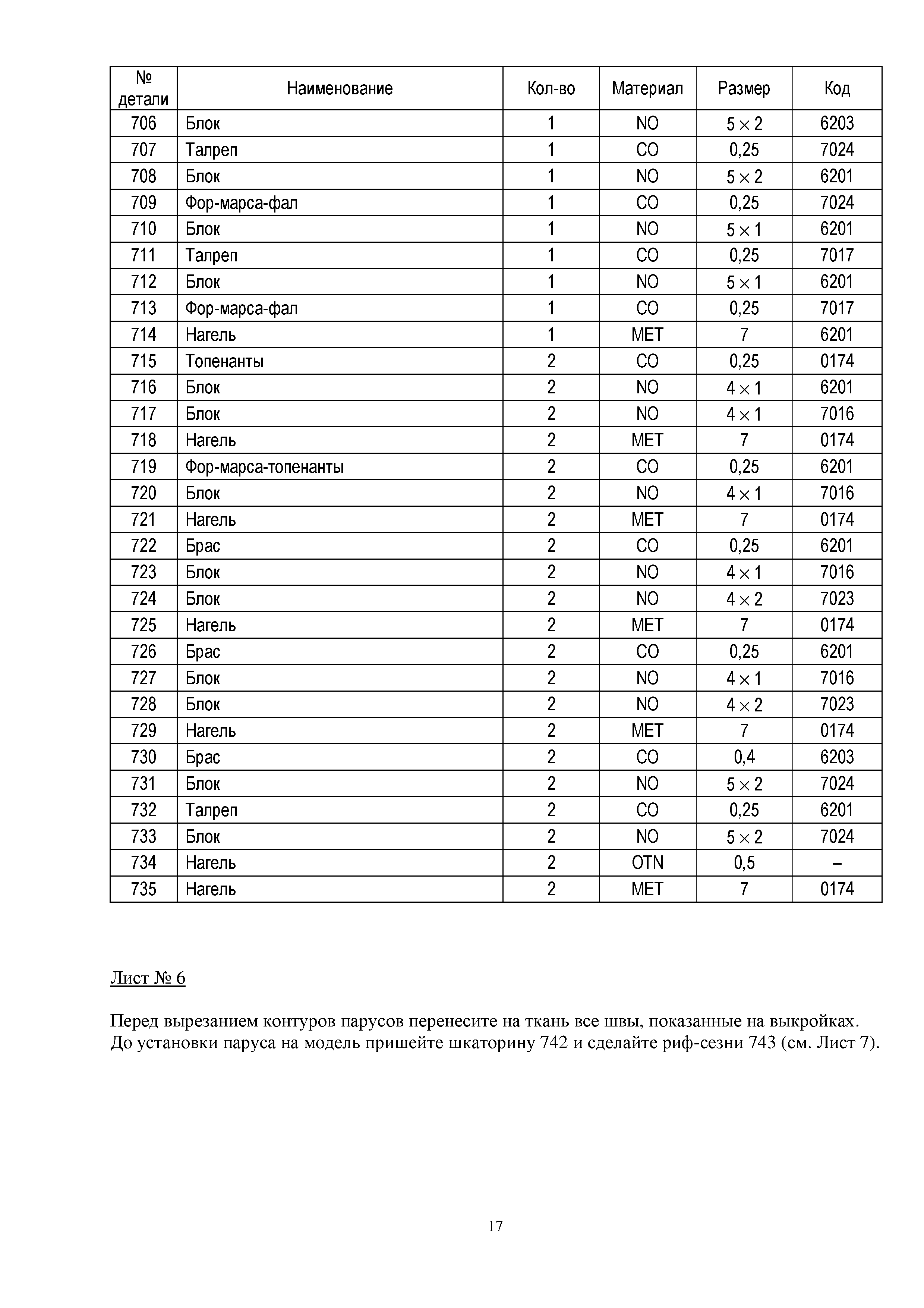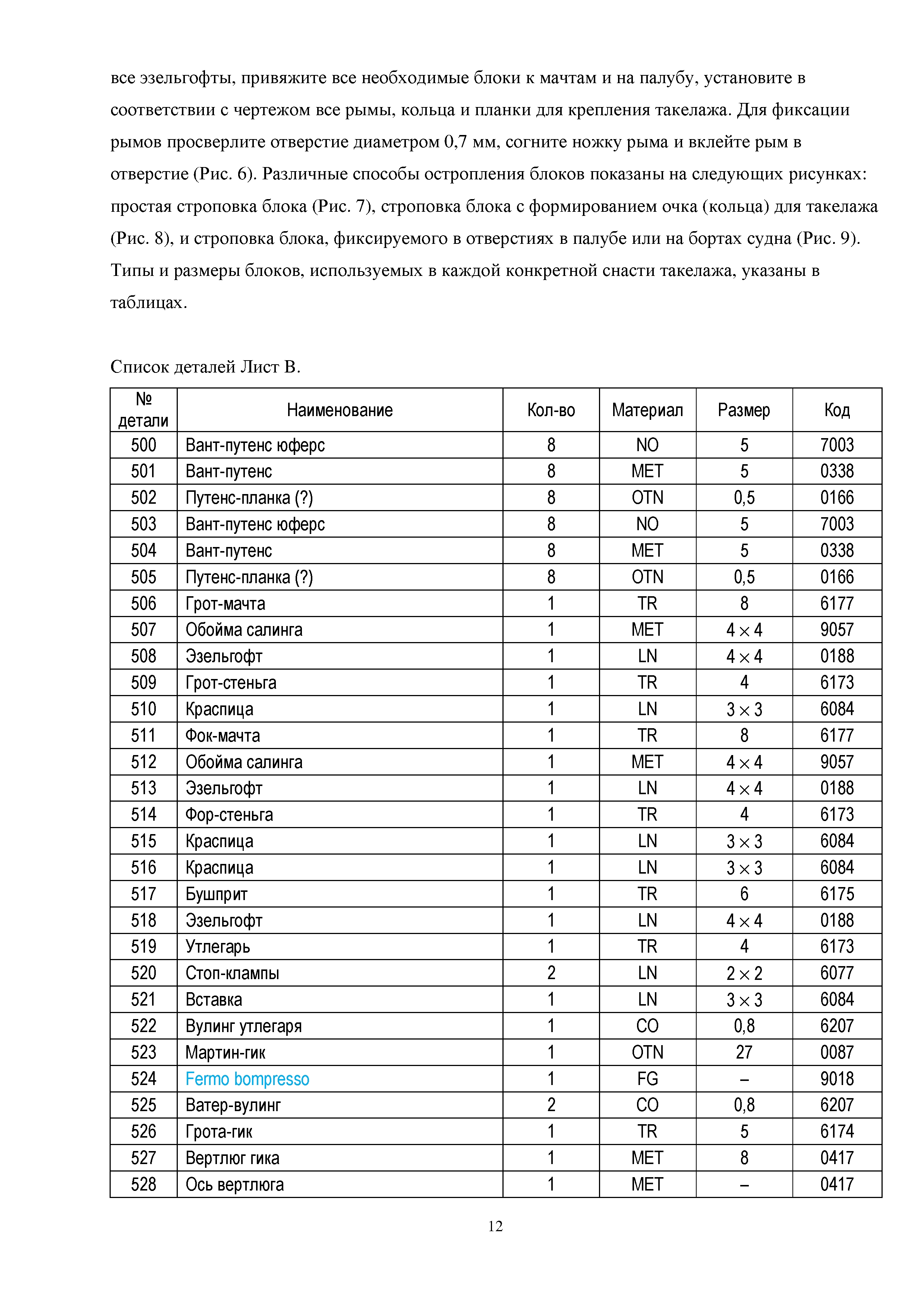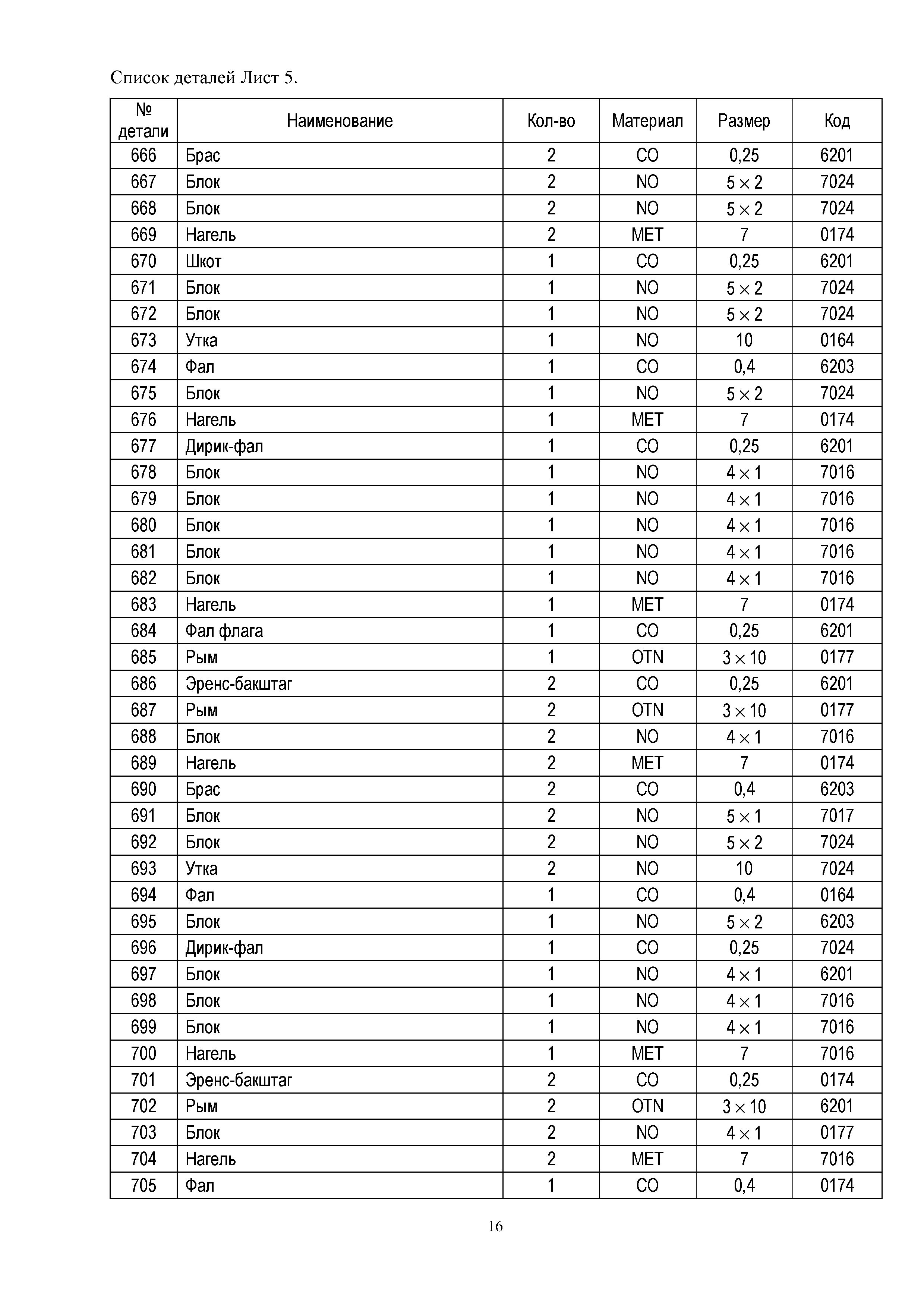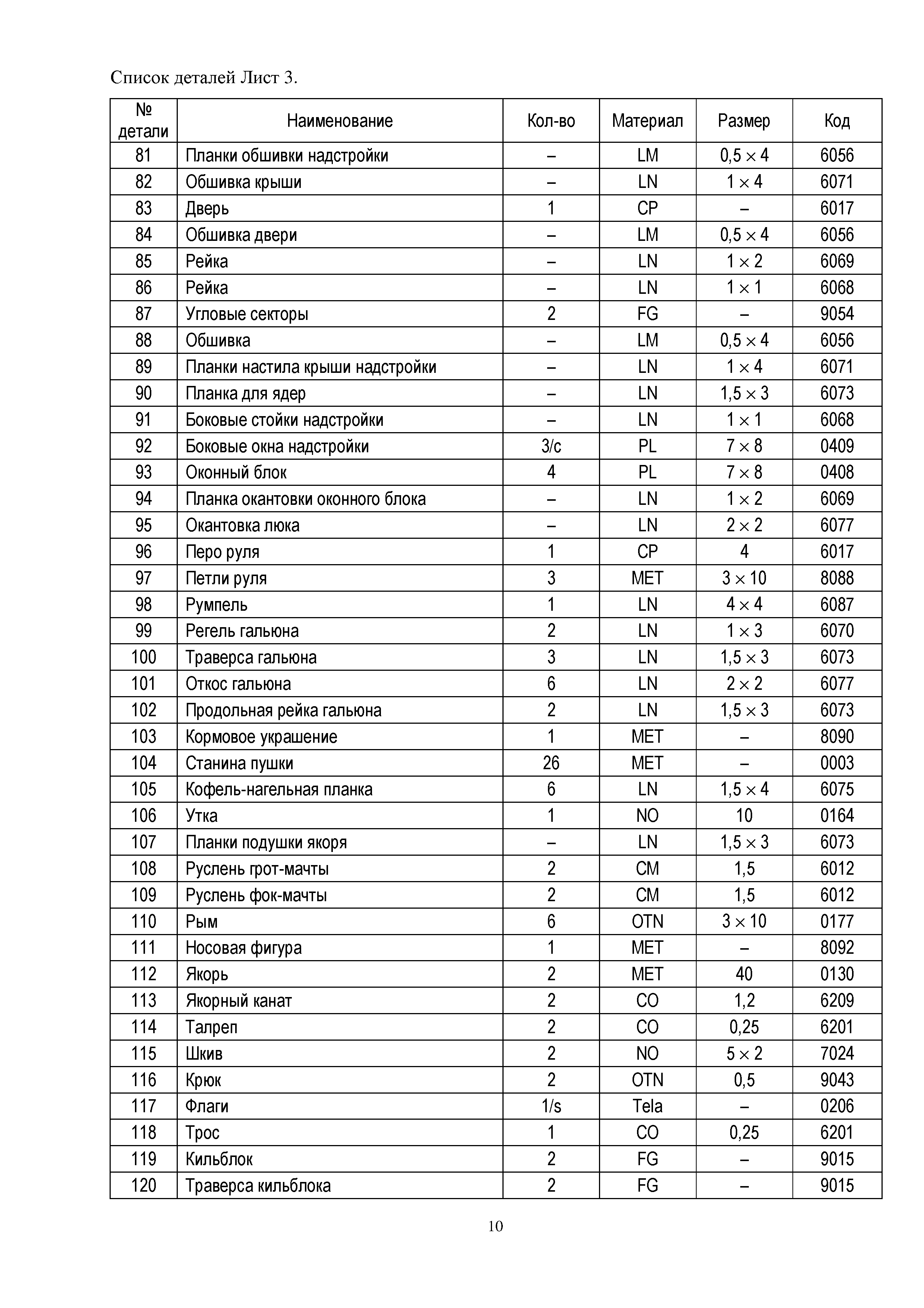 Для тех, кто хочет собрать эту шхуну "с нуля", приведены листы спецификации и чертежей.