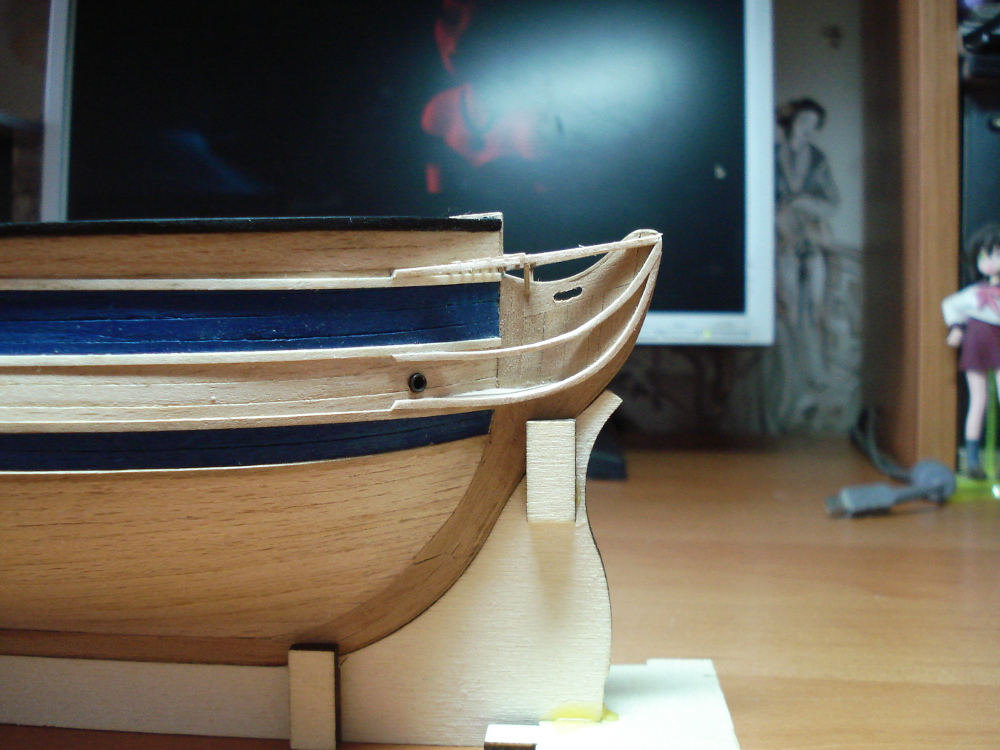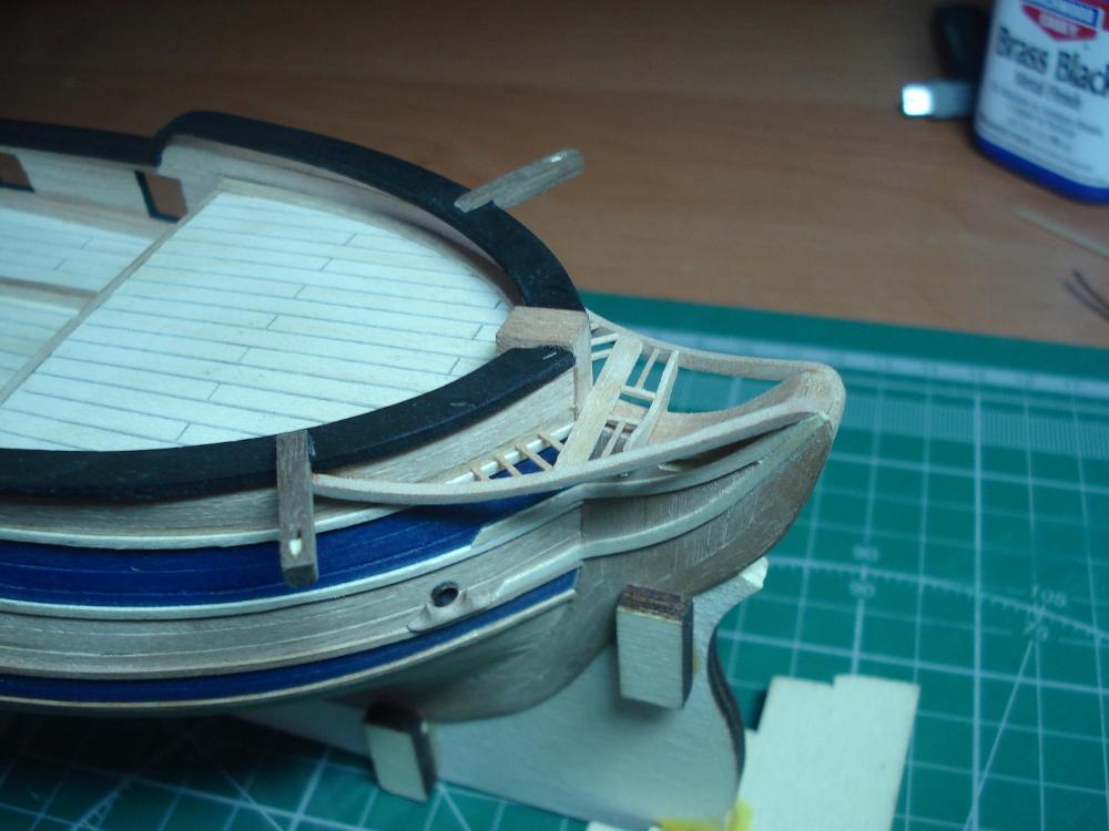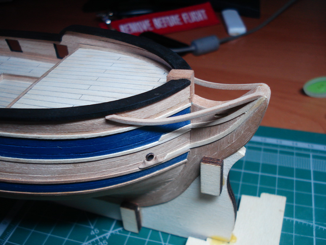 Вопрос по балке якорной. У Мантуи она изображена поверх планширя и прибита некоей косынкой-хомутом поверх. На моделях у людей вижу, что по уму она должна иметь развитие и крепиться к палубе. Высота борта по планширю на баке у меня получается миллиметров 7-8, перебрасывать - будет очень ядрёное развитие, может вывести под планширем? Или как в наборе тоже имело место быть?
