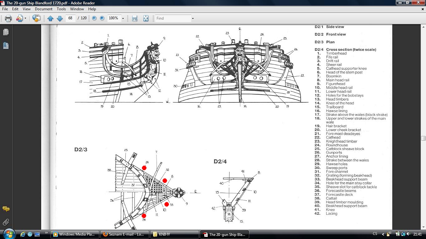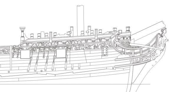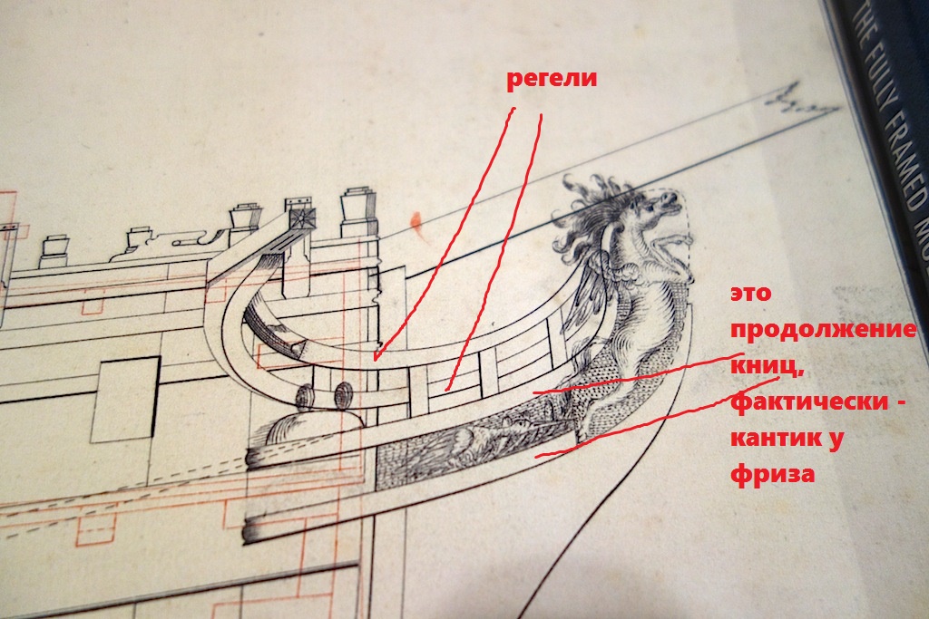 Да не, носы у них как раз похожи. Вы просто немного далеко вперёд завели регели, на то место, где должна быть носовая фигура. И стали ставить решётку, совершенно забыв про шпангоуты (тимберсы) гальюна - регели же не в воздухе висят. Решётка должна быть на уровне верхнего регеля (и он - самый толстый!). А там, где у вас два нижних регеля, их там не было вообще - было просто декоративное оформление фриза и книц.