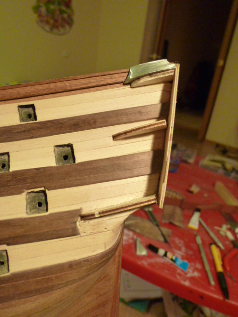 С ригелями гальюна я промучался долго. Возможно из-за того, что форштевень встал не на свое место, ригели не хотели вставать в нужное положение. После различных подрезаний и подтачиваний я их приклеил. Но уже позже понял, что не совсем угадал с их месторасположением. Обращаю внимание: средний ригель должен располагаться непосредственно под отверстием крамболы (устройства для удержания якоря), т.к. в дальнейшем от него будет плавный переход через вставку. У меня этого не случилось и был вынужден оставить данный недостаток без устранения. [attachment=9]P1050238.JPG[/attachment] Ригеля я окрасил в золотой цвет[attachment=8]P1050239.JPG[/attachment]