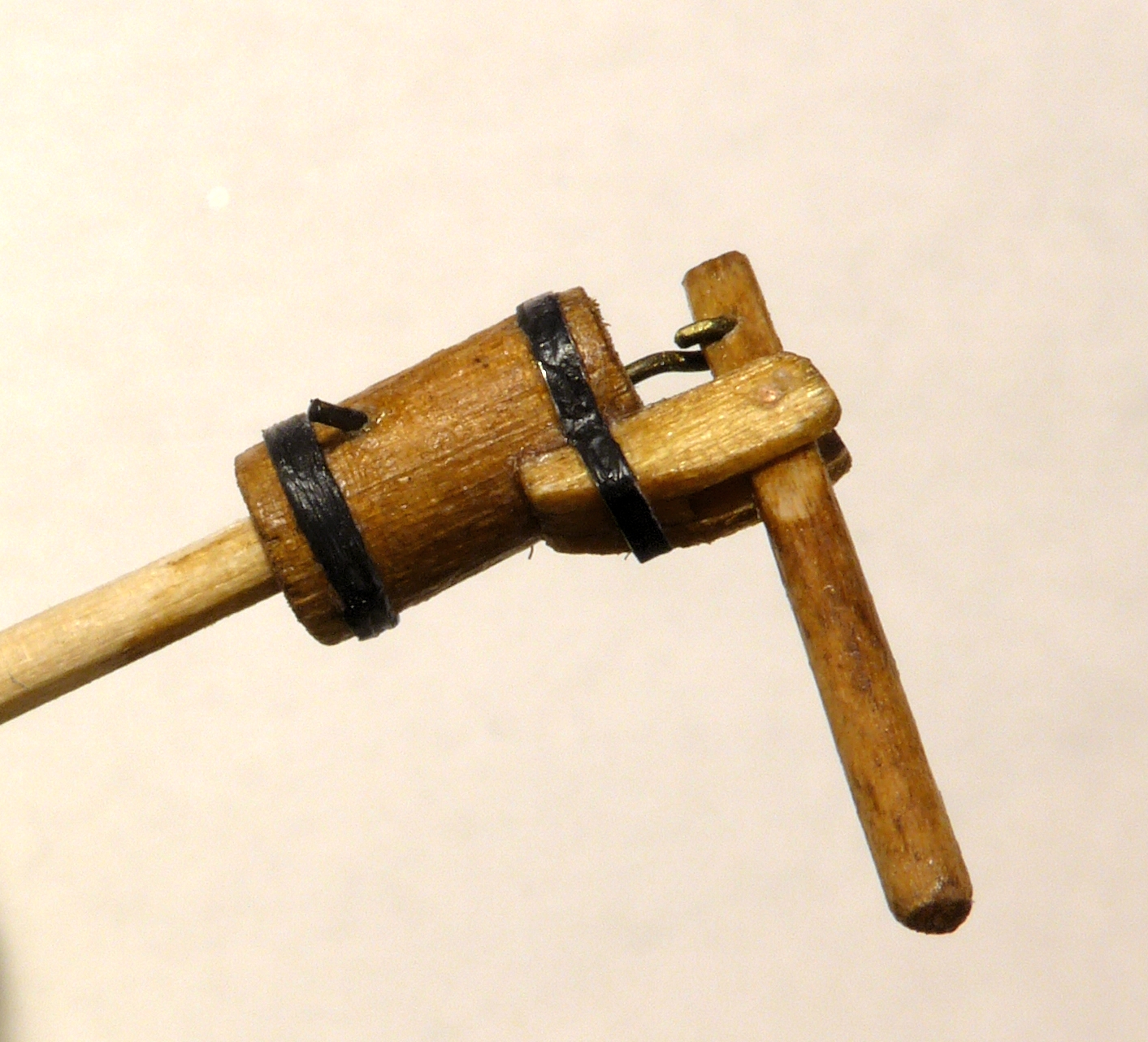 Помпу сделал из палочки диаметром 5 мм. Обода из тонкой алюминиевой проволоки, которую потом покрасил. Рычаг сточил также из зубочистки до 1мм.