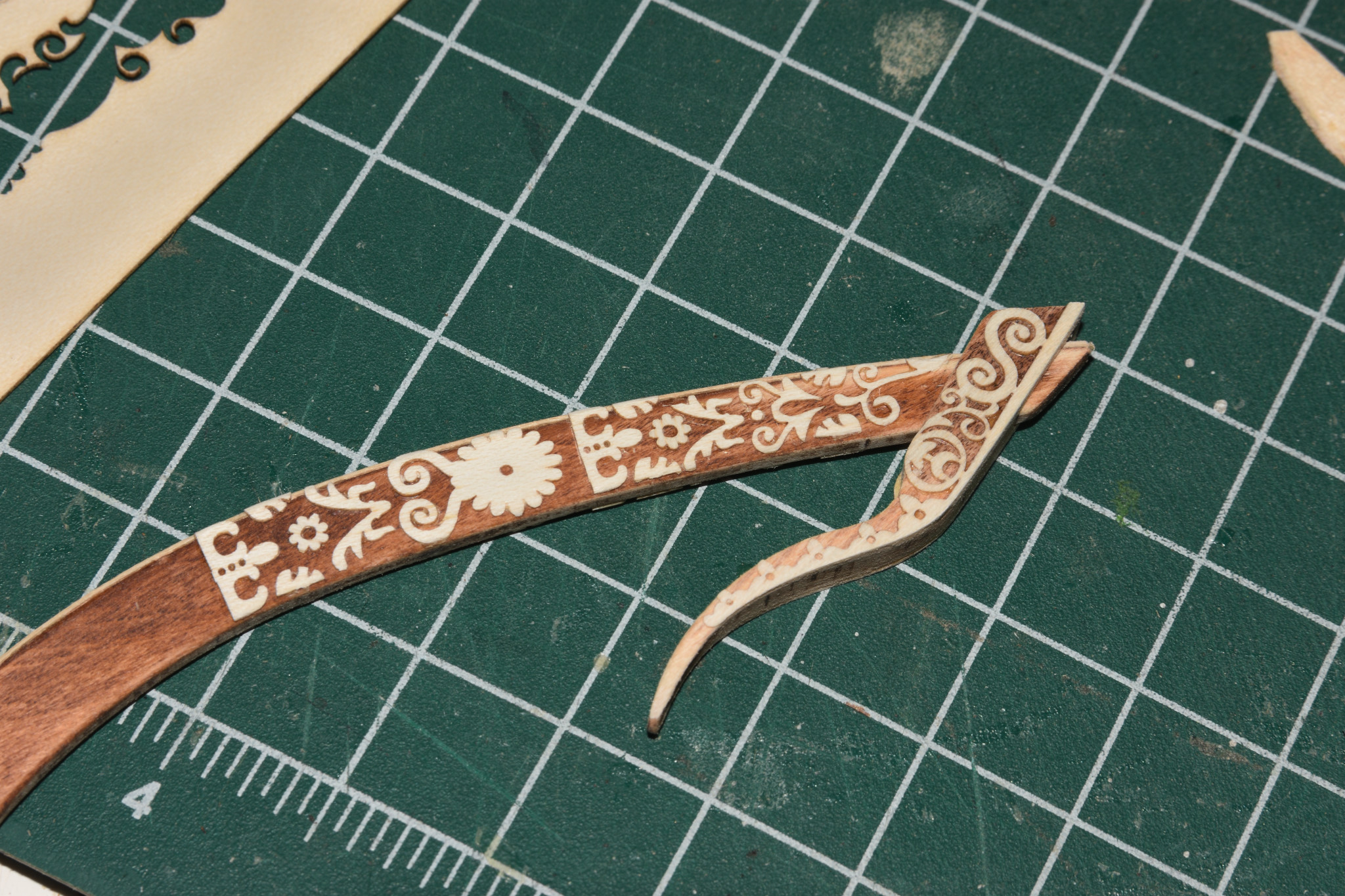 Продолжаю работу над корпусом. Из переделок: 1) добавил еще пару стрингеров - изначально ошибся с позицией днищевых, так что явно просились еще; 2) люки у китайцев были странные; 3) оголовки топтимберсов и кнехт сделал из груши; 4) добавил грушевые же фальшбортные утки. На чертеже их нет, но снасти надо где-то укладывать, а судя по итальянцам и грекам, такие утки в Средиземноморье - дело обычное. 5) Ну и декор. Полагаю, что на гравюре он был довольно-таки условен и уж точно не универсален. И делался явно не из латуни. Посему отрисовал его сам, основываясь на декоре султанских каиков из Стамбульского Морского музея. Кроме того, из той ахинеи, что нанес с турецких форумов гуглопереводчик, удалось уловить, что наиболее популярным мотивом орнаментов был плющ. Декор нарезан лазером из кленового шпона 0,5 и получился очень хрупким, местами пришлось клеить кусочками. Хорошо еще заказал в двойном количестве.