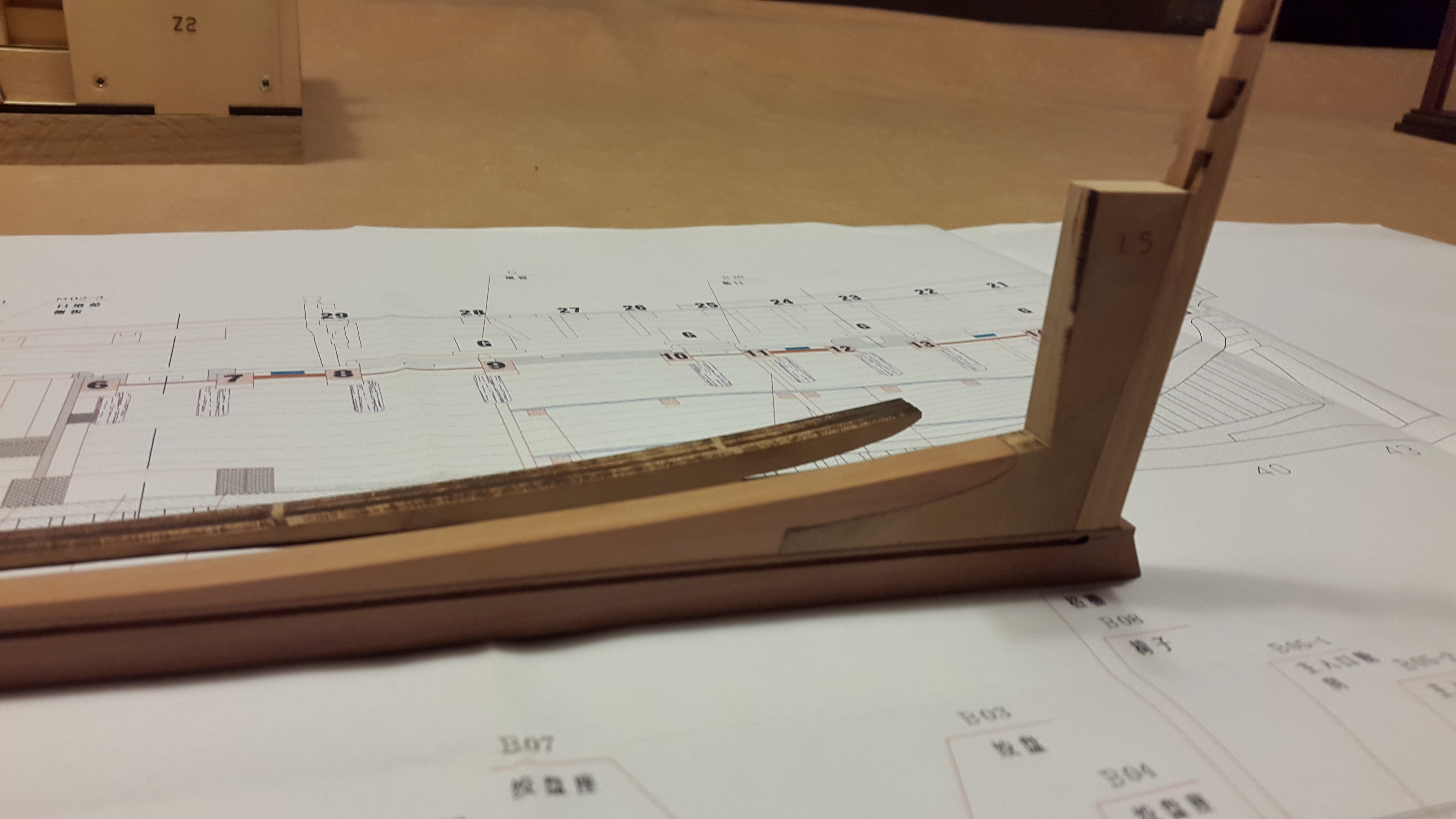 Доброго всем времени! Стройка продолжается, правда не большими темпами. На сегодняшний момент установлены 15 шпангоутов в носовой части. Перехожу к установке кормовых шпангоутов. Пришлось повозиться с винтранцем, наборный не очень подходит, тем более на чертежах винтранец с погибью, пришлось изготовить заново.