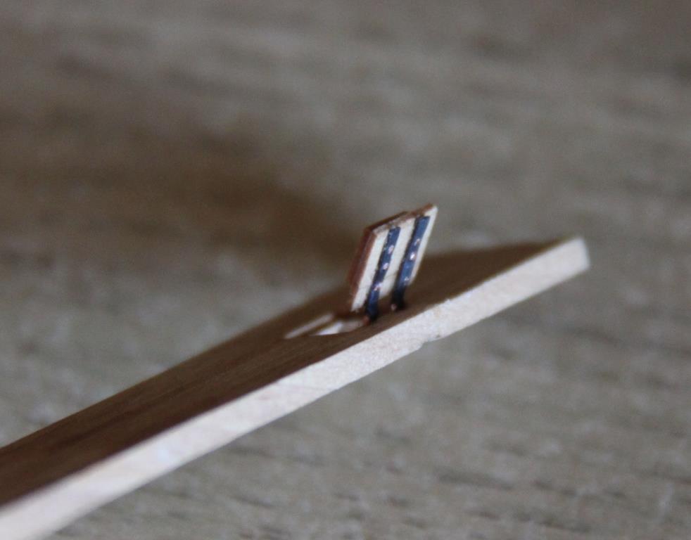 Для второго "остропленого блока" к петельке (до установки ее на "блок") креплю отрезок нити, который будет имитировать лопарь талей.
