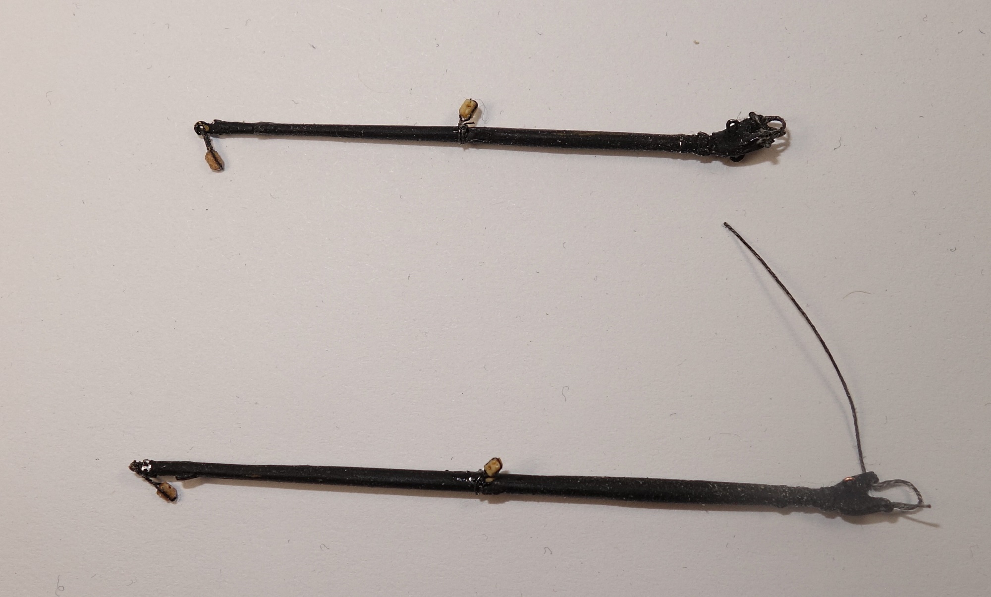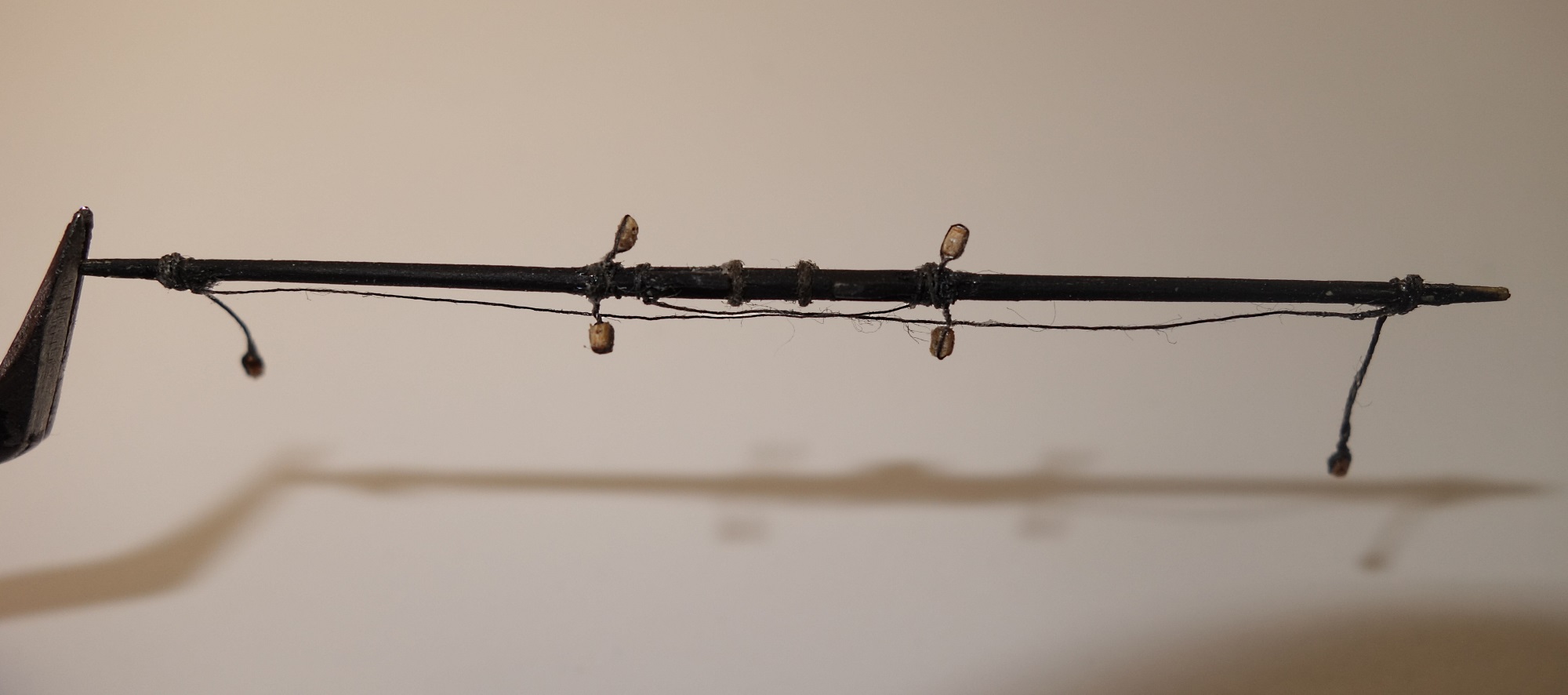 -сначала оборудовал все рангоутные деревья необходимыми блоками и снастями (пертами, боргами, шкентелями, тросовыми бейфутами(на раксы -бугели не стал замахиваться ибо мачты в районе крепления реев имеют диаметр 2,5-3 мм)