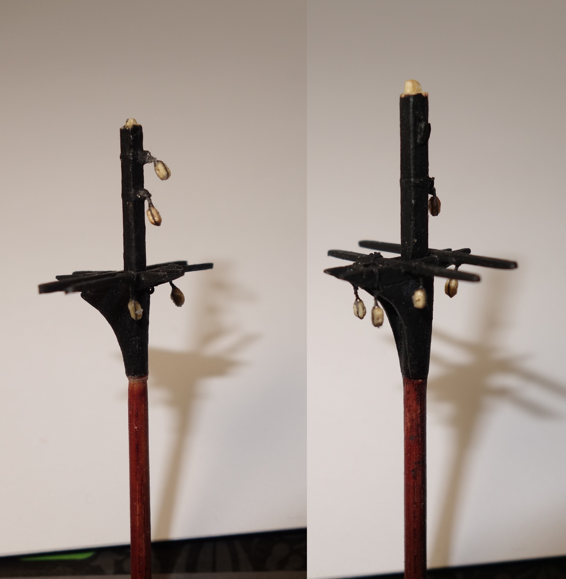 -затем на специальном стапеле, обеспечивающем правильный наклон мачты, креплю к ней седло гика, кольцевую кофель-нагель планку, имитацию брюканца и платформу пятнерса (пятнерс я делаю в виде квадратной платформы, несколько выступающей над палубой, что позволяет мне до установки на корпус, смонтировать блоки, крепящиеся у основания мачты и поставить соответствующие снасти такелажа)