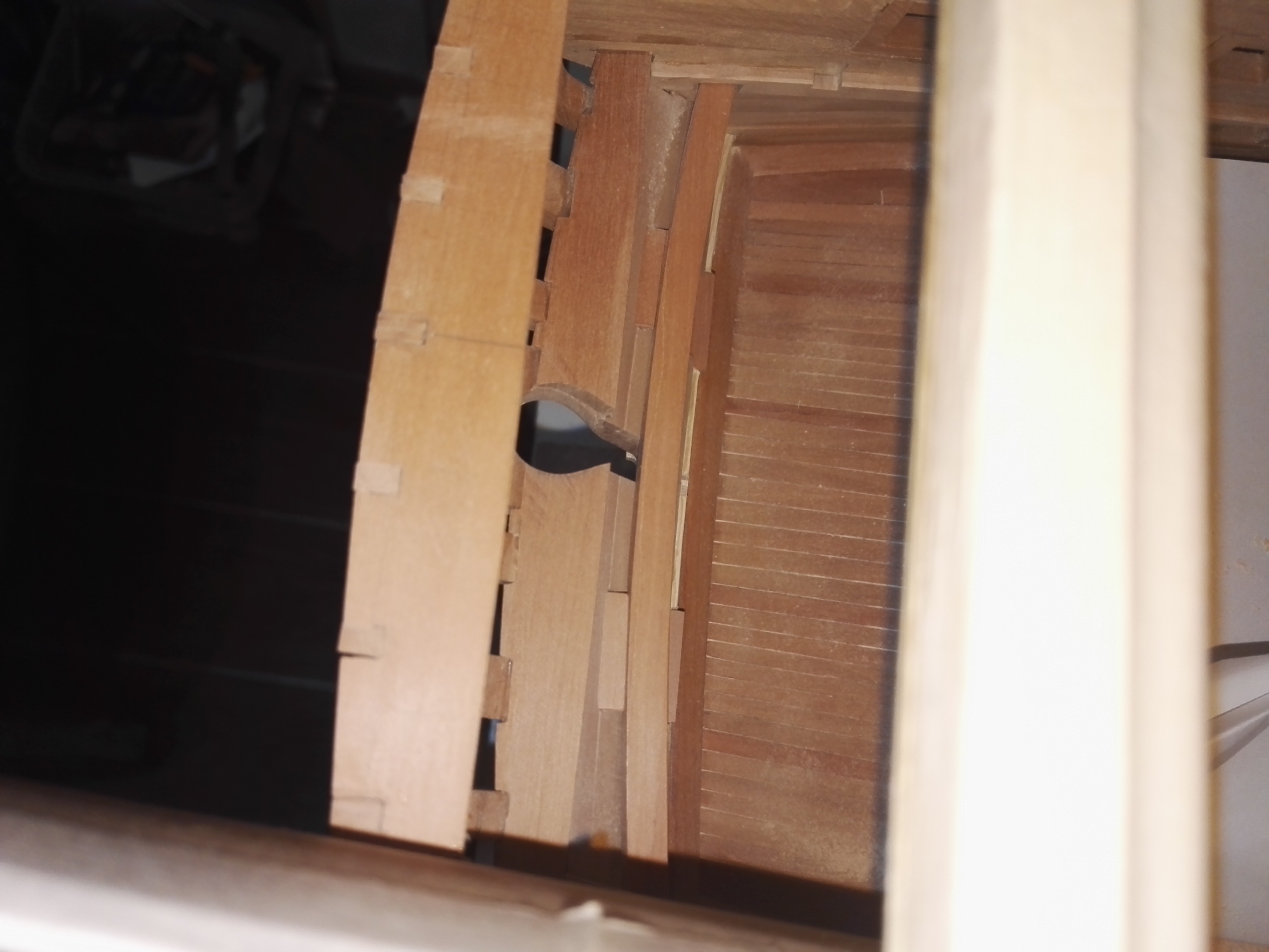 На теоретическом чертеже нанесены геолинии. Если эти геолинии перенести на боковой вид, то видится, что от "бархоута" (уровень гондека, переходящий без ступени в обшивку) до киля они делят обшивку (38 досок) на семь частей от 3-х до 7-ми досок в участке. Разделим на виде с носа 38 досок на эти участки... Ширина досок в этих участках варьируется (в моем масштабе) от 4,5мм до 6,8мм. К уровню портов они шире.