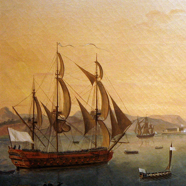 На картине: белый флаг на французском корабле в 1747 году: