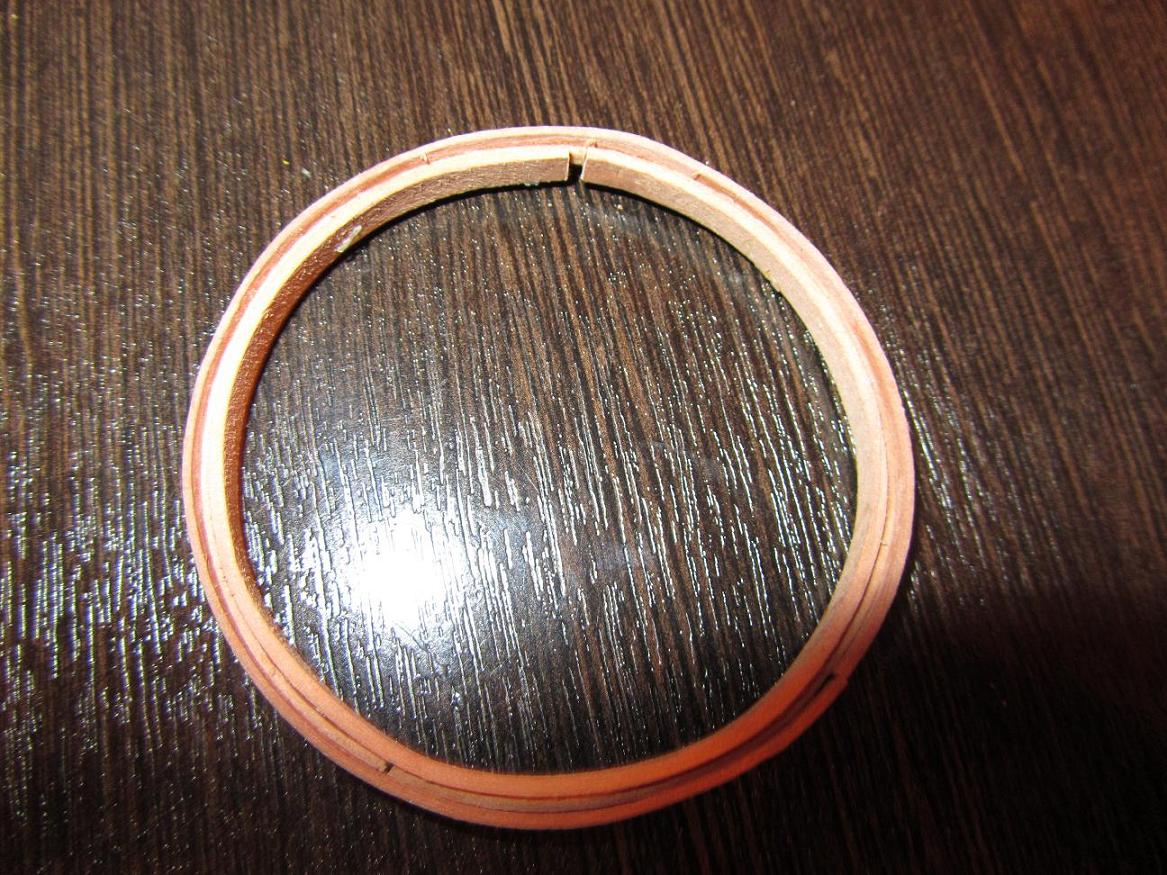 Попробовал склеить кольца 63го диаметра пакетом из рейки 1 мм толщины, идеально ровно рейка не гнется, небольшими частями овальными, а местами переломами. Изогнул так штук 15 реек, выбрал 3 лучшие, склеил, но не доволен. Получилось ужасно, лучше уж потратить еще 10 часов на второй круг, изготовив его по методу первого.