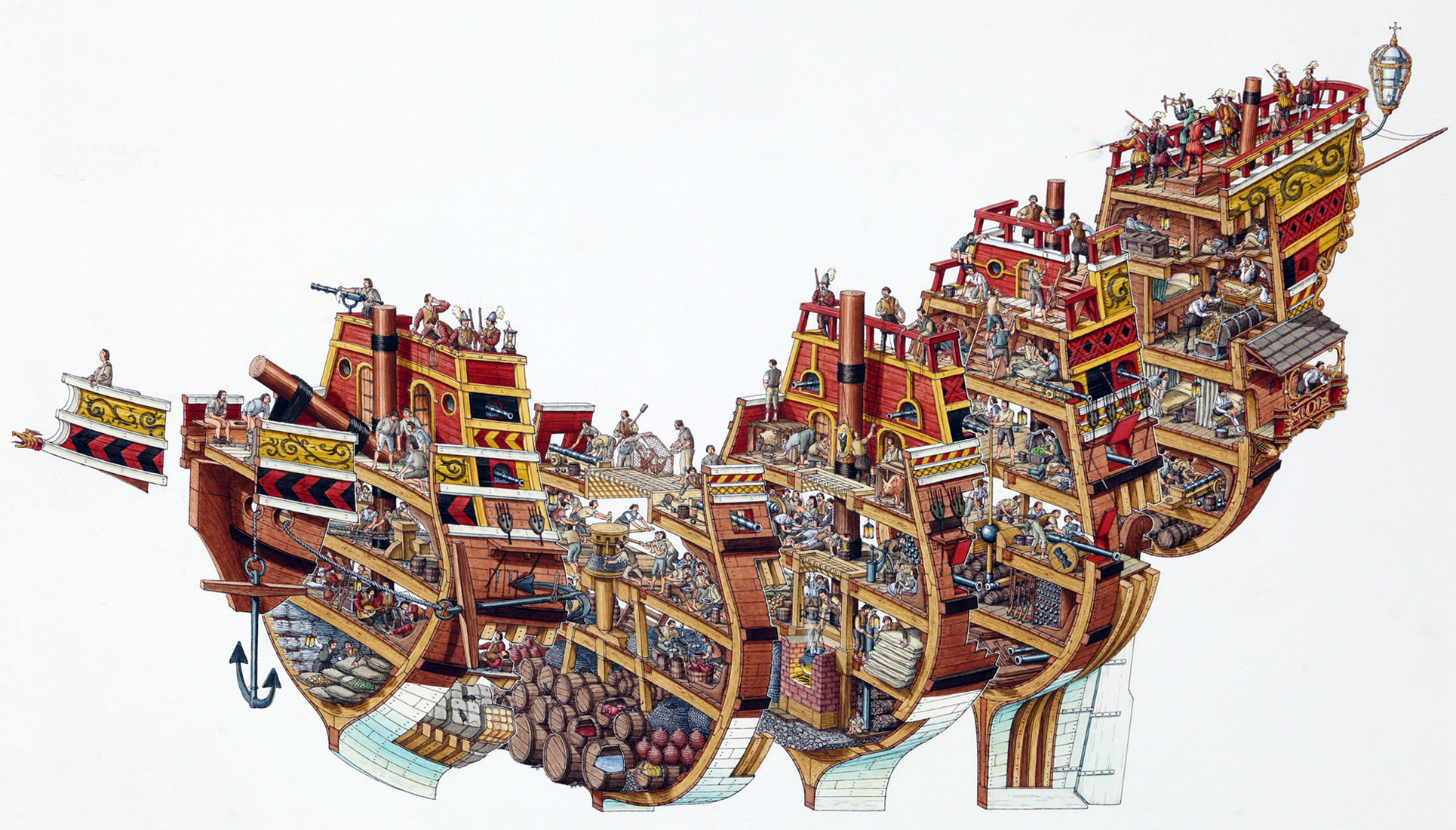 Но меня смущает низкий борт на открытом участке опредека... Мне кажется, у испанских галеонов он был высокий - с рост человека, а то и выше. Посмотрите чертежи галеона "Сантьяго-де-Компостела"; там ещё и щиты на фальшборт навешаны, чтобы укрыть команду судна...