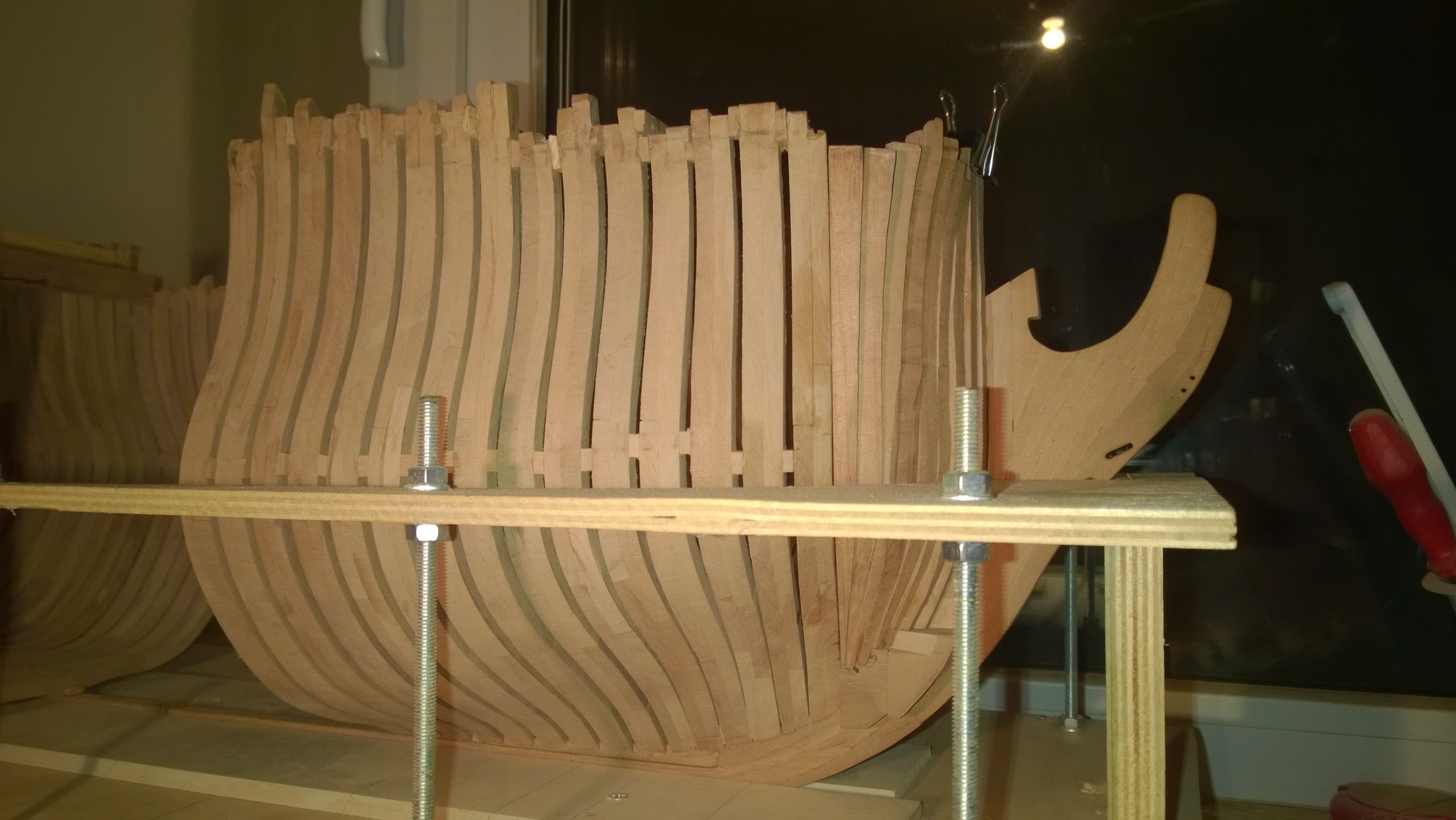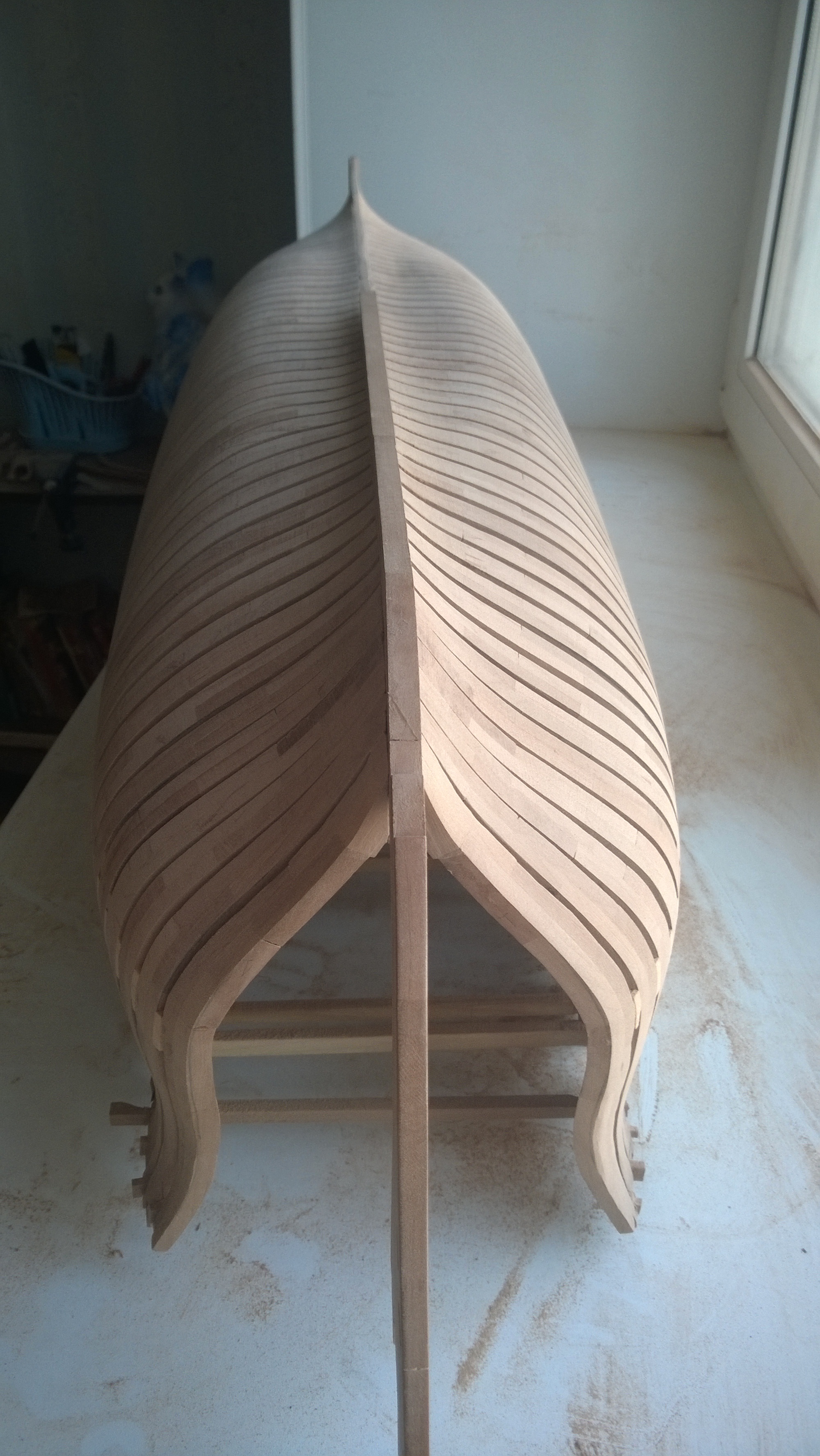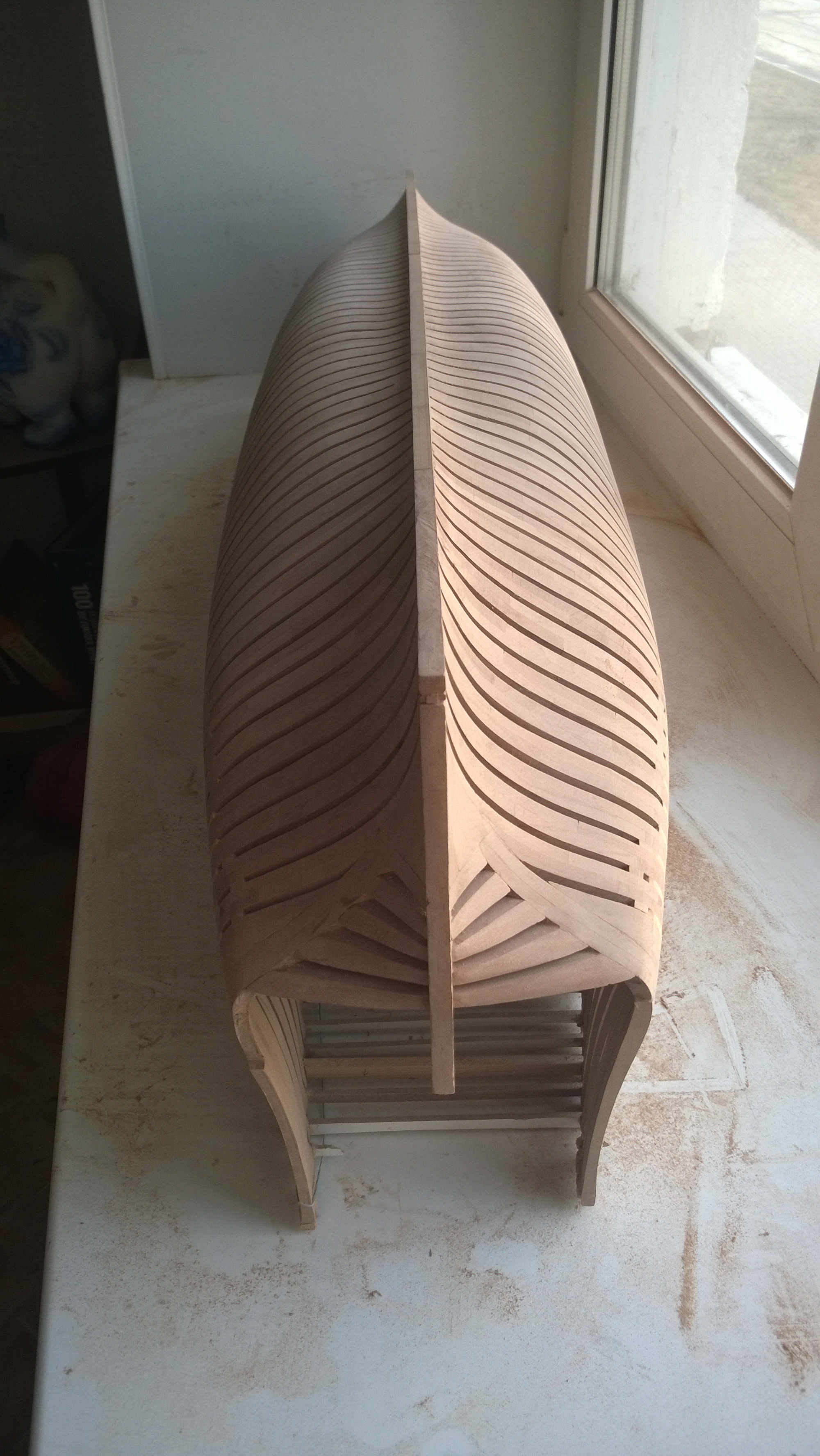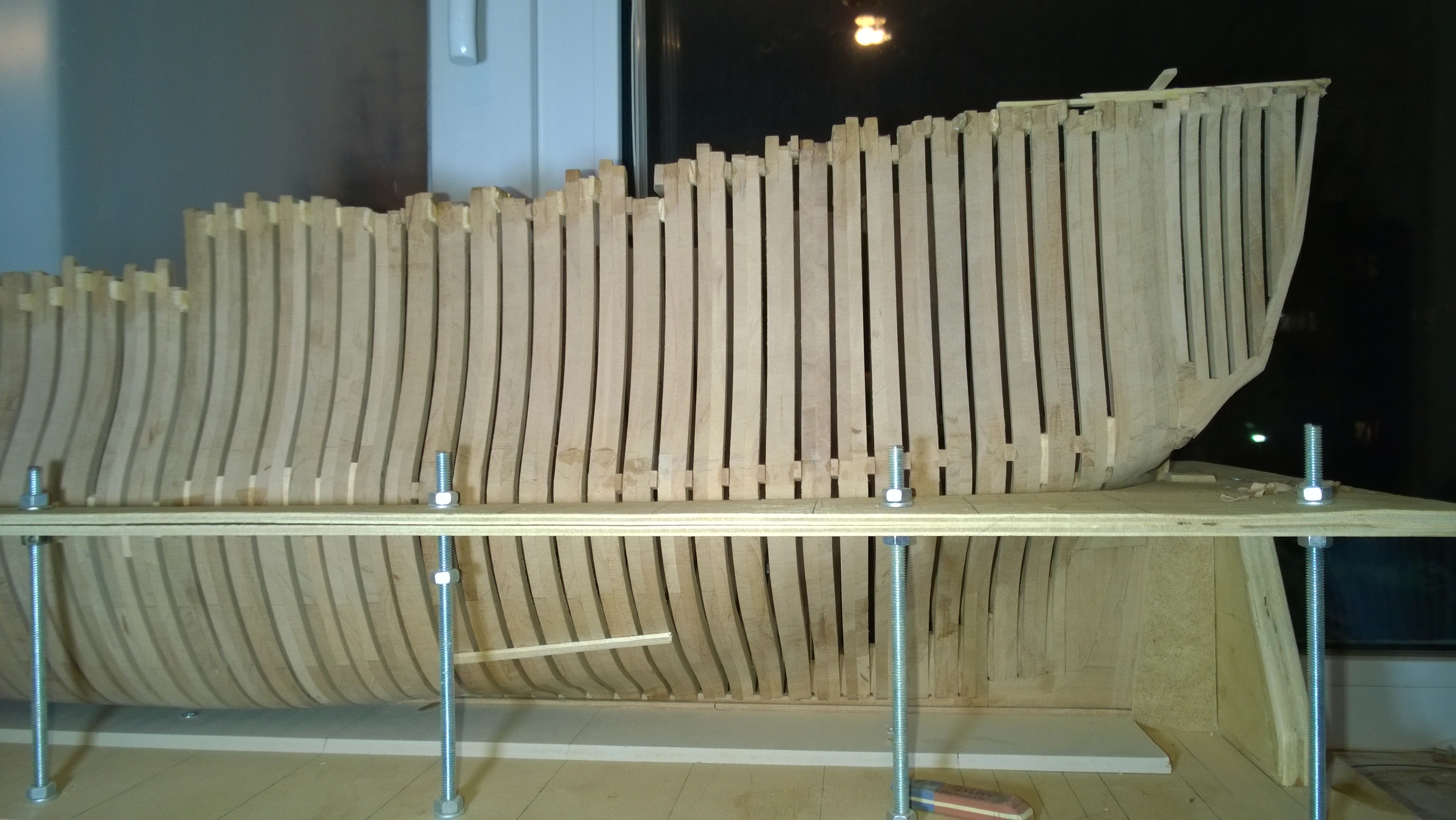 Ну да. Воткнул довольно быстро. Проверил борт рейкой,удалил косячки. Проверил ширину по скулам-всё ОК. Начал малковку левого борта.