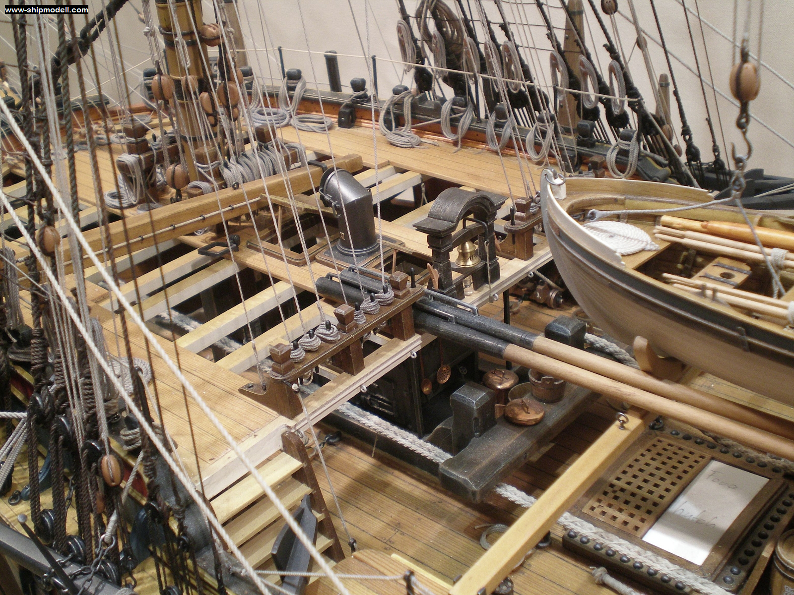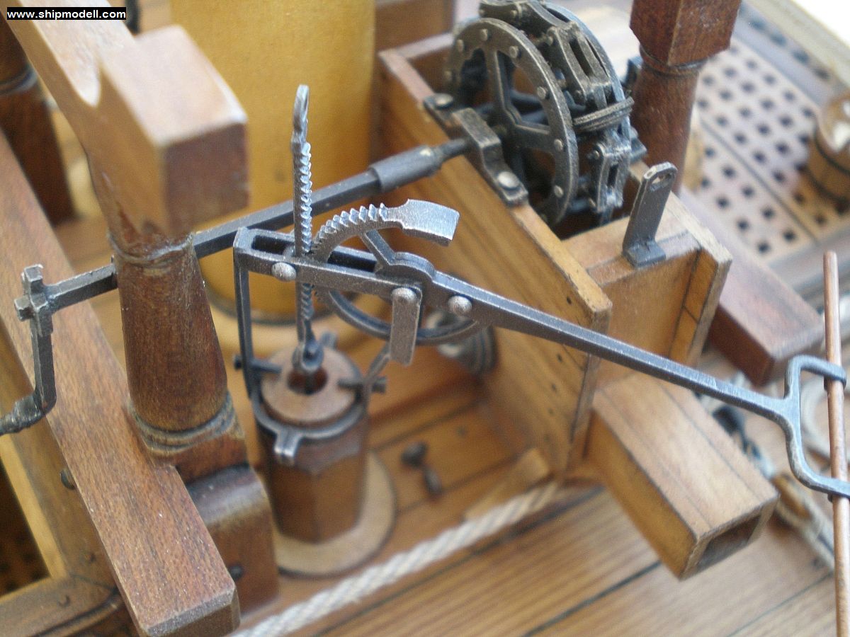 Ладно, если плунжерные помпы на Пандоре для хозяйственных нужд, то кеттенс-помпы, известные своей производительностью, служат для аварийной откачки воды из трюма. Так? Но, по иронии, или недогляду МакКея, слив у цепных помп на модели именно такой, как если бы на корабле были бы только кеттенс-помпы. Они имеют короткий коробчатый слив - это вариант помпы для хозяйственных нужд. При наличии же на корабле вязовых помп, сливы из кеттенс-помп представляли собой трубы, исходящие из "ванны" кеттенс-помпы и идущие на небольшом расстоянии от палубы прямо к шпигату. Шпигат был расширенный, по отношению к другим шпигатам.