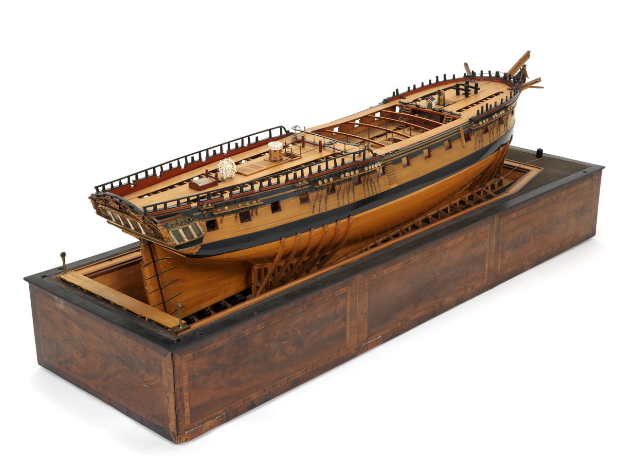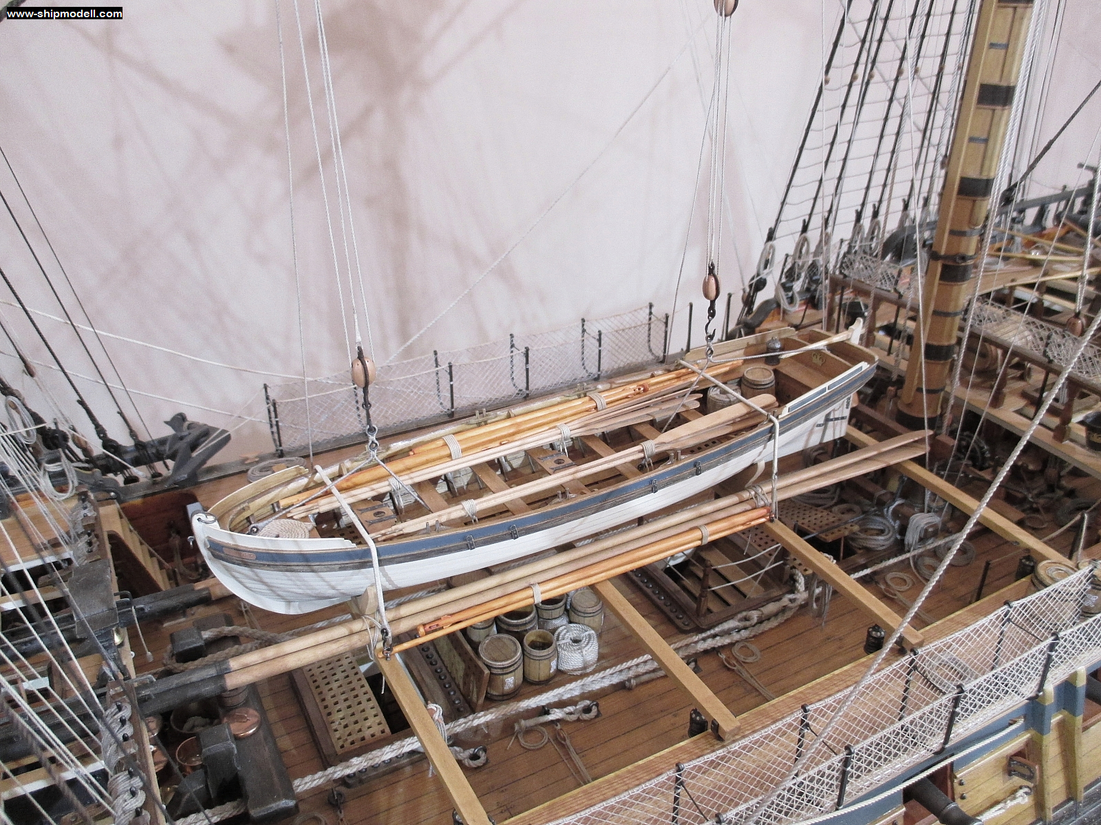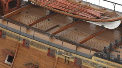 МакКей показывает нам так называемые "низкие" мостики шкафута, что идеально подходит под данный период, и присутствующие на мостиках скид-бимсы в бронзовых брекетах. Эти скид-бимсы съёмные, брекеты напоминают уключины у шлюпок (но были и не съёмные, но это не наш случай). Скид-бимсы имели лёгкую погибь, но всё равно они по своей высоте не превышали бимс бака и ростровую траверзу грот-мачты. Посередине скид-бимсов устанавливали самое тяжёлое вспомогательное плавсредство - барказ (-с). Дело в том,что сломать тонкие и лёгкие скид-бимсы было несложно, а у барказа подводная часть была продолговатая и очень плоская, по сравнению с другими шлюпками. Это позволило ставить барказ на небольшие киль-блоки (автор модели переборщил слегка) и на... запасные грот- и фор- стеньги, которые и лежали поверх скид-бимсов. Вот стеньги и несли основную массу барказа и поставленных на него шлюпок. Большие киль-блоки только бы мешали. Часто модели из музея показывают шлюпки на стеньгах вообще без киль-блоков, но модель Виктори - 1765 демонстрирует шлюпку на скид-бимсах без стеньг, но на киль-блоках, очень малых.