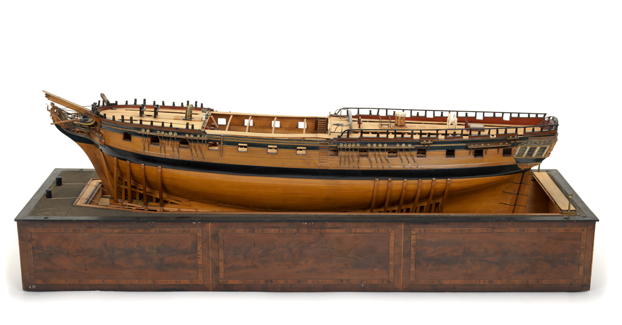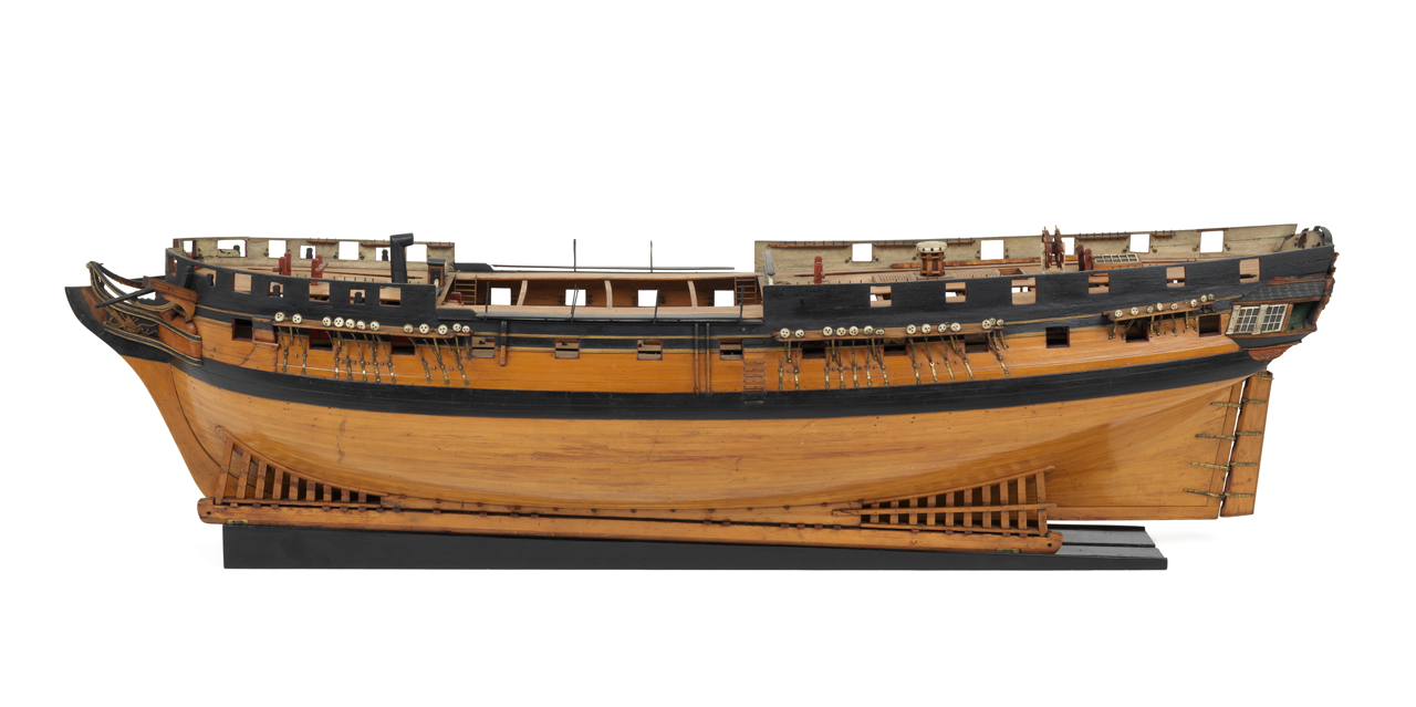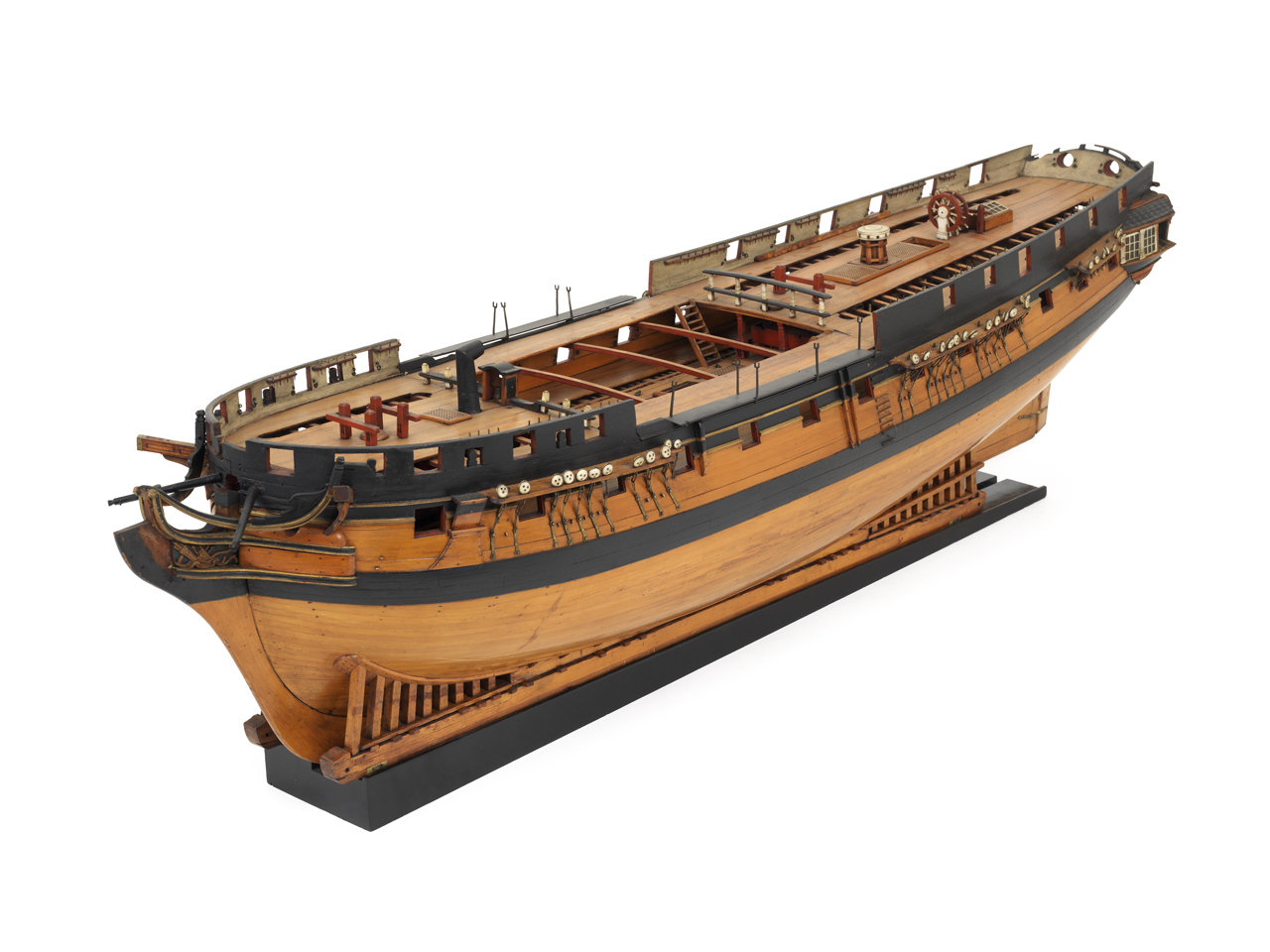 Я со всей ответственностью заявляю, что по крайней мере нет ни одной модели не только фрегата, но и вообще корабля 1-6 ранга ДАННОГО ПЕРИОДА, где бы присутствовали кофель-нагельные планки в том виде, какими мы видим их на корабле-музее Виктори (Виктори-1778), ибо эти КНП появились только с появлением высоких дрифтов взамен фиф-реельсов и вантовых уток.