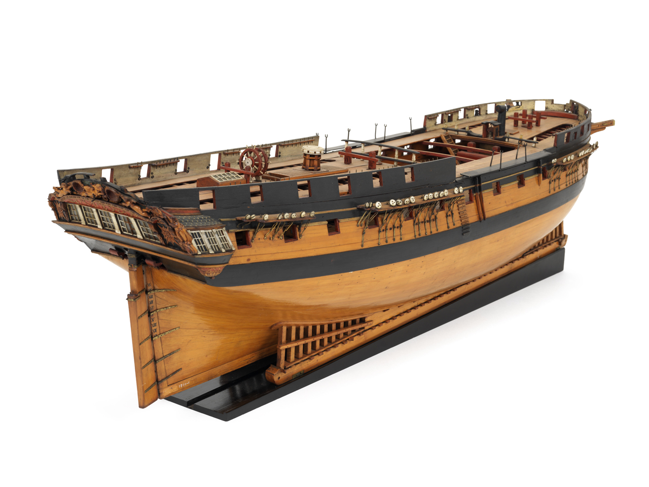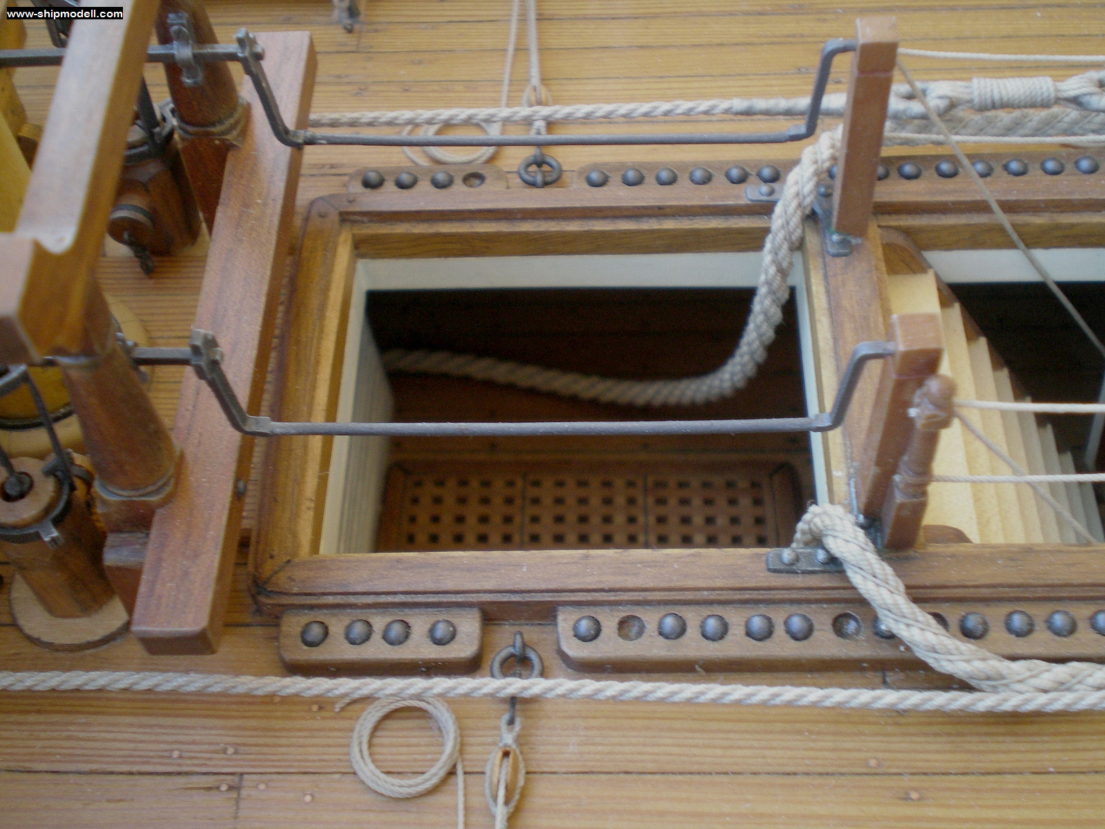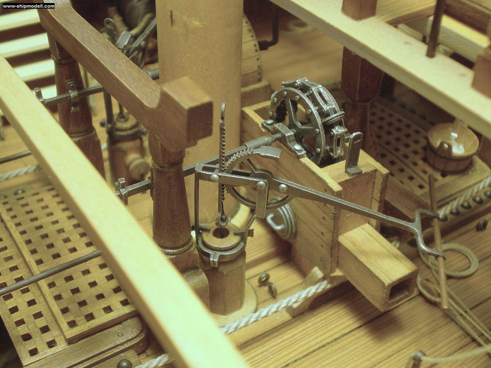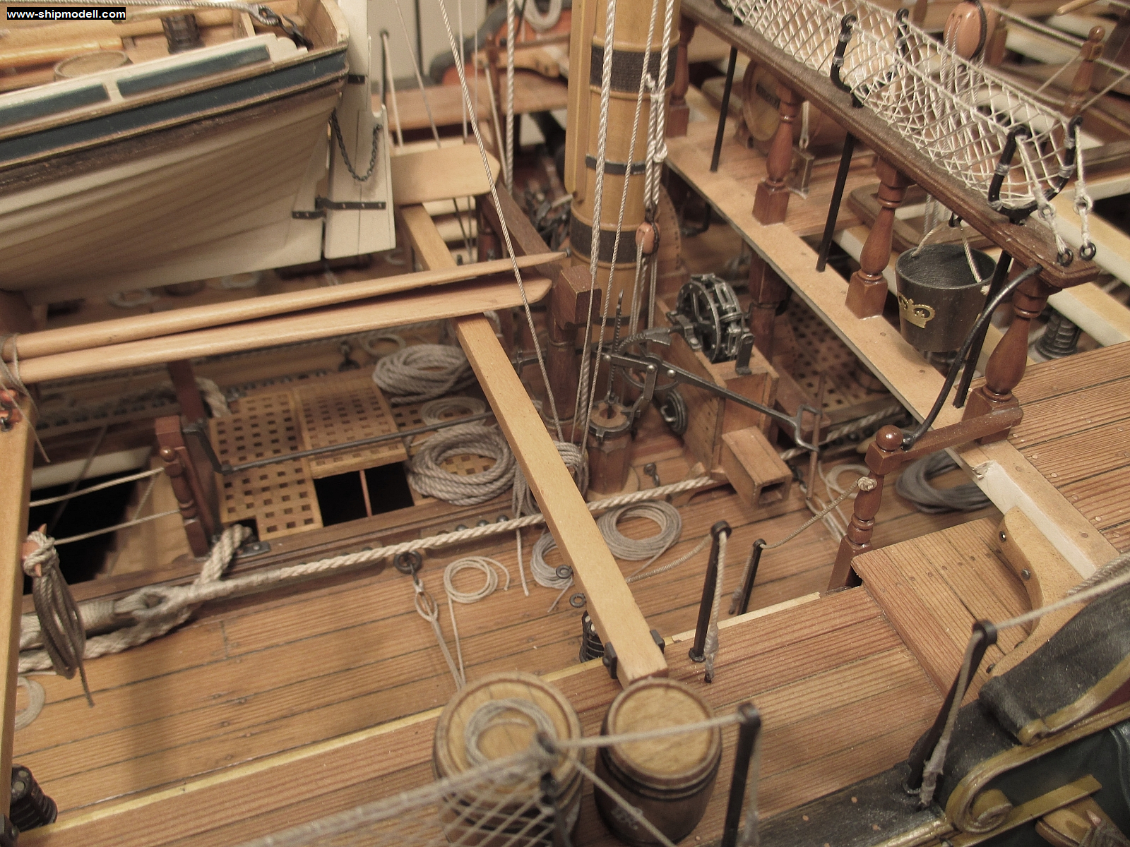 На этой фотографии видно, что ростровая траверза расположена ниже скид-бимсов. Посмотрите так же брест-реельс квартердека. Почему-то, у него отсутствует нижний реельс, пиллерсы соединены лишь одинокой "перилой" (верхним реельсом) в самом верху. Обычно в районе нижней части пиллерсов, которая квадратного сечения, должен быть еще один реельс. Пожарное ведро "а-ля Виктори" - это круто, конечно! Особенно, если приставить человечка в масштабе и задать автору модели пару интересных вопросов насчёт нечеловеческих сил и стальных мускулов пожарного...