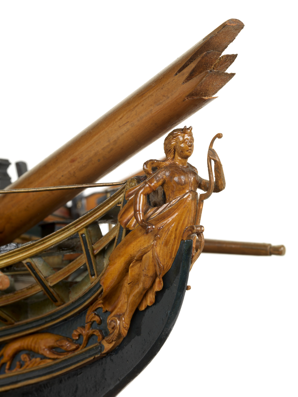 Ну, а ошибка в чём... В том, что запасных стеньг нет! Кроме запасных стеньг, должны быть запасные фор- и грота-реи, марса-реи и др ростровое дерево. Как правило, всё это умещалось на ростровой траверзе и на скид-бимсы не давило. Вёсла фрегата лежали самыми крайними, как наиболее востребованное имущество. На данном фото - всё наоборот