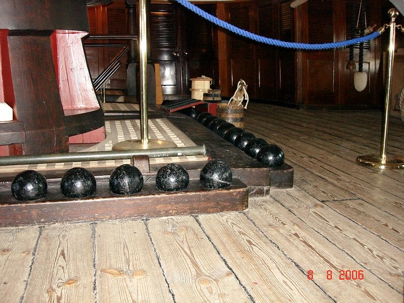 Чисто ИМХО: ложементы для так называемых "первых выстрелов" по периметру комингсов люков гондека переразмерены: для столь малых ядер они слишком большие. В 1778 году точно упоминаются ложементы для ядер, размещённые на внутренней обшивке борта, между пушечными портами. Видимо, для большего простора на палубе. Чай, не "Виктори"! Так как чертежей ложементов не встречается, что-либо конкретное сказать я не могу, запишите это как моё личное ИМХО - ошибка в увеличенных размерах ложемента. Я просто как раз и сравниваю с ложементами Виктории...