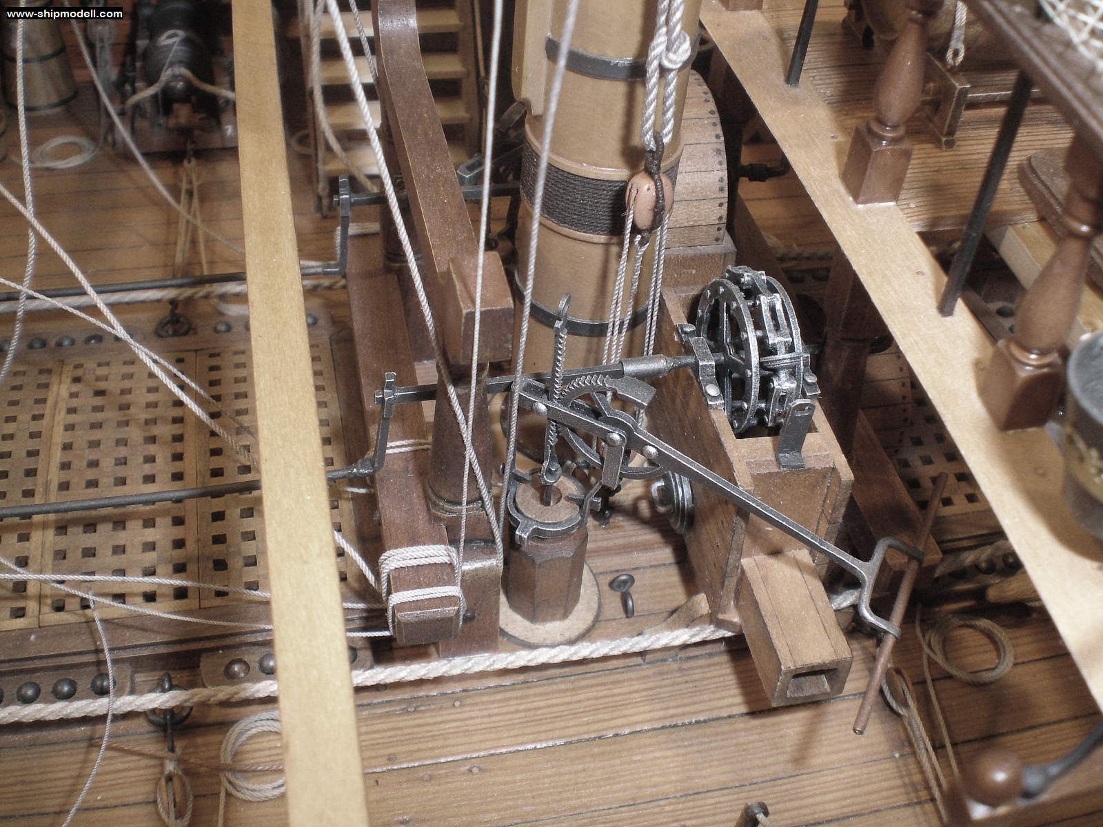 Перед грот-мачтой расположены плунжерные помпы, так же известные, как "помпы из вяза". Это довольно старая конструкция, но просуществовала довольно долго после появления более современных кеттенс-помп ("цепных помп"). Даже после введения кеттенс-помп, вязовые помпы оставляли для удобства подачи воды для хоз. нужд, чаще всего - драить палубу, тушить лёгкие возгорания, и тд. Одна и та же вязовая помпа могла подавать воду на разные палубы (не одновременно), что выгодно отличало их от кеттенс-помп с единственным сливом на гондеке.