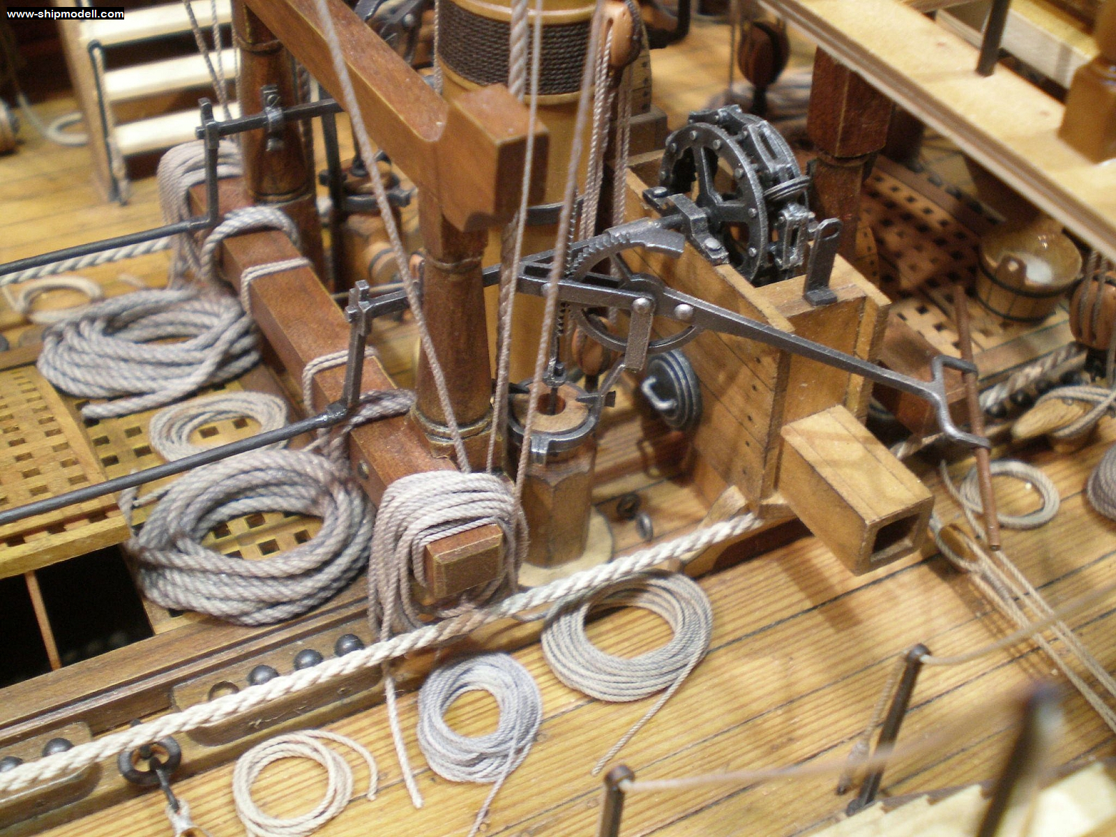 Вообще-то, для Пандоры вязовые помпы нужны, как в бане пассатижи, но пусть будут. А сейчас начинаются чудеса: идея взята явно из книжки Гудмана: посмотрите на фото: сливы плунжерных помп "смотрят" на ДП корабля! Ну, и как к ним присоединять тканевый рукав и вести воду к потребителю где-нибудь на носу корабля? А как бегать с вёдрами для работ на квартердеке или баке, если сливы помп не смотрят на тебя, и тебе надо прыгать к самой мачте, чтобы добраться до сливного патрубка? Обычно сливы плунжерных помп (да и вообще, всех помп) смотрят на борта, а не сами на себя. Кстати, именно верхний слив плунжерных помп не нужно было закрывать крышкой (на модели - закрыты), и рукав для полива водой был надет на сливы постоянно. Чтобы не мешался, его обматывали вокруг тела помпы.