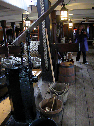Еще несколько фотографий, где видно, что использовать воду из плунжерных помп практически невозможно. Туда не то, что рукава завести - туда даже с ведром не подлезешь. Остаётся так же загадкой, зачем плунжерным помпам нужно лить воду на середину палубы и друг на дружку.