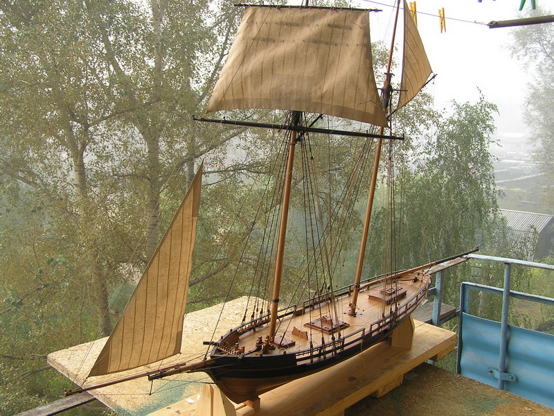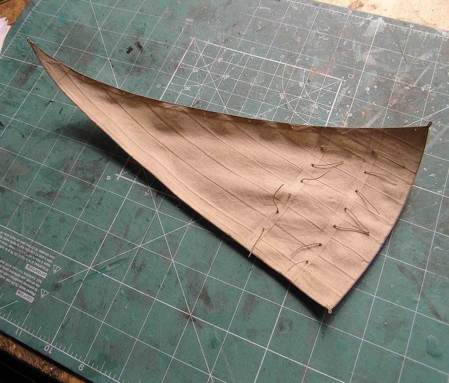 Вчера поставил первые паруса. Материал - перкаль. Тонированы морилкой, пропитаны раствором ПВА в воде. Пузо отформовано предварительным вытягиванием руками до установки. После установки продуты феном. Лик трос приклеен ПВА. Паруса склеены на ПВА из отдельных полотнищ и на просвет смотрятся вполне реалистично. Нашивки так же приклеены.