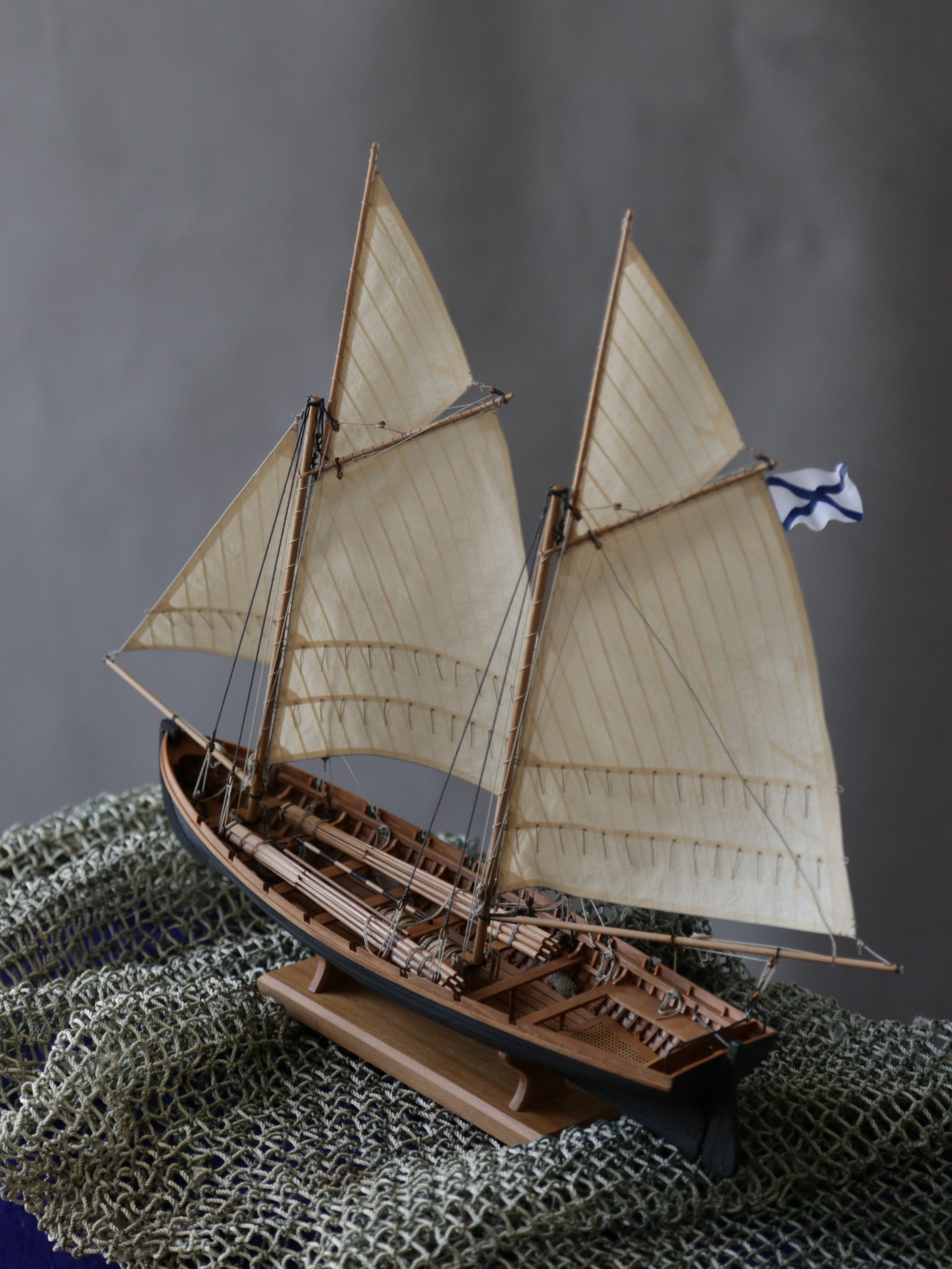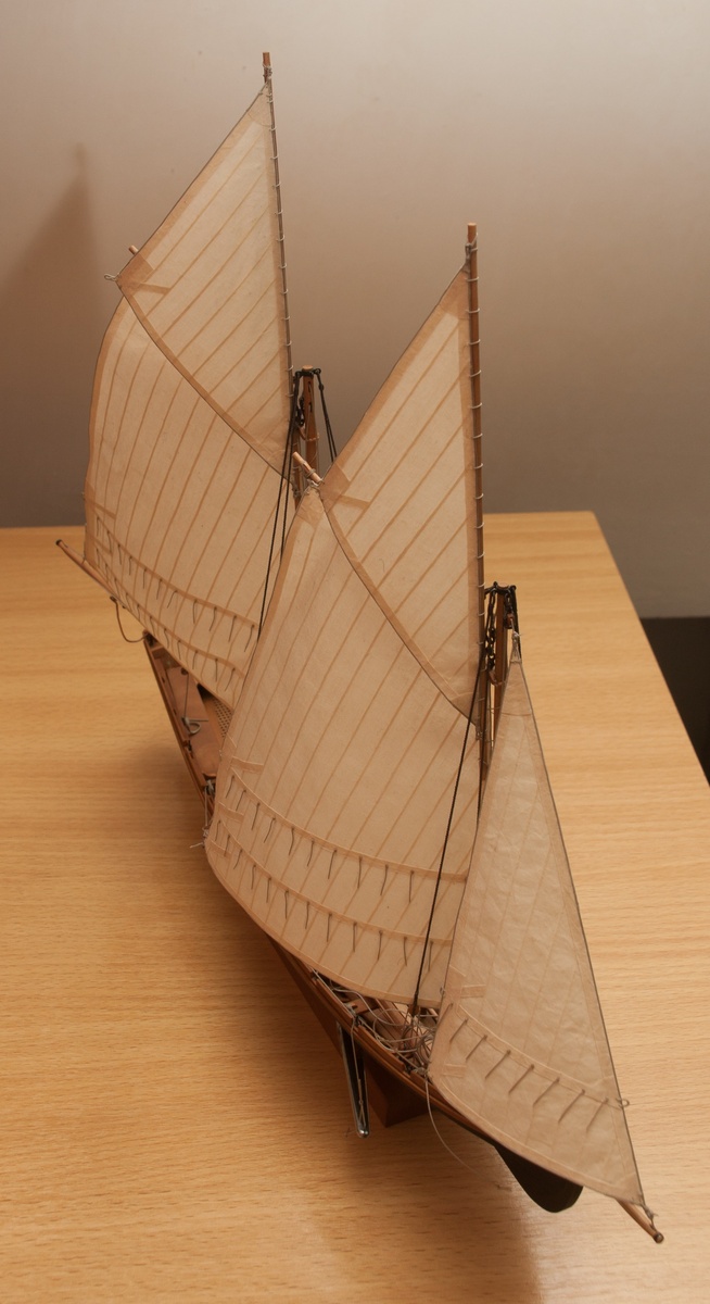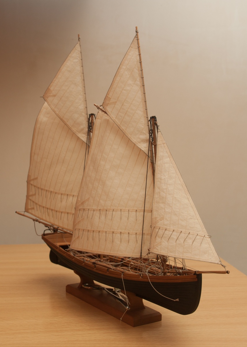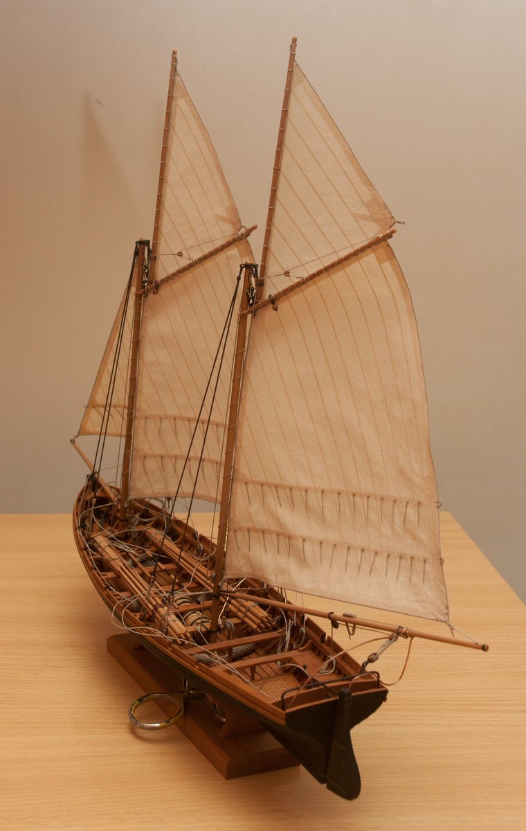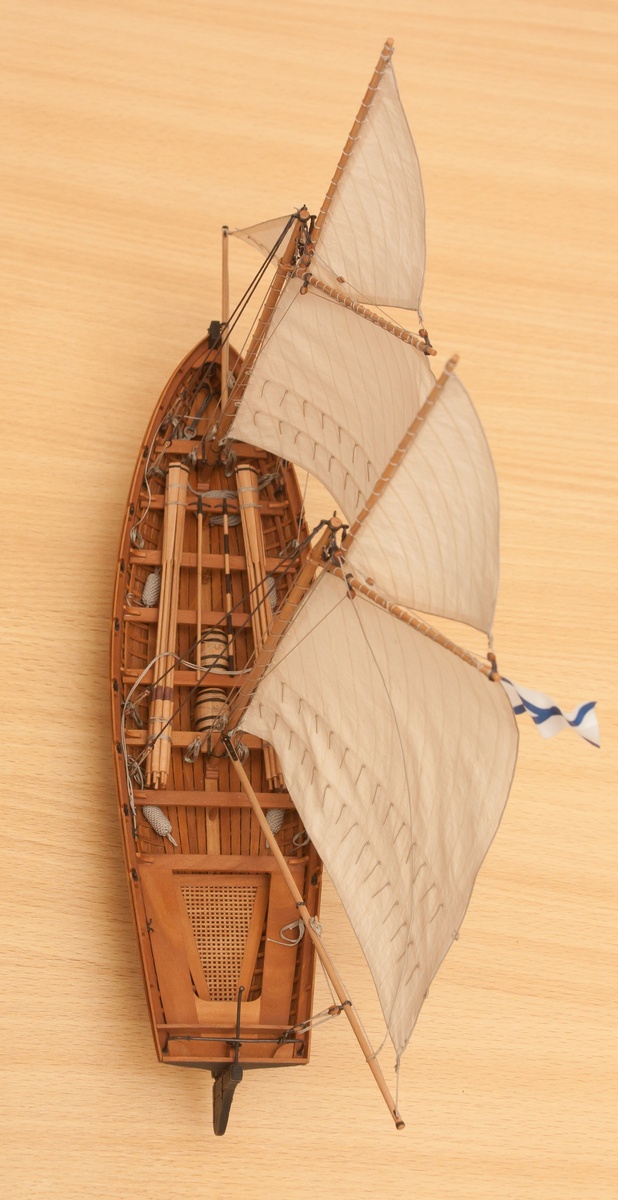 Я делаю так: Окрашиваю ткань чаем (чай мне не очень нравится, иногда идет пятнами), затем разведенным водой ПВА пропитываю и сушу на веревочке. Должно получиться довольно жестко, чтобы резалось острым ножом и не задиралось. Жесткость регулируется количеством ПВА. Далее режу на полосы нужной ширины, желательно их не перемешивать, я нумерую. Склеиваю внахлест нитроцеллюлозным клеем АК-20. Тут нужно приноровиться, чтобы шов был одинаковой ширины, желательно в масштабе и лишнего клея не налить, т.к. получатся неприятные пятна. Это можно делать на стекле с подсветкой, например, или держа в руках на просвет. После на получившемся полотнище размечаю парус, приклеиваю нитроцеллюлозным клеем накладки по той шкаторине которая крепится к рангоуту. На простейшей рамке Закрепляю парус прижимая по нашивке рейкой, и по шкотовым углам на гвоздики, и намочив парус разведенным ПВА надуваю с помощью подушки из сложенного полотенца в полиэтиленовом пакете и фена. Тут тоже нужно приноровиться, нитроцеллюлозный клей не растворяется водой, по-этому швы не разойдутся если хорошо проклеены и не давить слишком сильно. Потом вырезаю парус и наклеиваю на него все нашивки. Для этого лучше заранее тоненько карандашиком нанести всю разметку, т.к. после выдувания это сделать сложнее. Ликтрос приклеиваю цианокрилатным клеем. После установки паруса его можно подправлять намочив и просушив феном. Как-то так....Oziris писал(а):Можете описать этапы (пропитка ткани, склейка и "надувание")