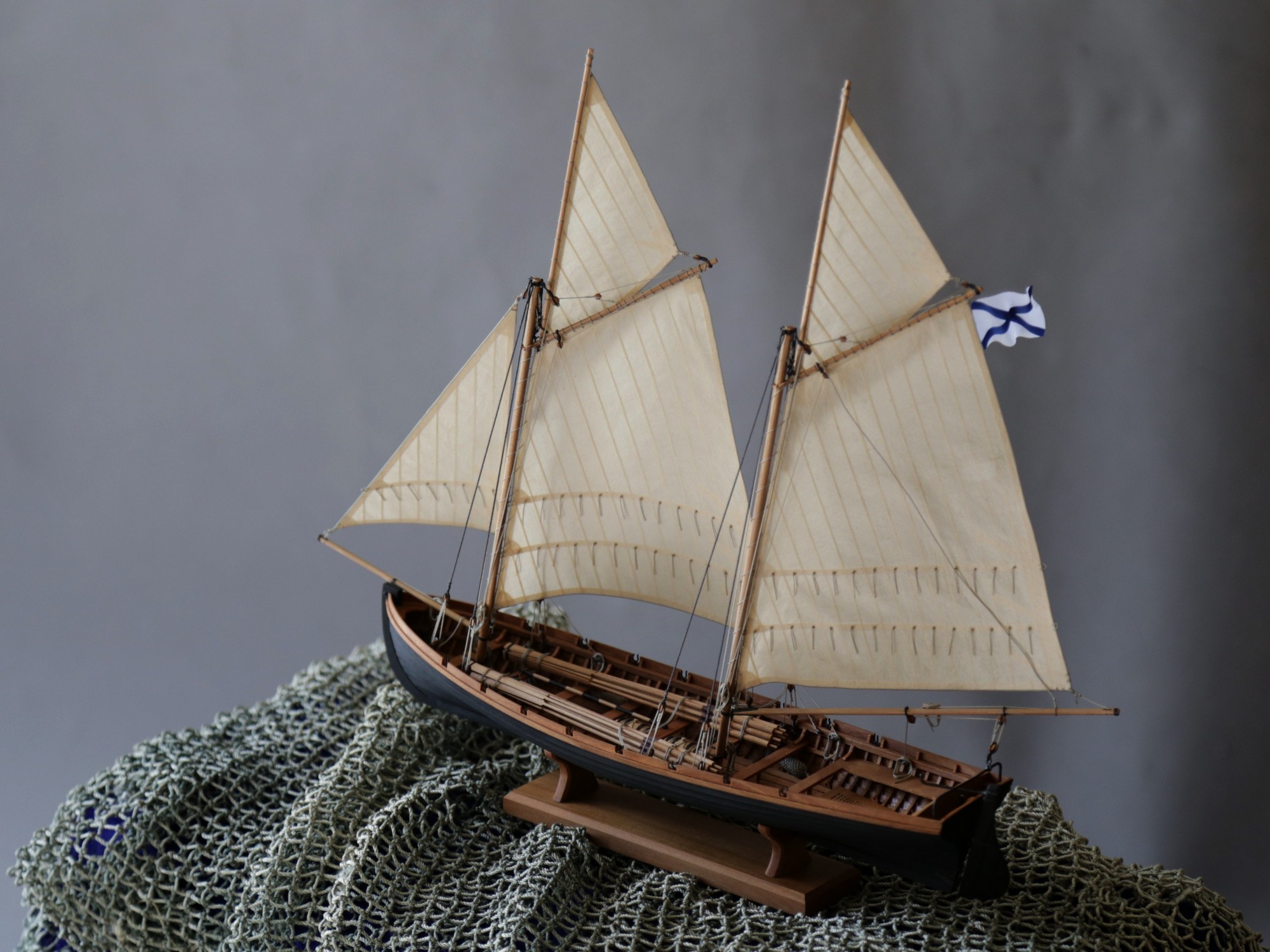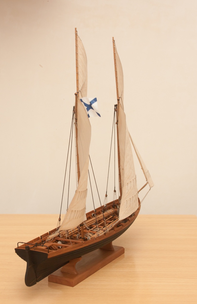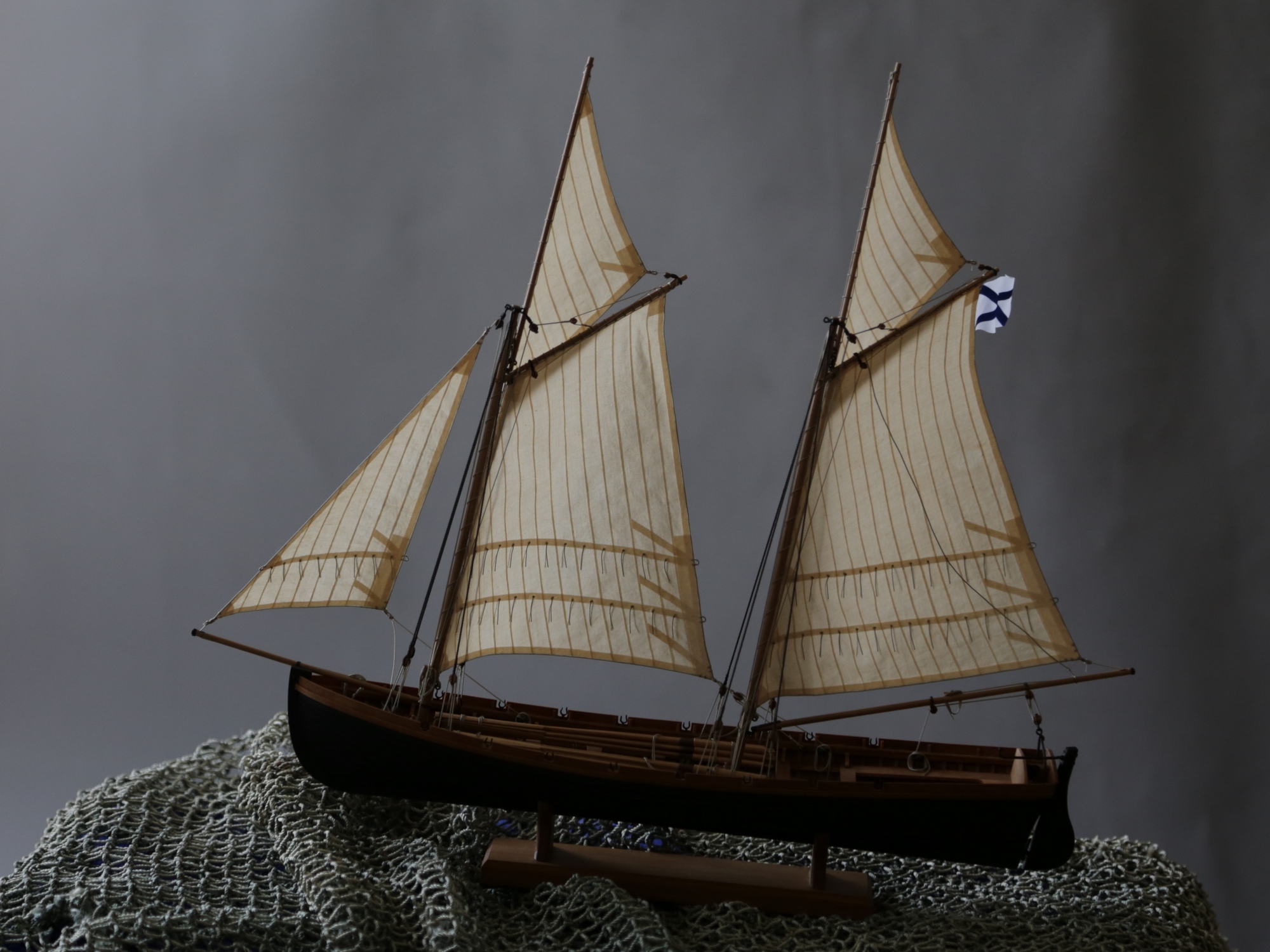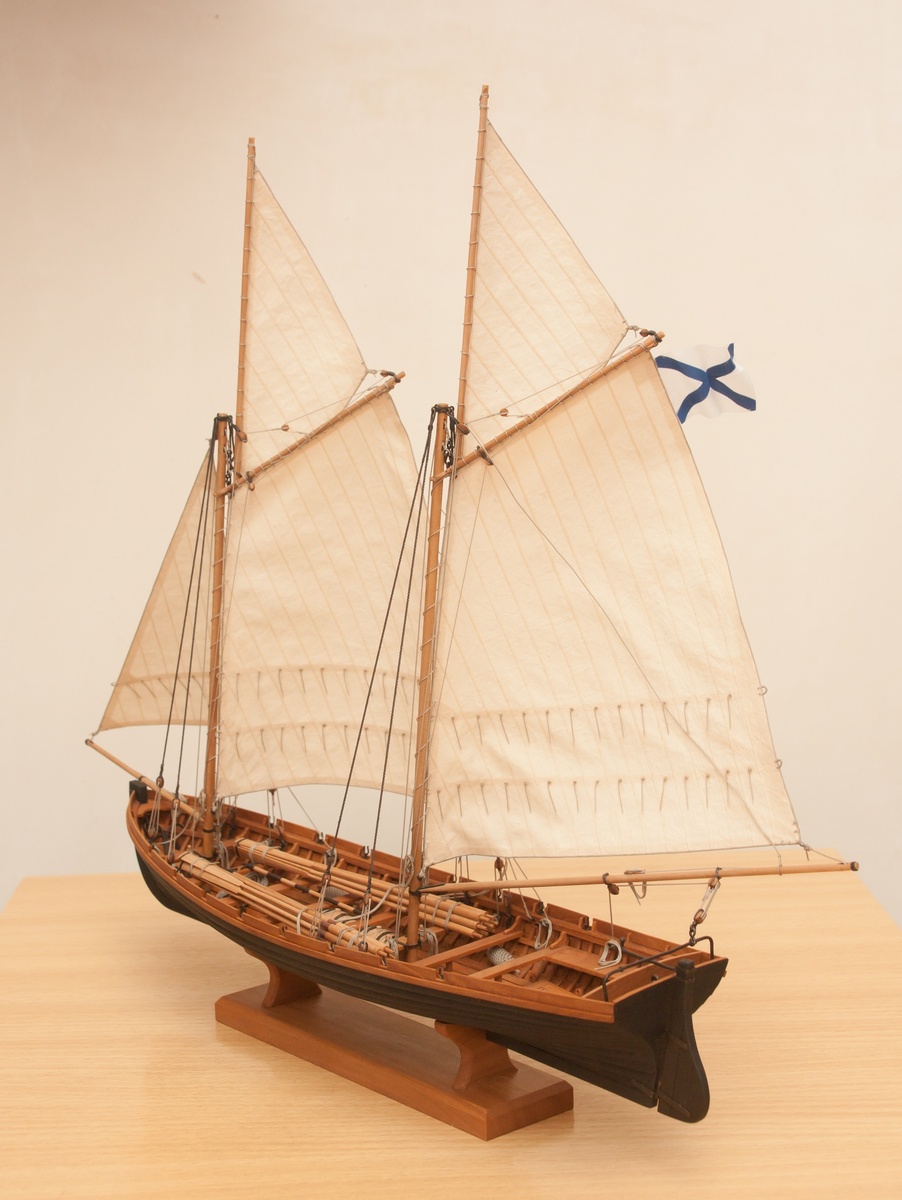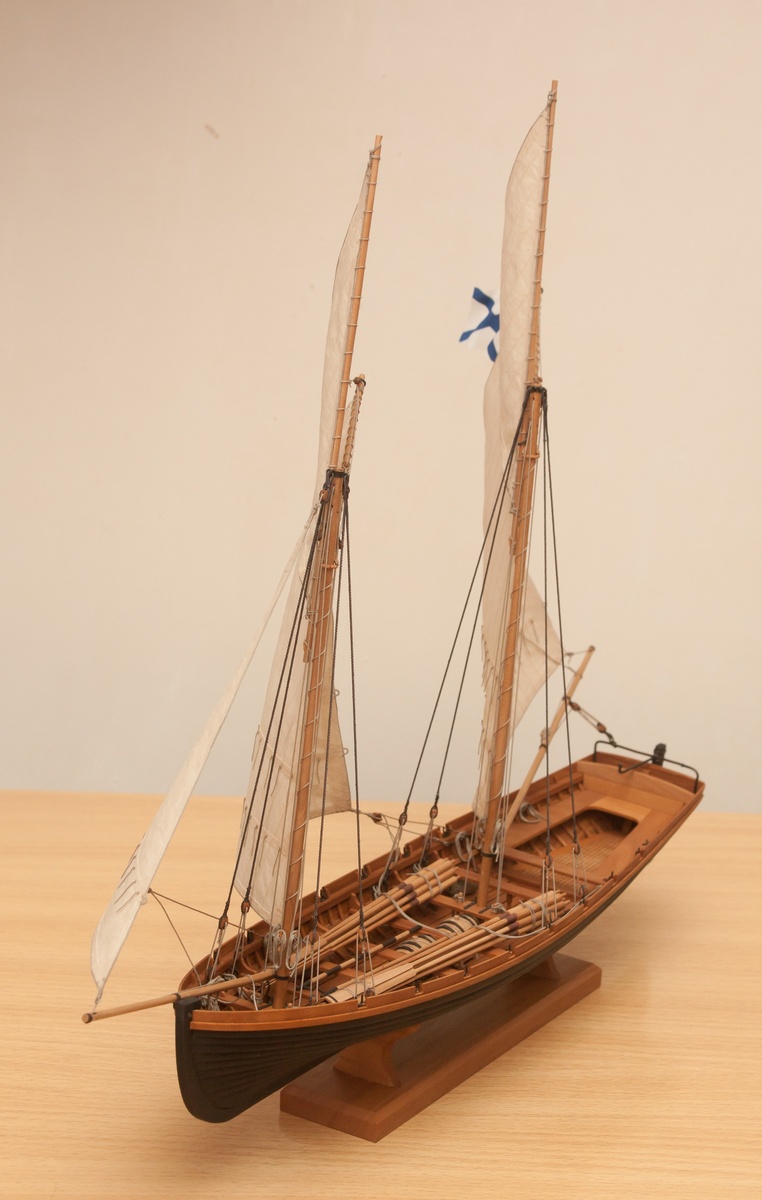 Я делаю так: Окрашиваю ткань чаем (чай мне не очень нравится, иногда идет пятнами), затем разведенным водой ПВА пропитываю и сушу на веревочке. Должно получиться довольно жестко, чтобы резалось острым ножом и не задиралось. Жесткость регулируется количеством ПВА. Далее режу на полосы нужной ширины, желательно их не перемешивать, я нумерую. Склеиваю внахлест нитроцеллюлозным клеем АК-20. Тут нужно приноровиться, чтобы шов был одинаковой ширины, желательно в масштабе и лишнего клея не налить, т.к. получатся неприятные пятна. Это можно делать на стекле с подсветкой, например, или держа в руках на просвет. После на получившемся полотнище размечаю парус, приклеиваю нитроцеллюлозным клеем накладки по той шкаторине которая крепится к рангоуту. На простейшей рамке Закрепляю парус прижимая по нашивке рейкой, и по шкотовым углам на гвоздики, и намочив парус разведенным ПВА надуваю с помощью подушки из сложенного полотенца в полиэтиленовом пакете и фена. Тут тоже нужно приноровиться, нитроцеллюлозный клей не растворяется водой, по-этому швы не разойдутся если хорошо проклеены и не давить слишком сильно. Потом вырезаю парус и наклеиваю на него все нашивки. Для этого лучше заранее тоненько карандашиком нанести всю разметку, т.к. после выдувания это сделать сложнее. Ликтрос приклеиваю цианокрилатным клеем. После установки паруса его можно подправлять намочив и просушив феном. Как-то так....Oziris писал(а):Можете описать этапы (пропитка ткани, склейка и "надувание")