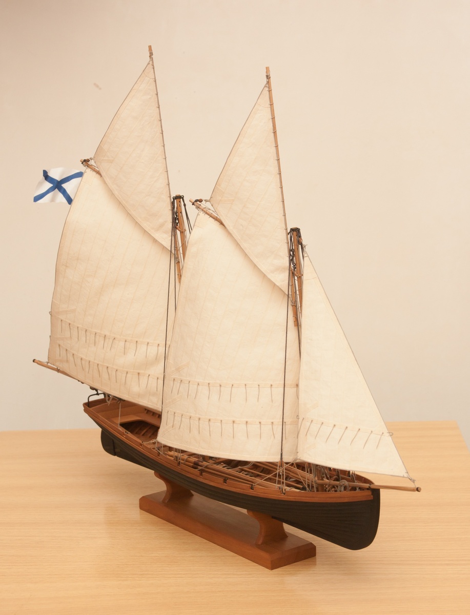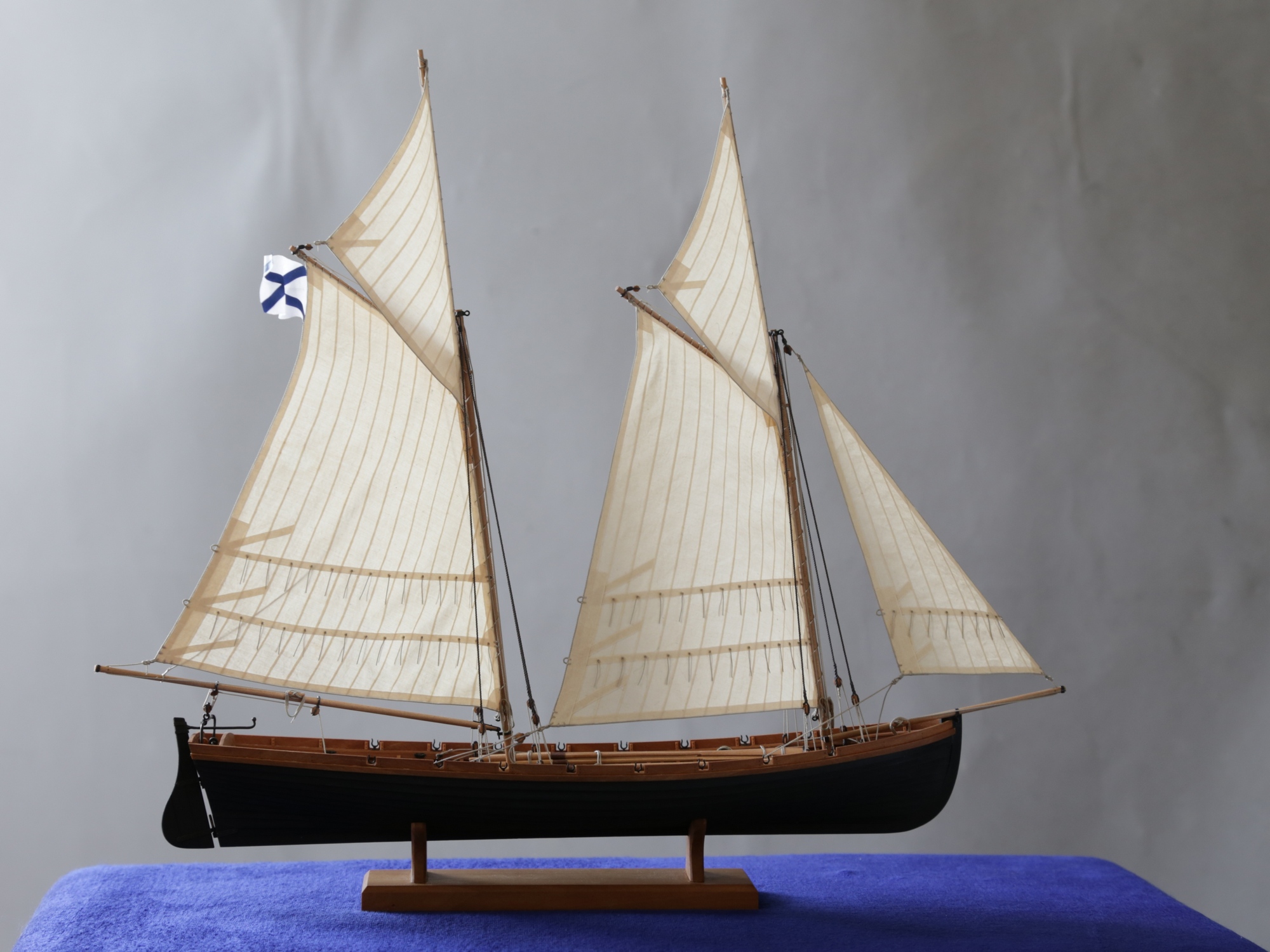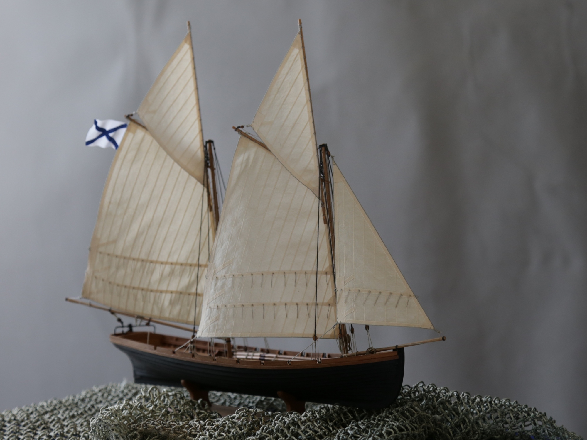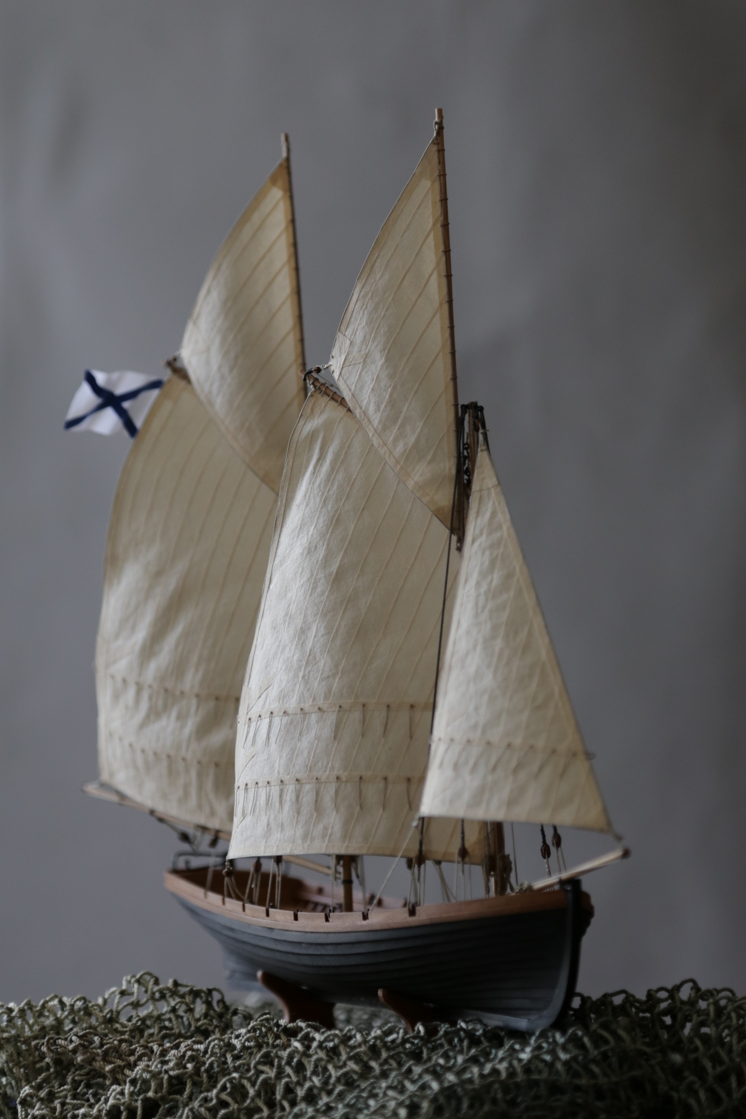 Я делаю так: Окрашиваю ткань чаем (чай мне не очень нравится, иногда идет пятнами), затем разведенным водой ПВА пропитываю и сушу на веревочке. Должно получиться довольно жестко, чтобы резалось острым ножом и не задиралось. Жесткость регулируется количеством ПВА. Далее режу на полосы нужной ширины, желательно их не перемешивать, я нумерую. Склеиваю внахлест нитроцеллюлозным клеем АК-20. Тут нужно приноровиться, чтобы шов был одинаковой ширины, желательно в масштабе и лишнего клея не налить, т.к. получатся неприятные пятна. Это можно делать на стекле с подсветкой, например, или держа в руках на просвет. После на получившемся полотнище размечаю парус, приклеиваю нитроцеллюлозным клеем накладки по той шкаторине которая крепится к рангоуту. На простейшей рамке Закрепляю парус прижимая по нашивке рейкой, и по шкотовым углам на гвоздики, и намочив парус разведенным ПВА надуваю с помощью подушки из сложенного полотенца в полиэтиленовом пакете и фена. Тут тоже нужно приноровиться, нитроцеллюлозный клей не растворяется водой, по-этому швы не разойдутся если хорошо проклеены и не давить слишком сильно. Потом вырезаю парус и наклеиваю на него все нашивки. Для этого лучше заранее тоненько карандашиком нанести всю разметку, т.к. после выдувания это сделать сложнее. Ликтрос приклеиваю цианокрилатным клеем. После установки паруса его можно подправлять намочив и просушив феном. Как-то так....Oziris писал(а):Можете описать этапы (пропитка ткани, склейка и "надувание")