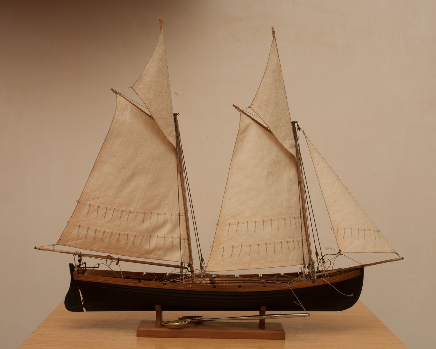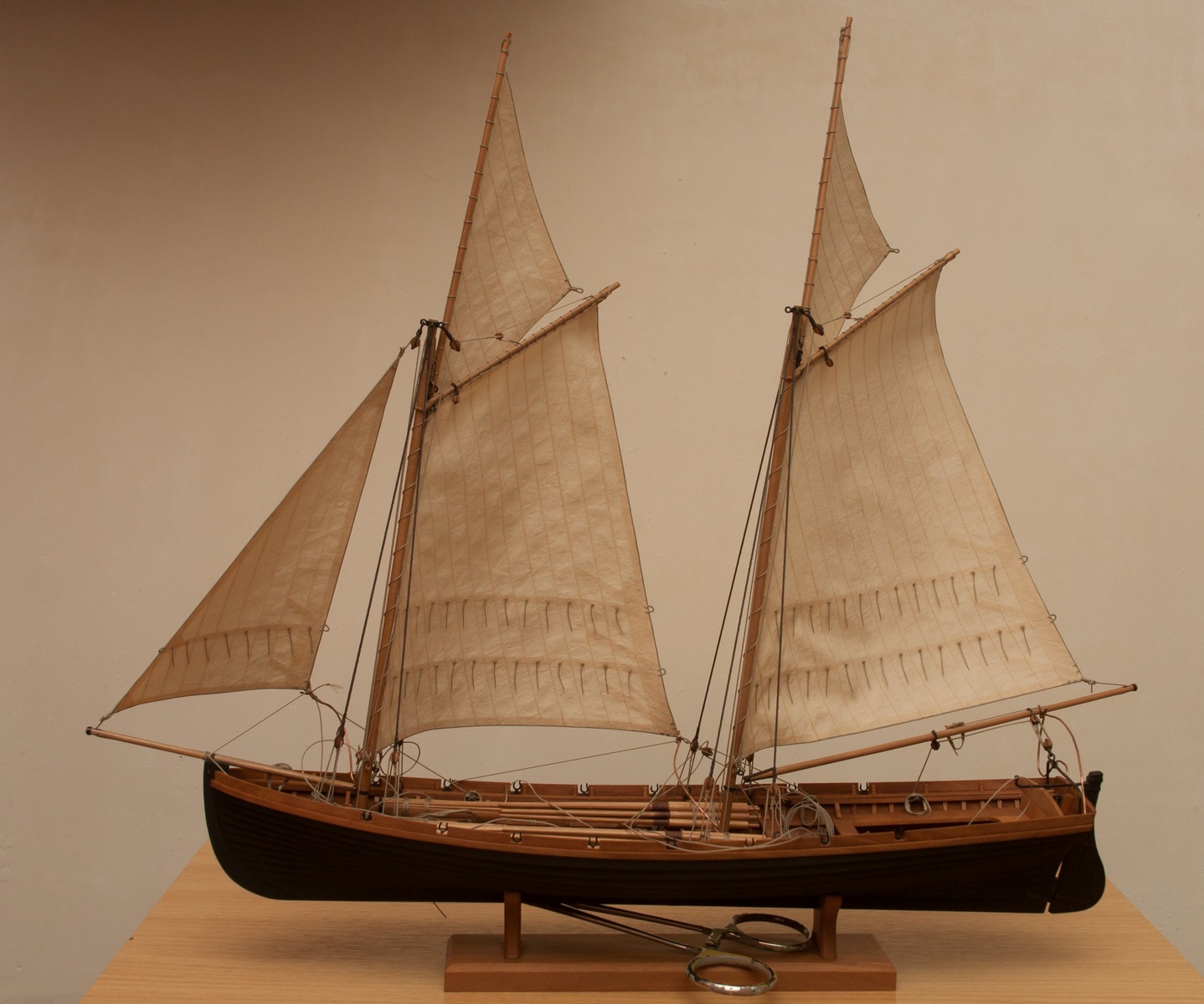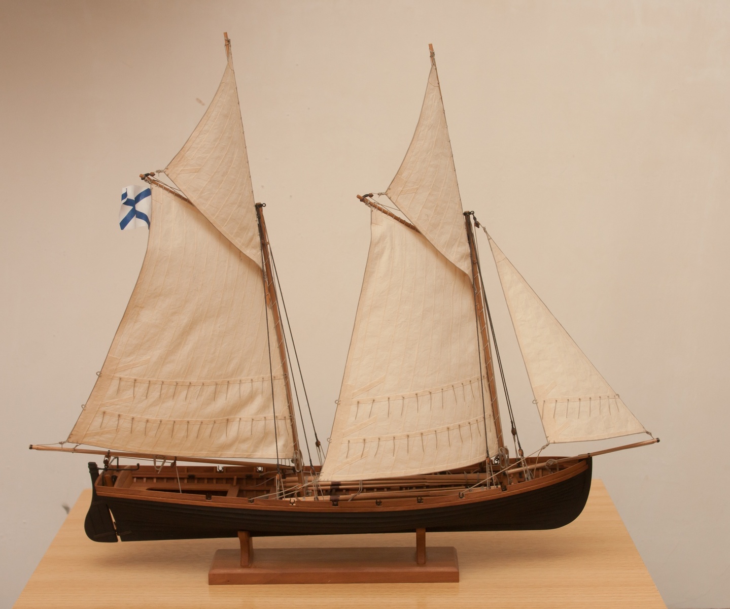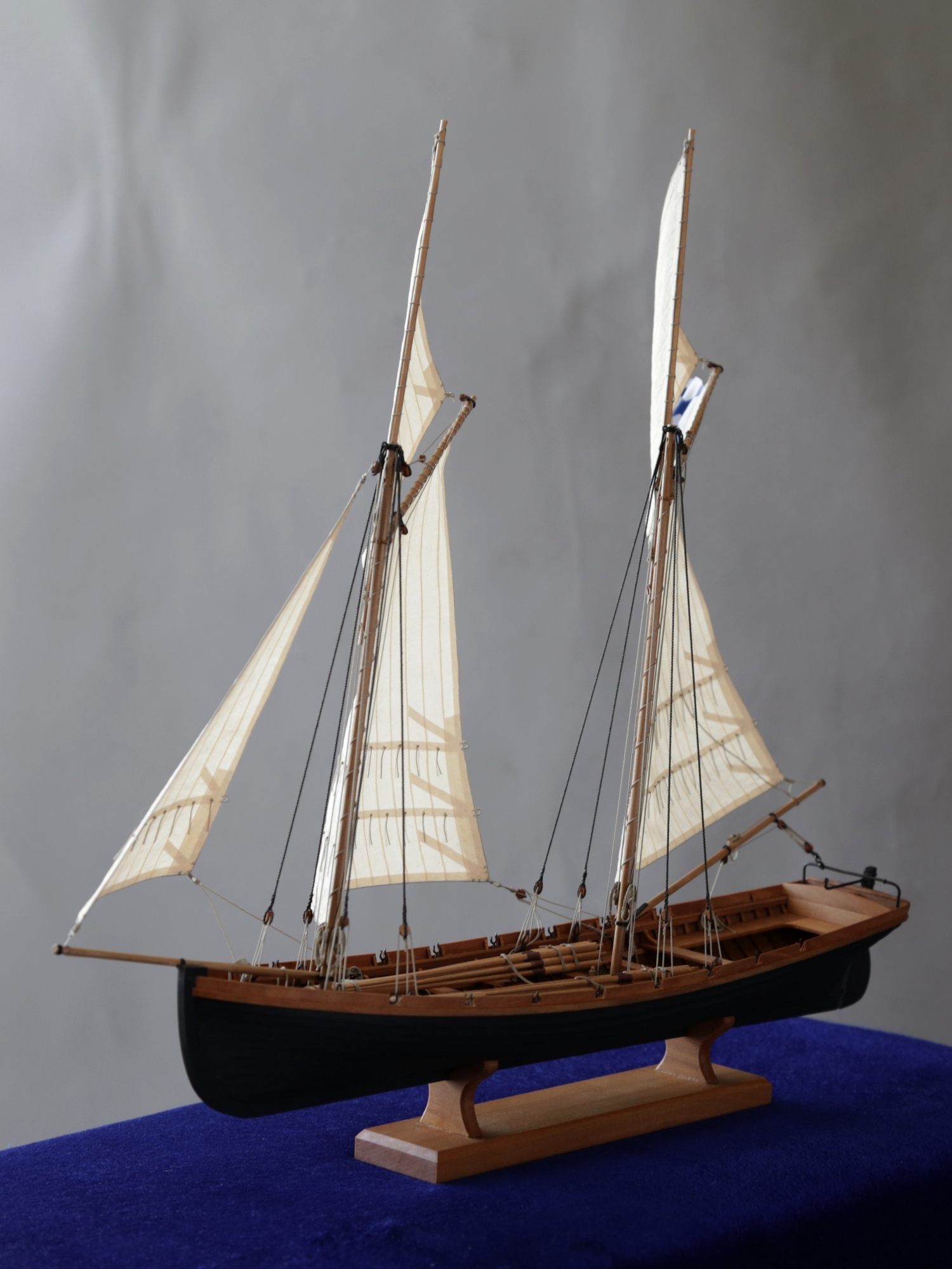 Я делаю так: Окрашиваю ткань чаем (чай мне не очень нравится, иногда идет пятнами), затем разведенным водой ПВА пропитываю и сушу на веревочке. Должно получиться довольно жестко, чтобы резалось острым ножом и не задиралось. Жесткость регулируется количеством ПВА. Далее режу на полосы нужной ширины, желательно их не перемешивать, я нумерую. Склеиваю внахлест нитроцеллюлозным клеем АК-20. Тут нужно приноровиться, чтобы шов был одинаковой ширины, желательно в масштабе и лишнего клея не налить, т.к. получатся неприятные пятна. Это можно делать на стекле с подсветкой, например, или держа в руках на просвет. После на получившемся полотнище размечаю парус, приклеиваю нитроцеллюлозным клеем накладки по той шкаторине которая крепится к рангоуту. На простейшей рамке Закрепляю парус прижимая по нашивке рейкой, и по шкотовым углам на гвоздики, и намочив парус разведенным ПВА надуваю с помощью подушки из сложенного полотенца в полиэтиленовом пакете и фена. Тут тоже нужно приноровиться, нитроцеллюлозный клей не растворяется водой, по-этому швы не разойдутся если хорошо проклеены и не давить слишком сильно. Потом вырезаю парус и наклеиваю на него все нашивки. Для этого лучше заранее тоненько карандашиком нанести всю разметку, т.к. после выдувания это сделать сложнее. Ликтрос приклеиваю цианокрилатным клеем. После установки паруса его можно подправлять намочив и просушив феном. Как-то так....Oziris писал(а):Можете описать этапы (пропитка ткани, склейка и "надувание")