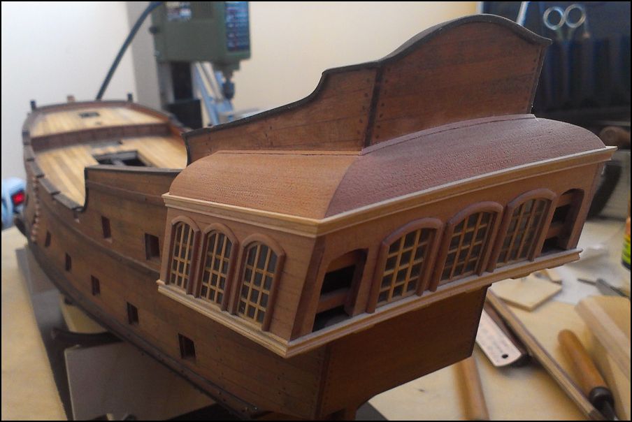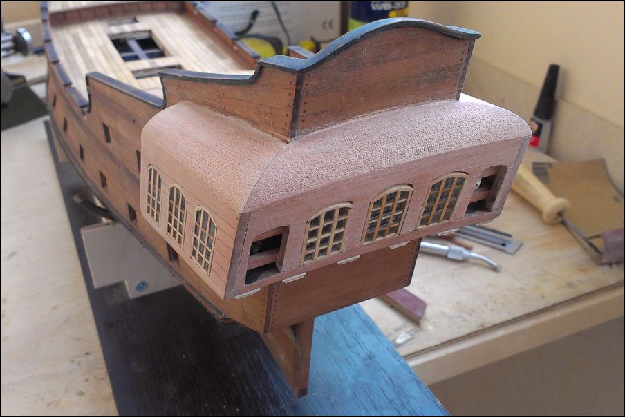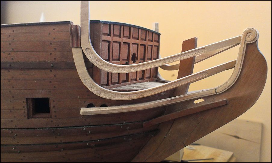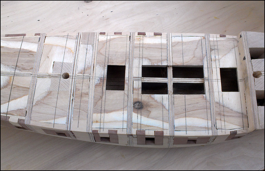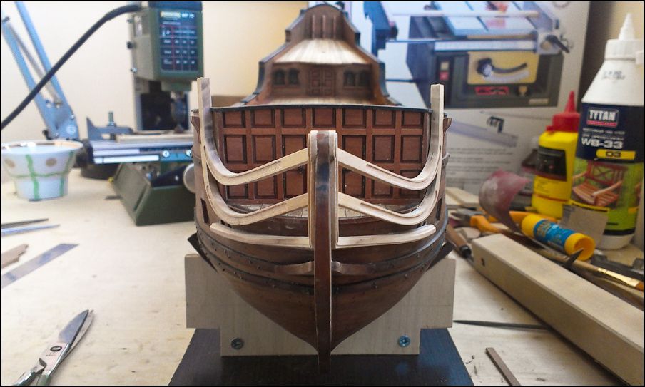 Обшивка груша. Обшивал от бархоутов вверх. Затем нижнюю часть от бархоутов вниз и от киля вверх, встретился на 5-6 поясе снизу. Подводная часть оказалась достаточно сложной - рейка по всей длине "гуляла" в ширину от 5 до 2,5 мм. На месте верхних бархоутов вклеена рейка толщиной 1 мм. На нижних - кусочки рейки, которые затем удалялись. Первый вариант показал себя лучше в плане сохранения плавности. Передняя переборка сделана целиком на фрезере.