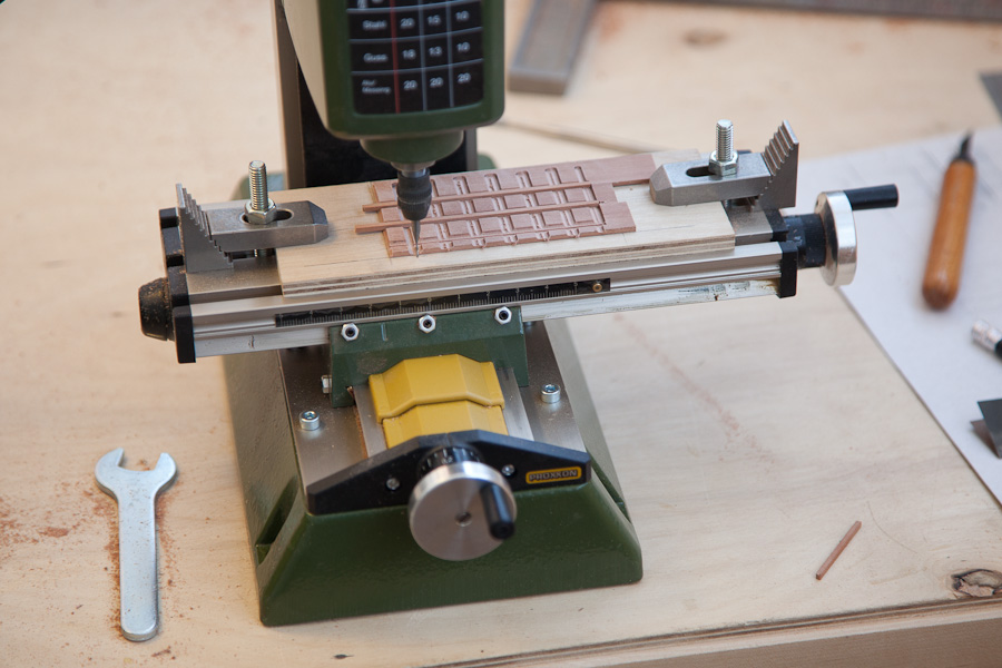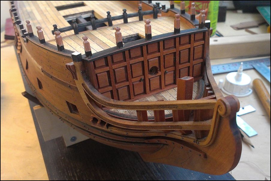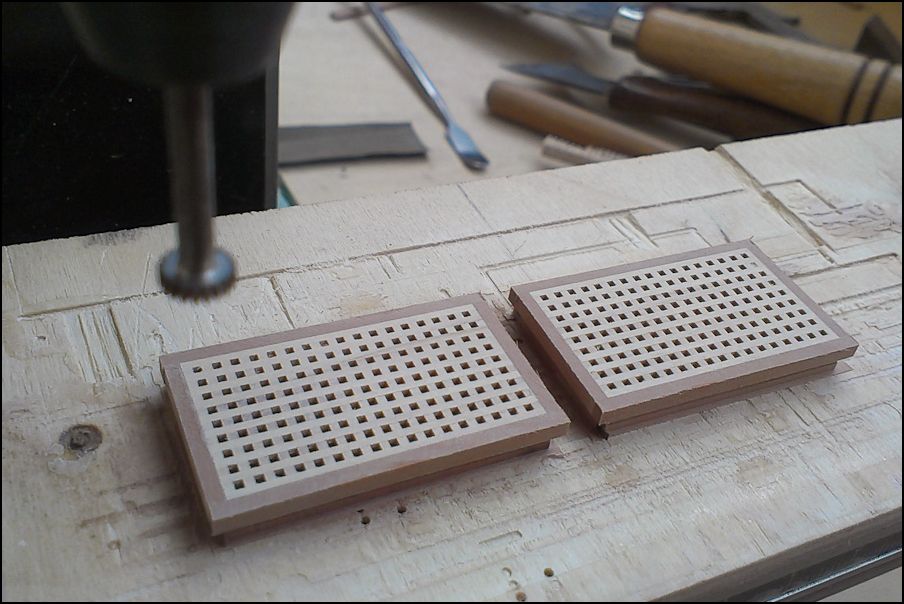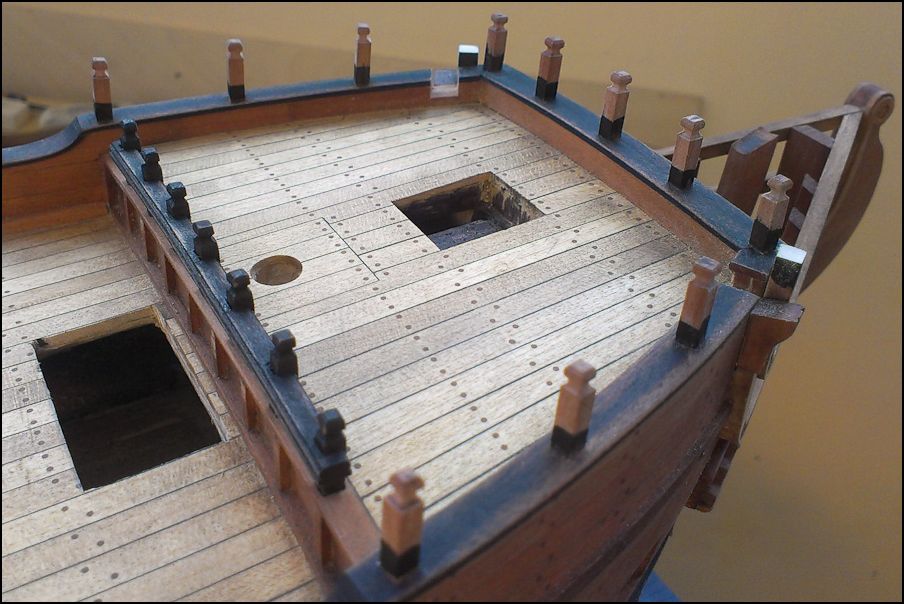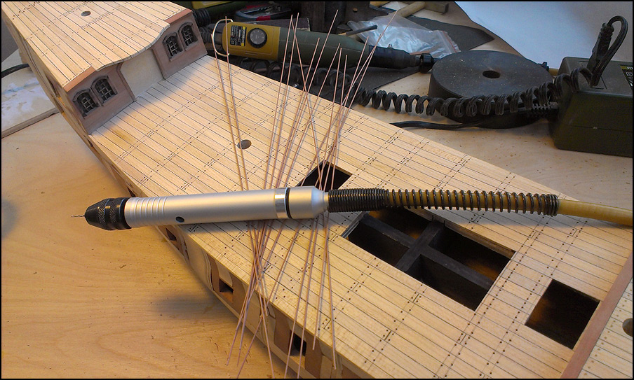 Особое веселье было с "перилами". Нет чтобы борт, планширь... Дизайнеры! Сверлим с помощью сверлильной станины вертикальные отверстия, квадратим микростамесочкой, фрезеруем рейки, гнем на утюге, кстати, оказалось, что фрезеровка практически не страдает, клеим. Ставим трапы, удаляем части бархоутов под руслени. После нанесено финишное покрытие. Как высохнет, отсниму и продолжу