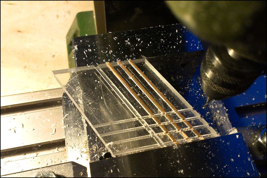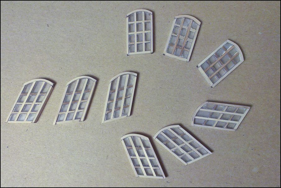 . Регели - яблоня. Окна 5 мм пластик. Поскольку оказалось, что видны внутренние грани, пришлось сгонять толщину до 2 мм на шлифовалке и затем полировать. Фигурные рейки на галерее сделаны фигурной фрезой, выточенной по совету Дмитрия Шевелева из надфиля. Фрезы показали себя прекрасно. На крыше шагрень.