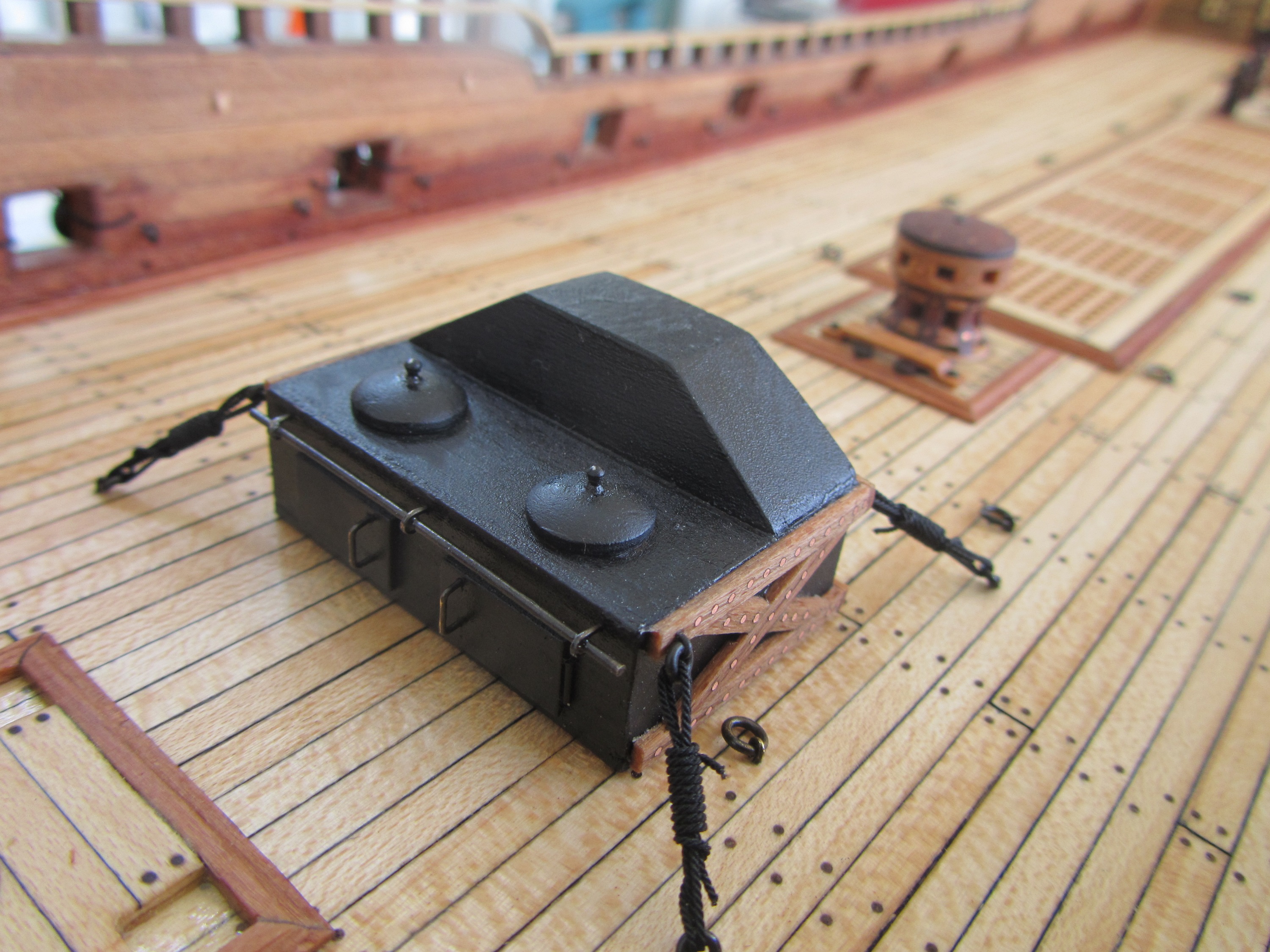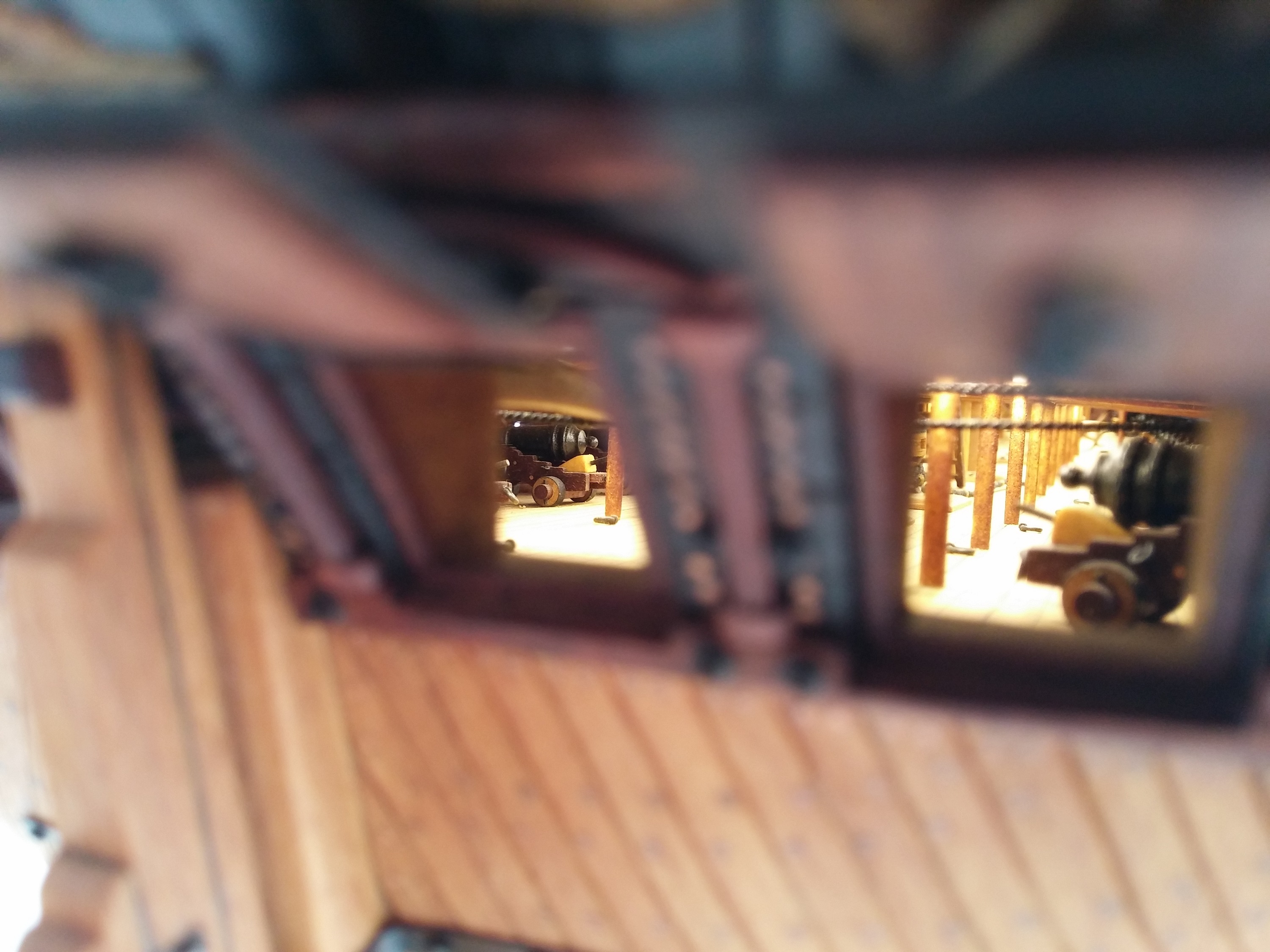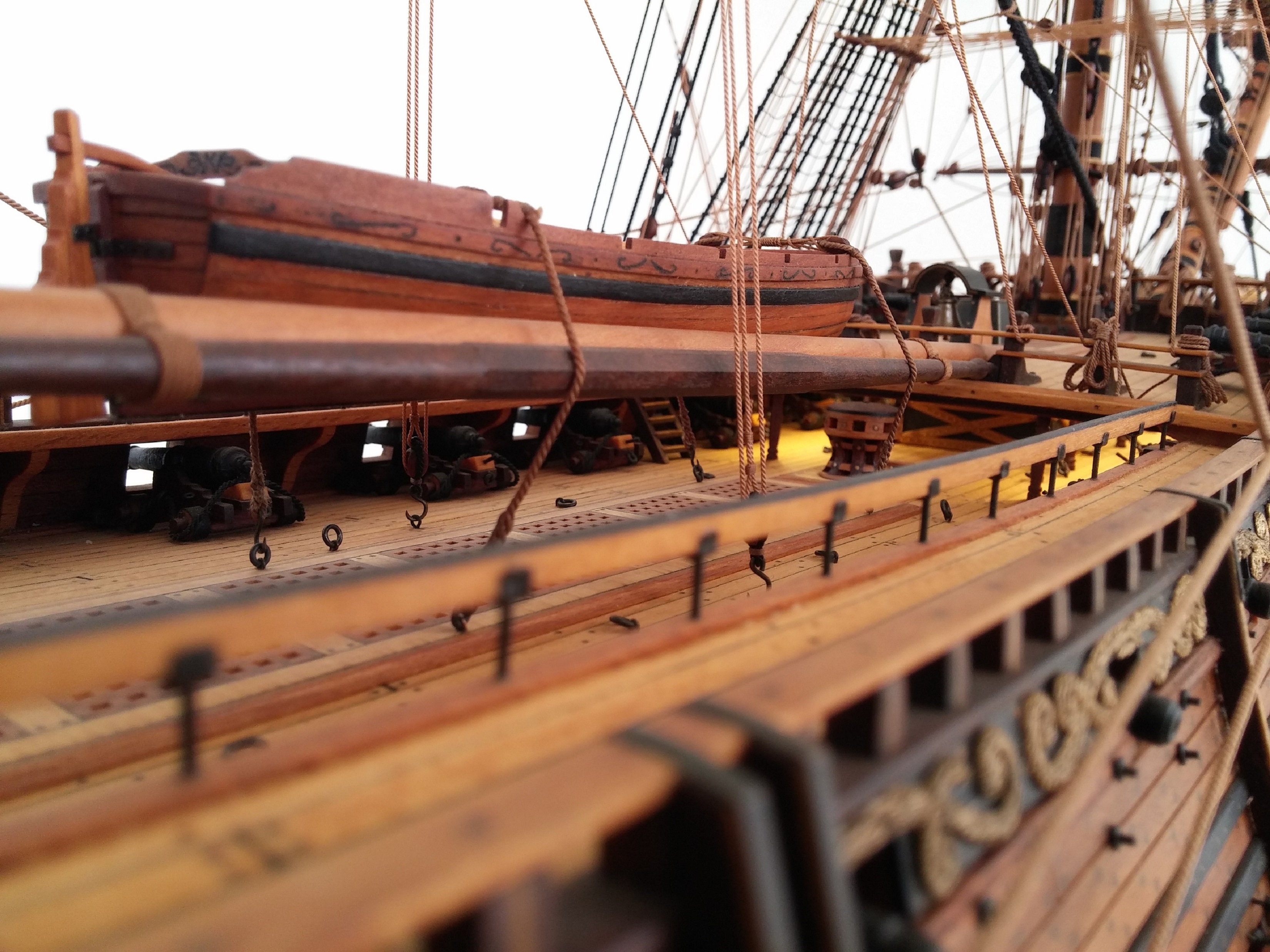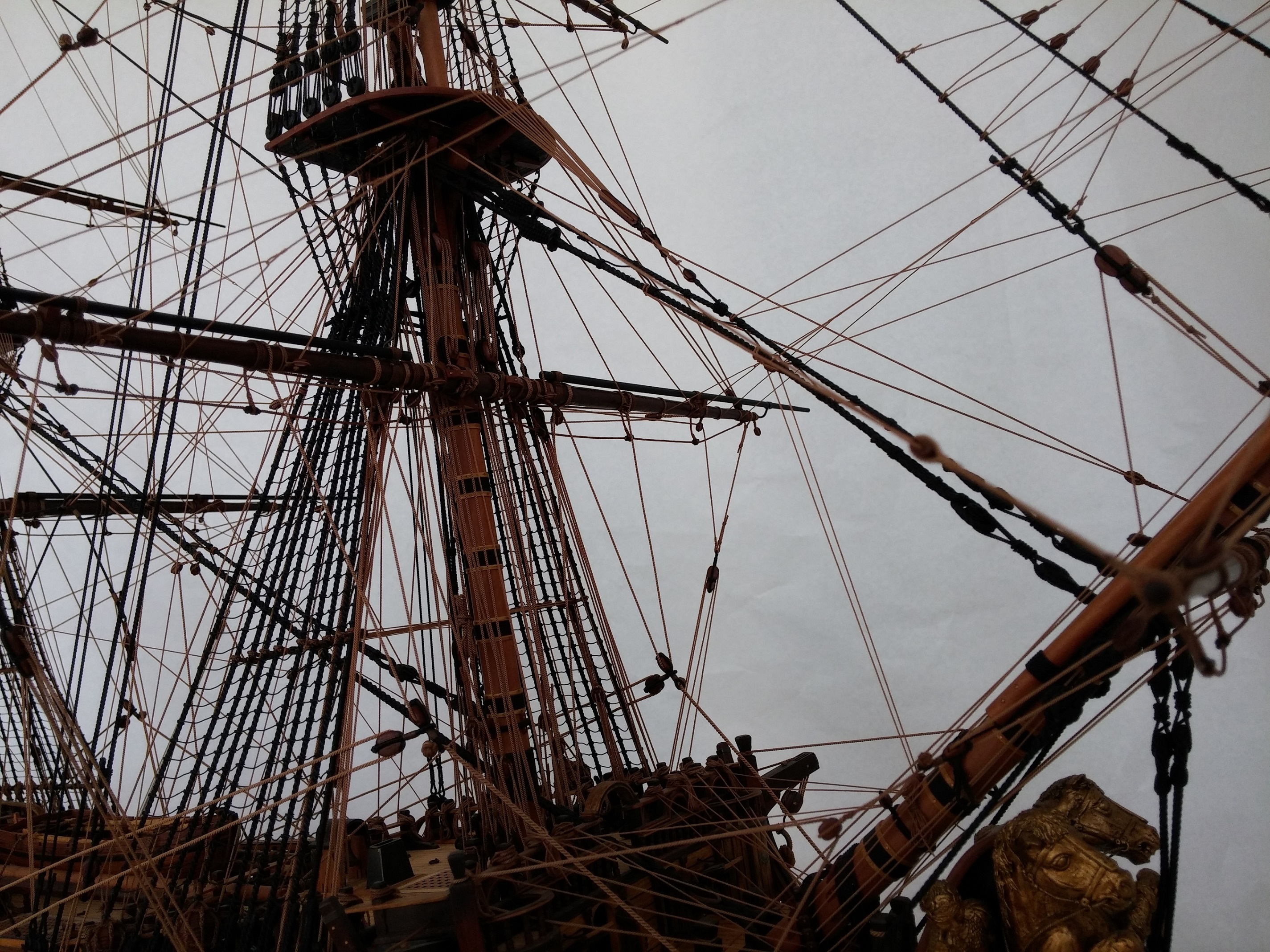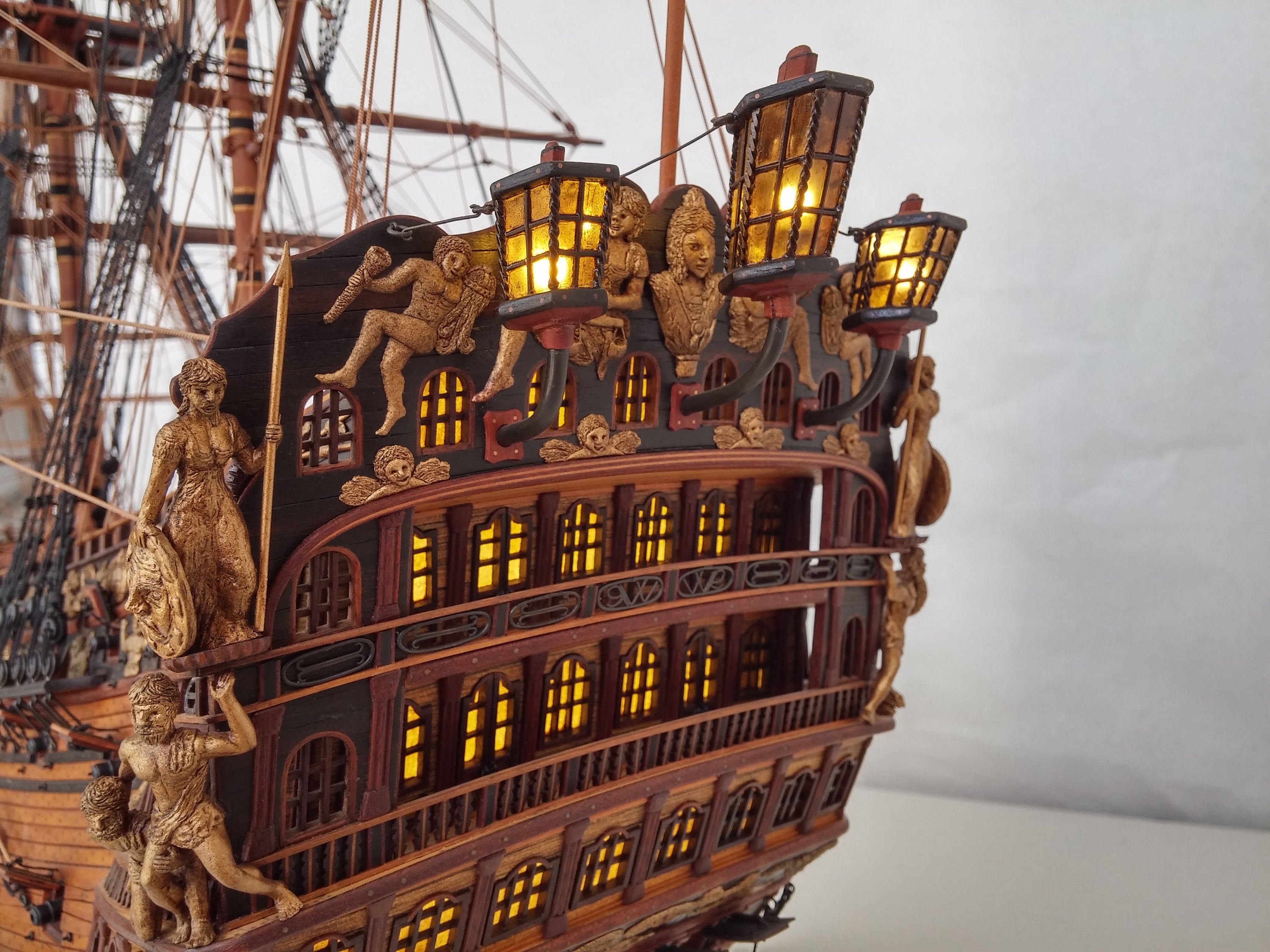 А подставка сдвинется в корму,где то на 3-и см (когда фоткал,не захотел провод внутренней подсветки вставлять в отверстие) и станет по центру ,часть ее и основная платформа, скорее всего ,будут укрыты тканью ,а на ткани ,в художественном "беспорядке" ,планирую разбросать такелаж (увеличенный в пару,тройку раз) + сплесни ,огоны ,кнопы и ,возможно ,блоки. Чтобы привлечь внимание к "канатикам" на самой модели. Думаю ,в таком "балагане", подставка затеряется и ... С самолета не увидят!